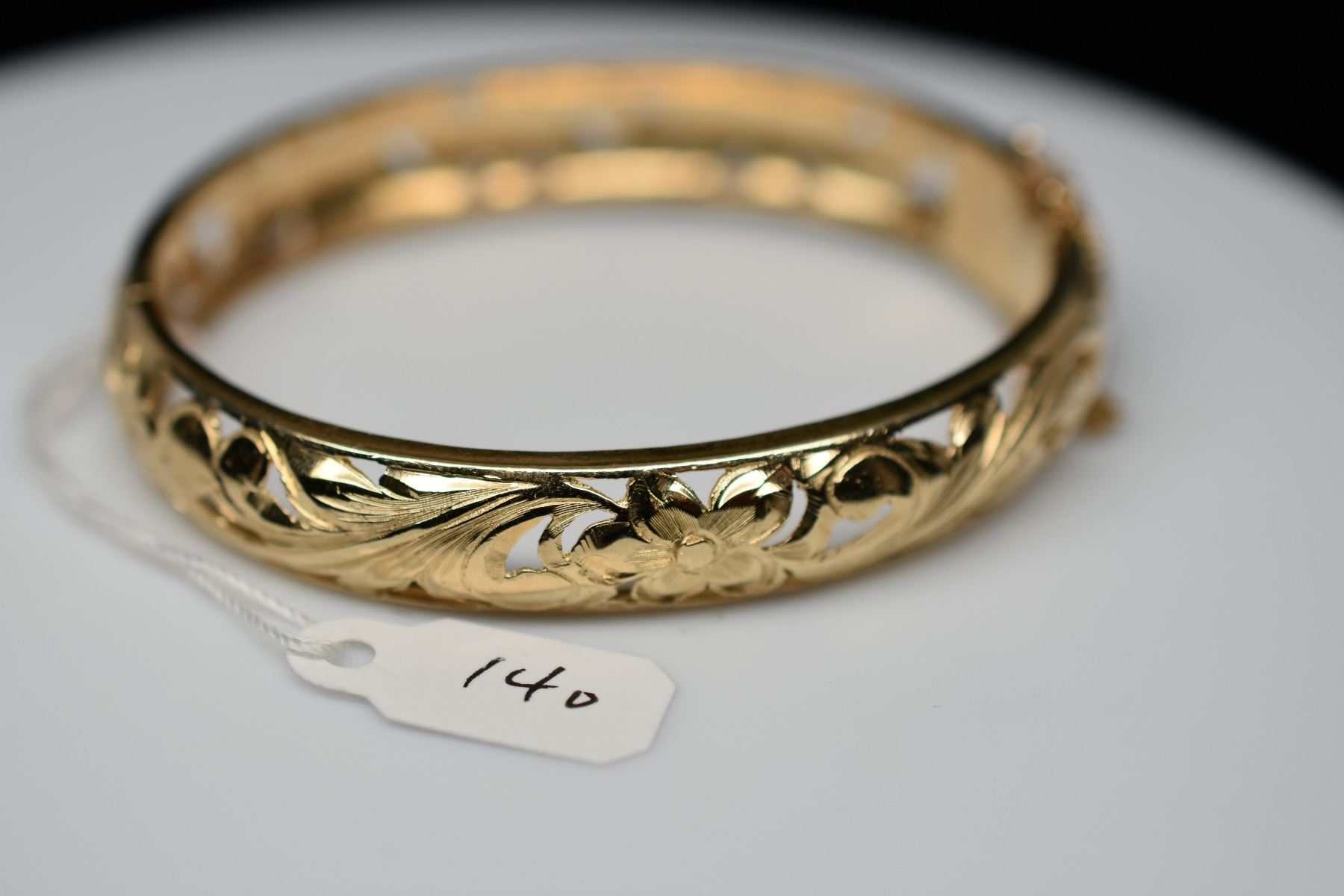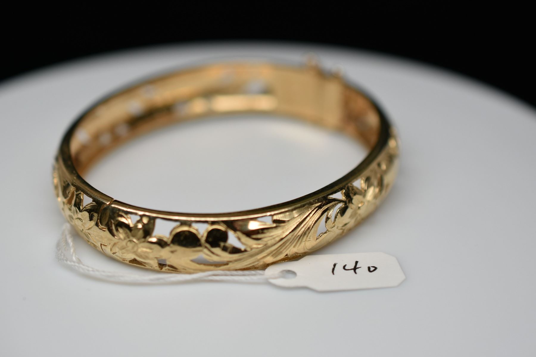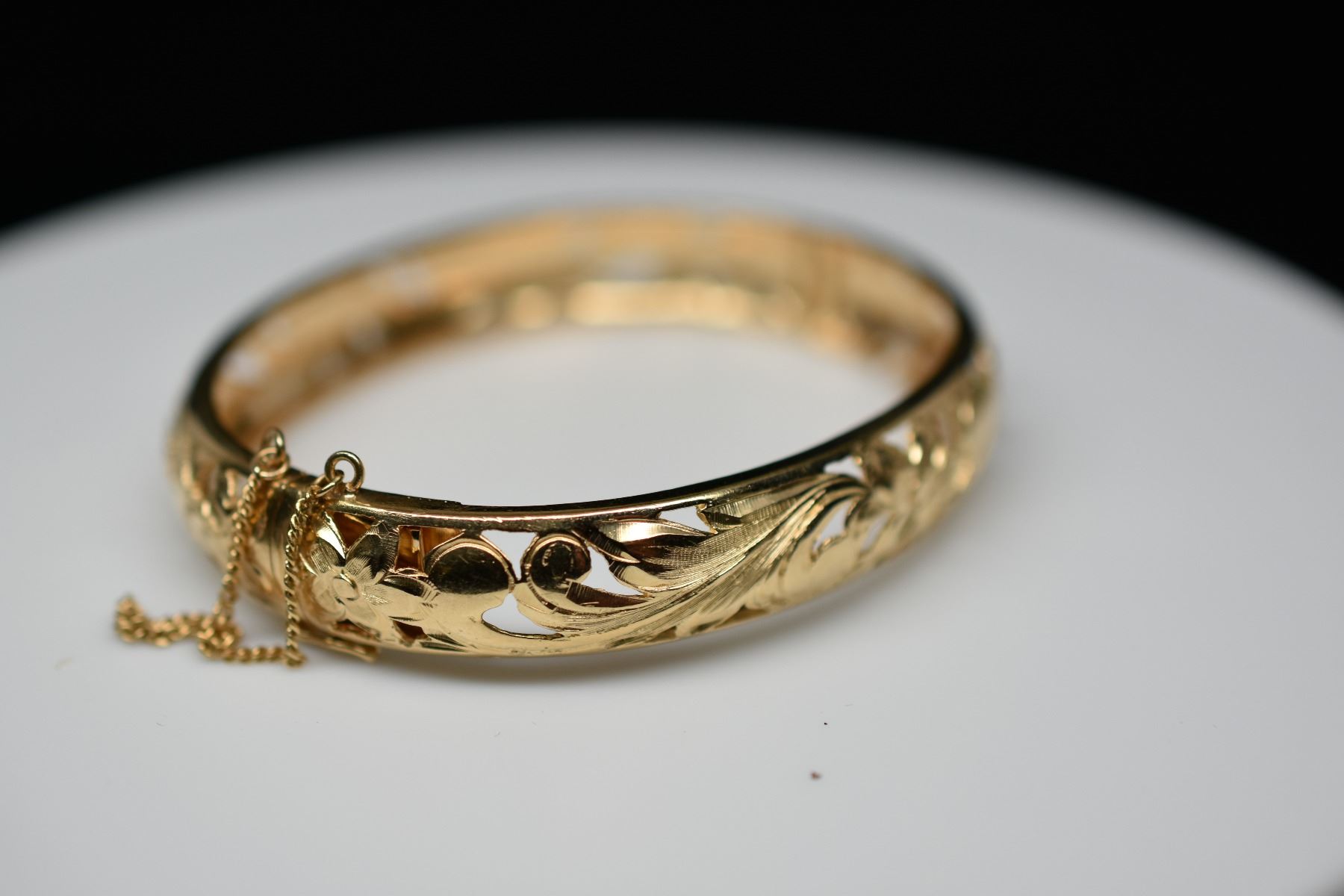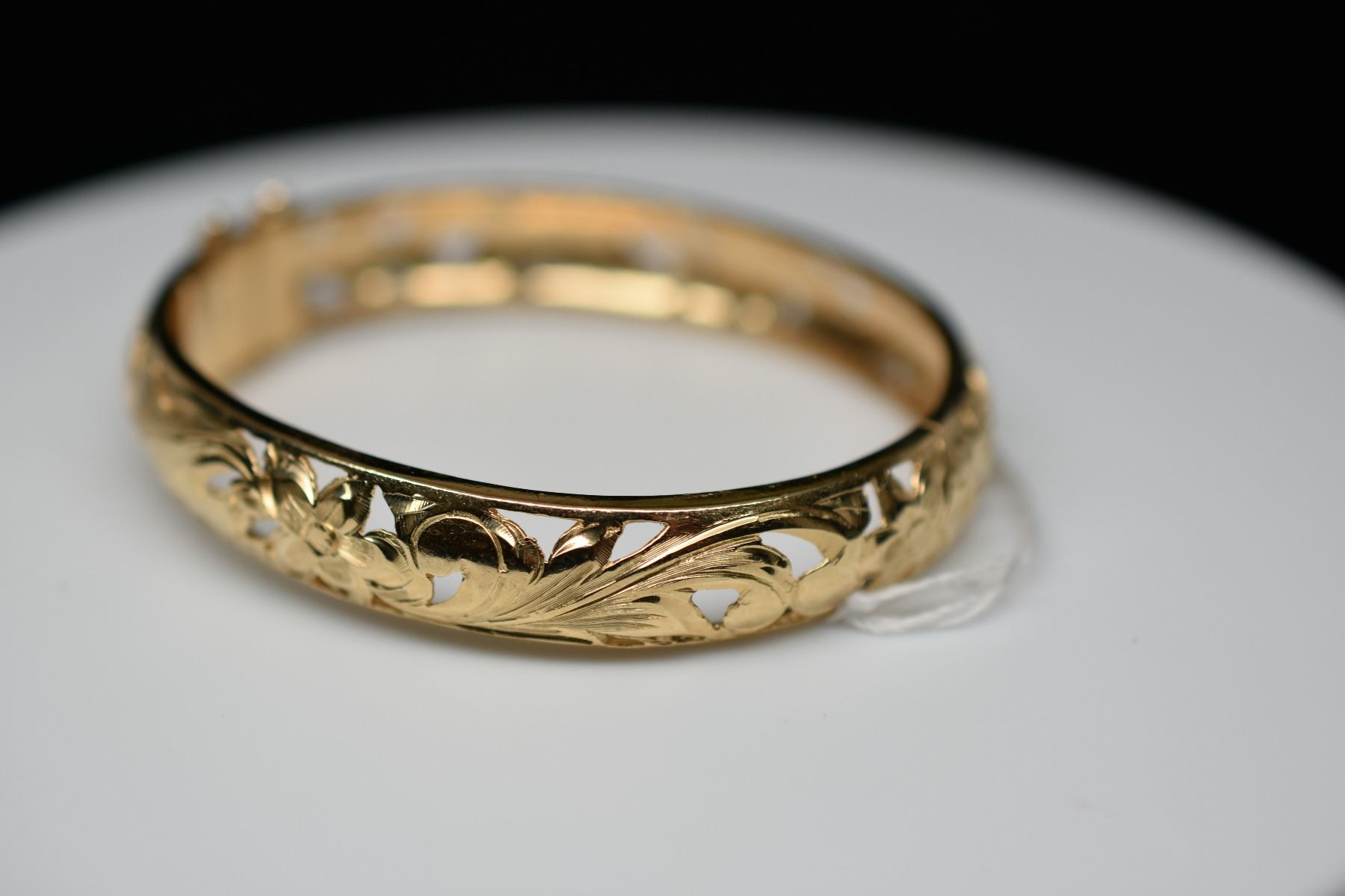 14K Gold Bangle Bracelet 10.5mm, Leaf Scroll & Floral Motifs, Hinged, 20.7 g