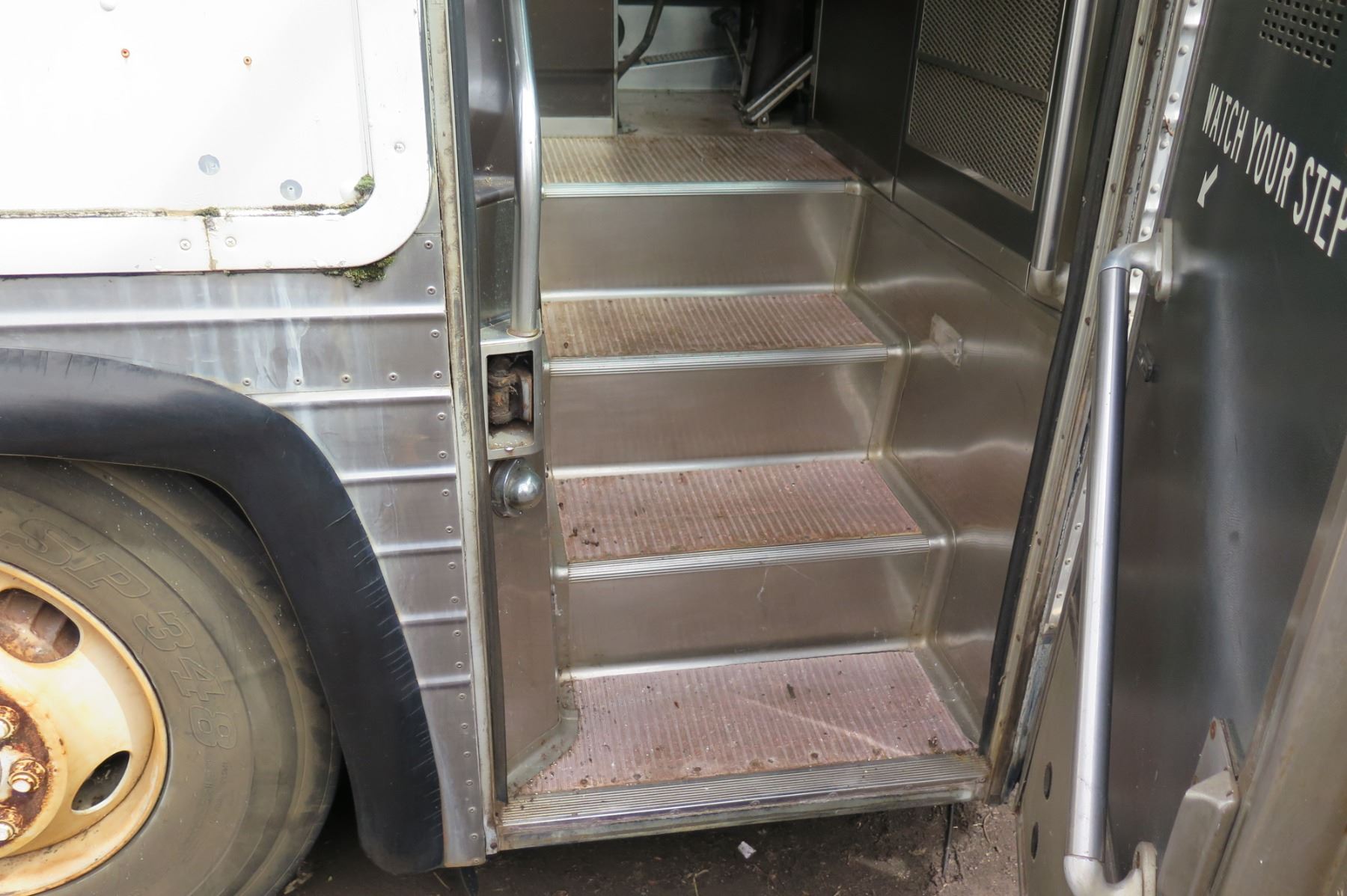 1982 MCI MC9 Coach 50+ Passenger Bus, Detroit Diesel 8V718 8-Cylinder, Allison 5-Speed Standard Transmission, 57 Seating Capacity. 7,649 Miles. Overhead luggage storage, large windows, under floor luggage storage, blind spot mirrors, vinyl seats. Stainles steel & white exterior, dual rear axles.