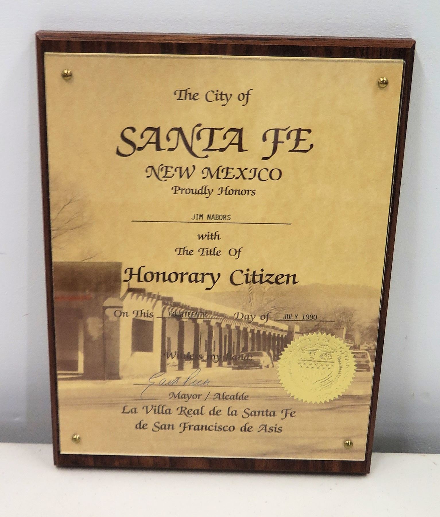 1990 Jim Nabors Santa Fe, NM 'Honorary Citizen' Designation Plaque