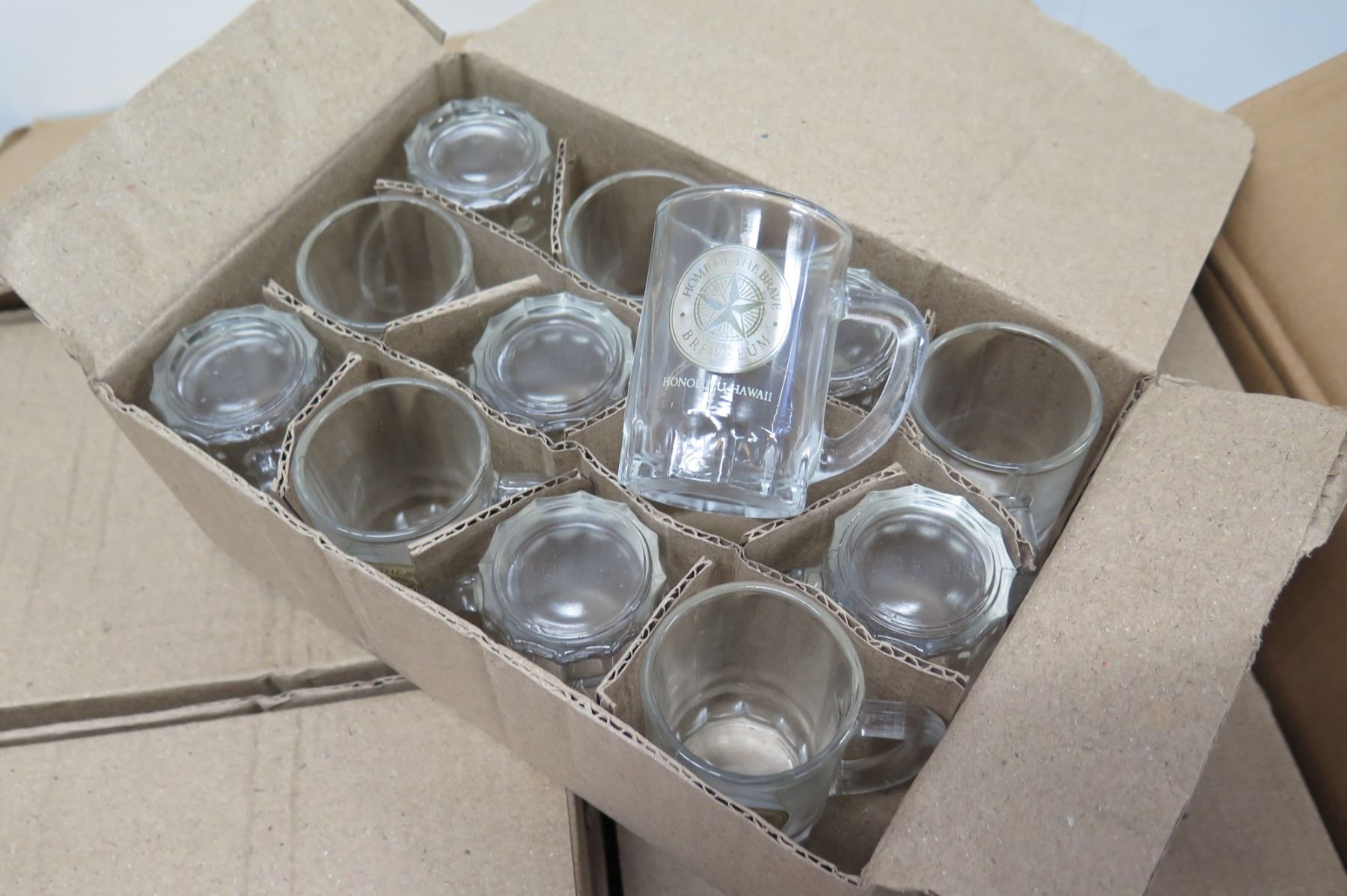 2 Boxes (qty 288) Small 'Home of the Brave Brewseum' Glass Mugs, Approx. 3" Tall