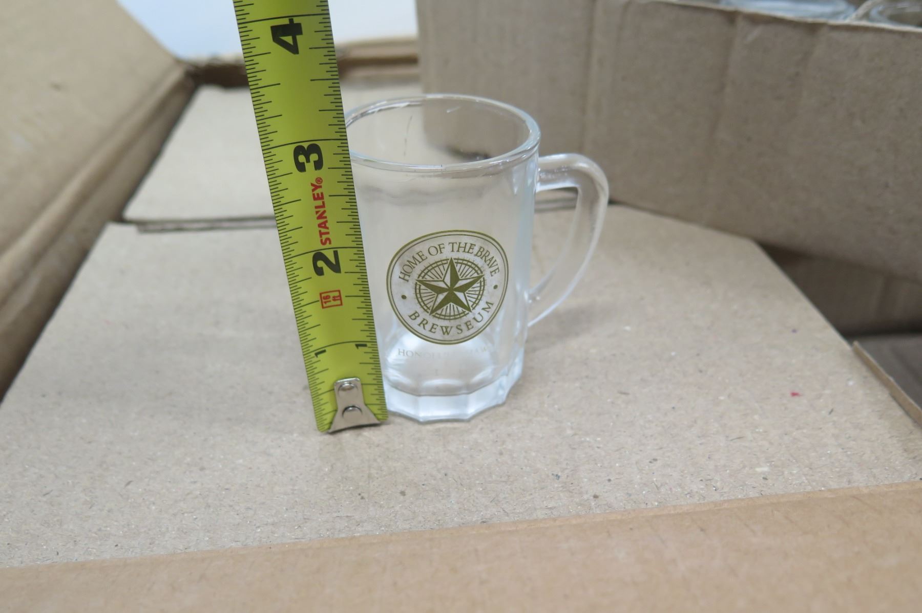 2 Boxes (qty 288) Small 'Home of the Brave Brewseum' Glass Mugs, Approx. 3" Tall