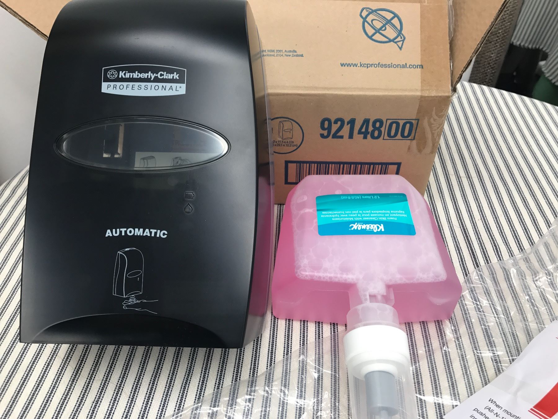 2 New Kimberly Clark Automatic Wall-Mount Soap Dispensers with 2 Kleenix Soap Fills (Inserts)