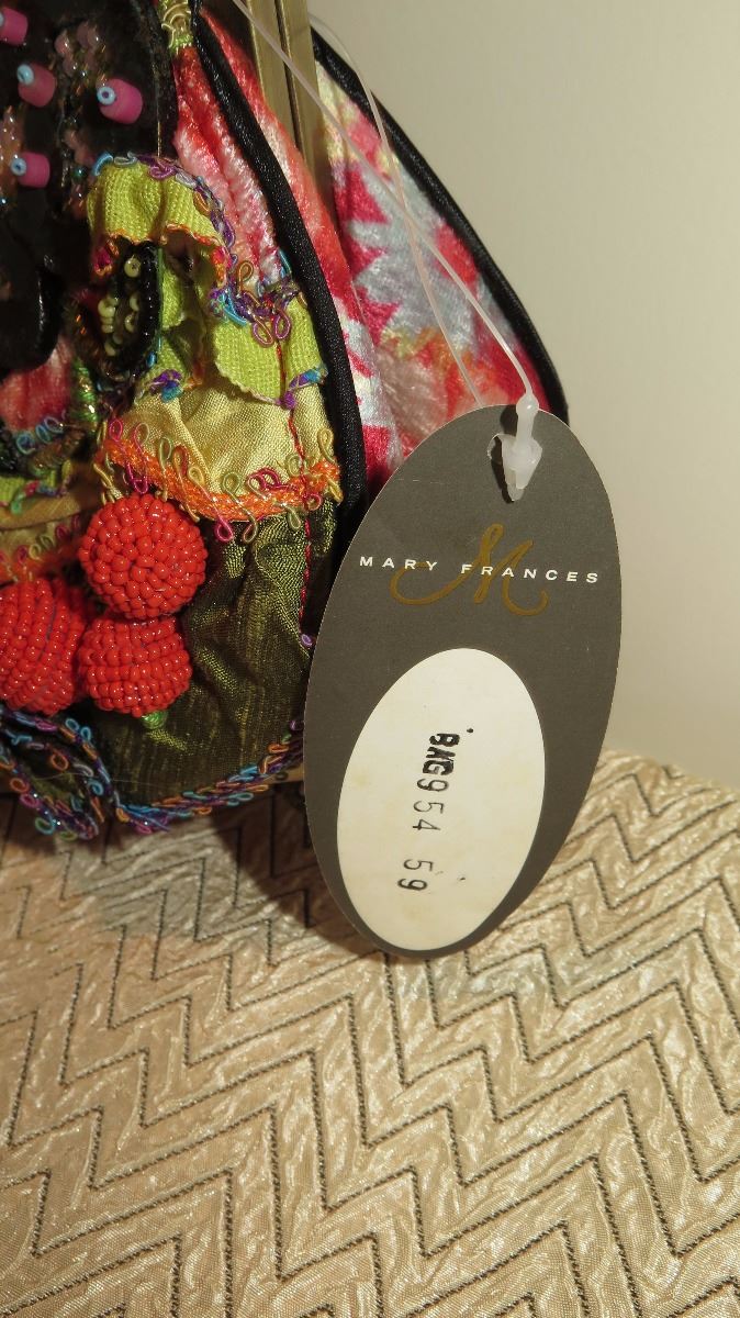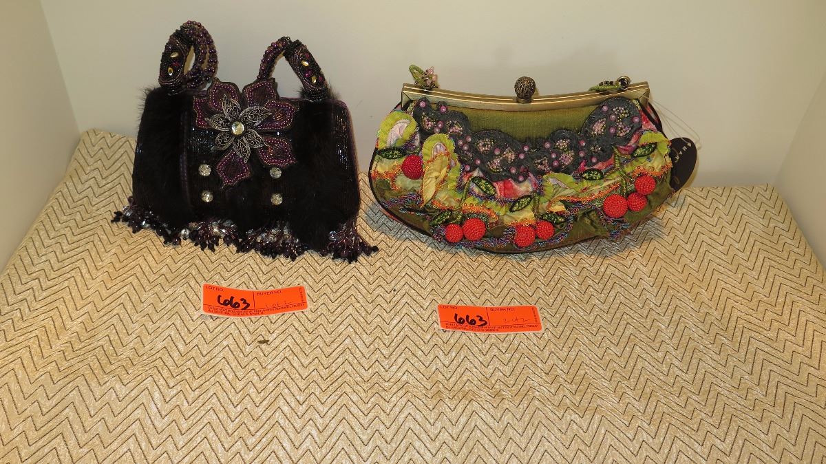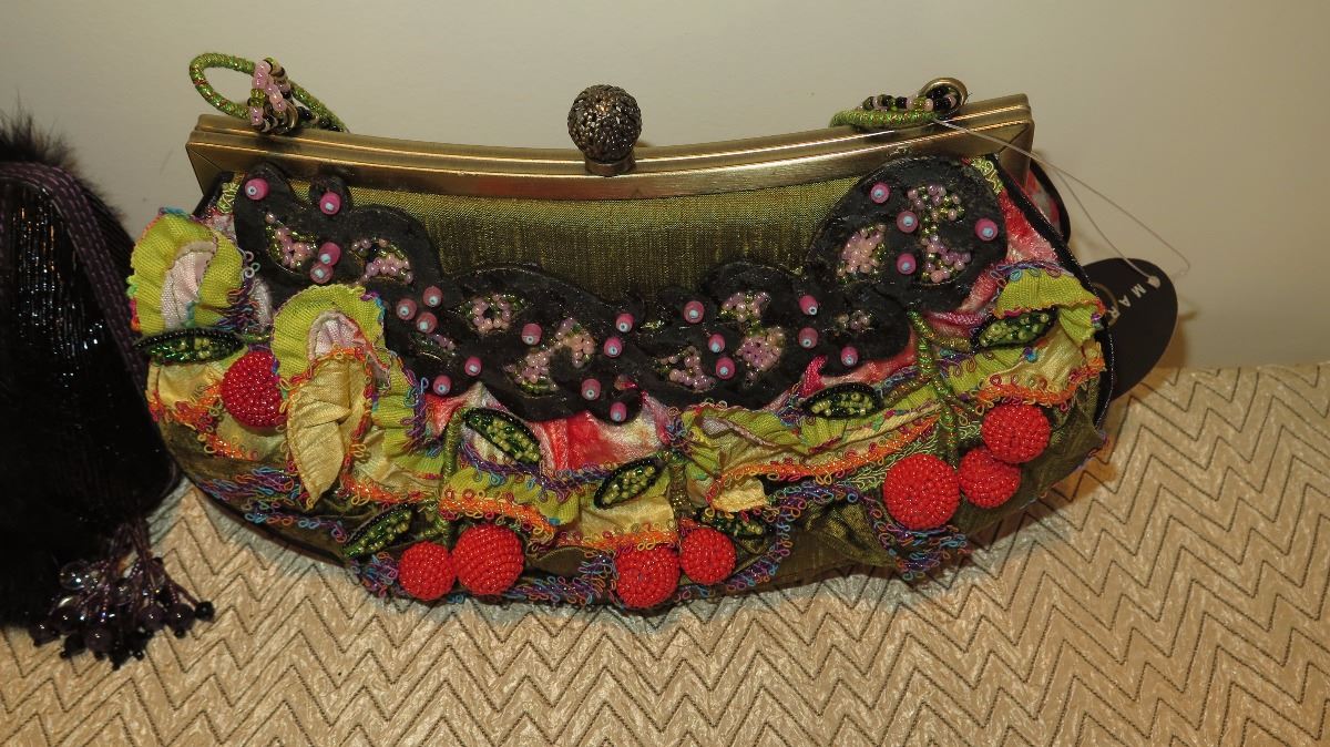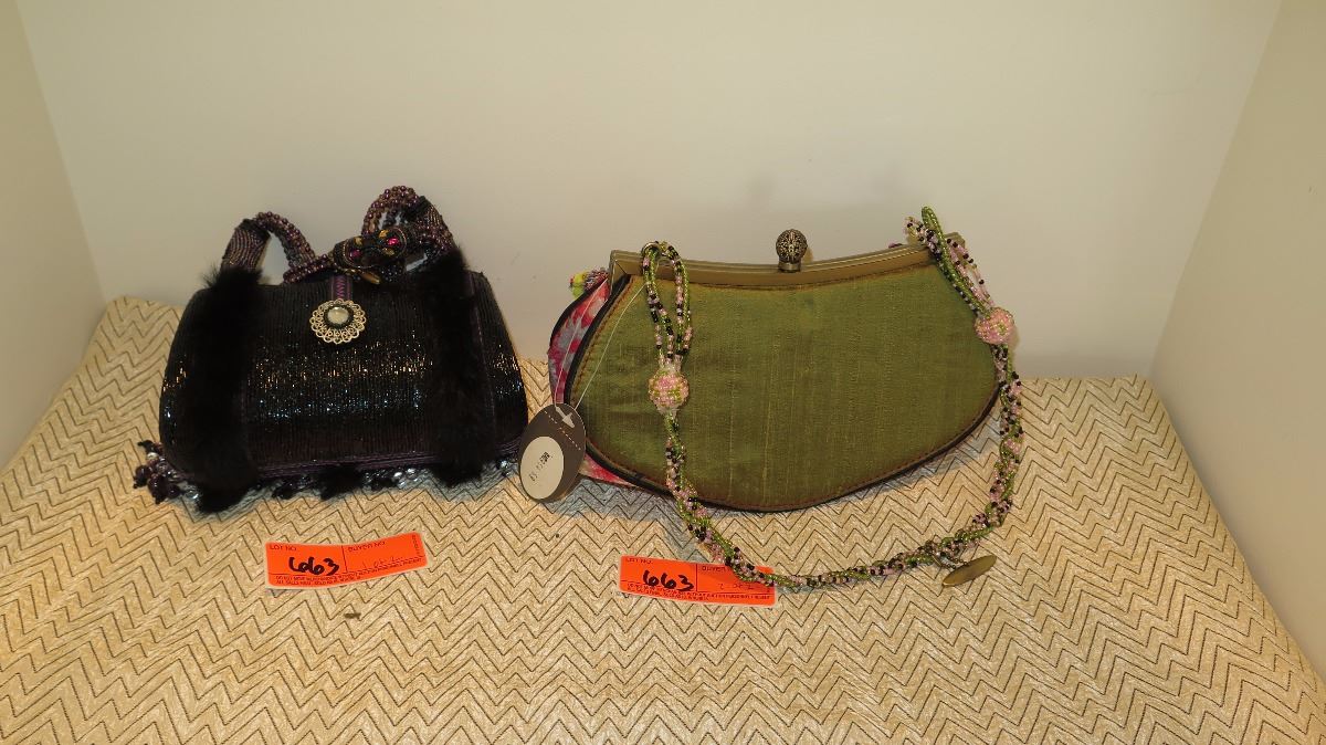 2 New Mary Frances Beaded Bags: Green Silk Shantung and Gloss Black w/Purple Flower