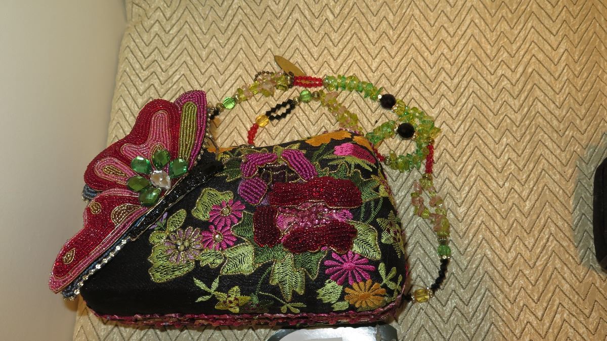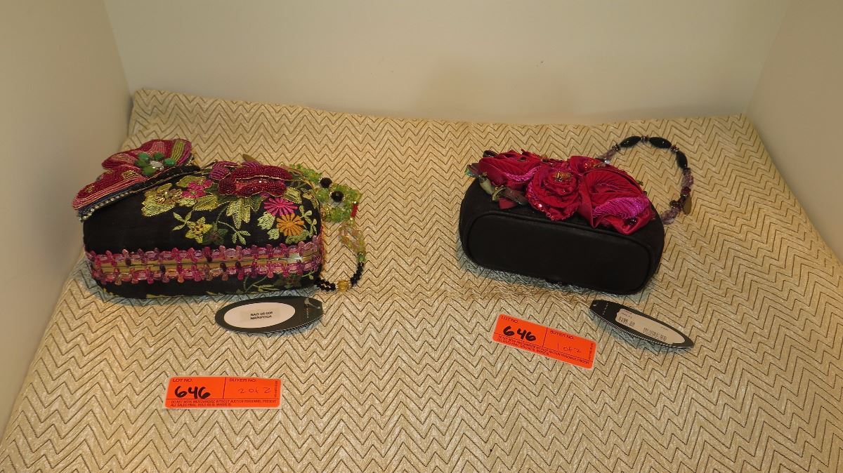 2 New Mary Frances Beaded Bags: "Mariposa" Black Embroidered Satin and Red Satin Roses