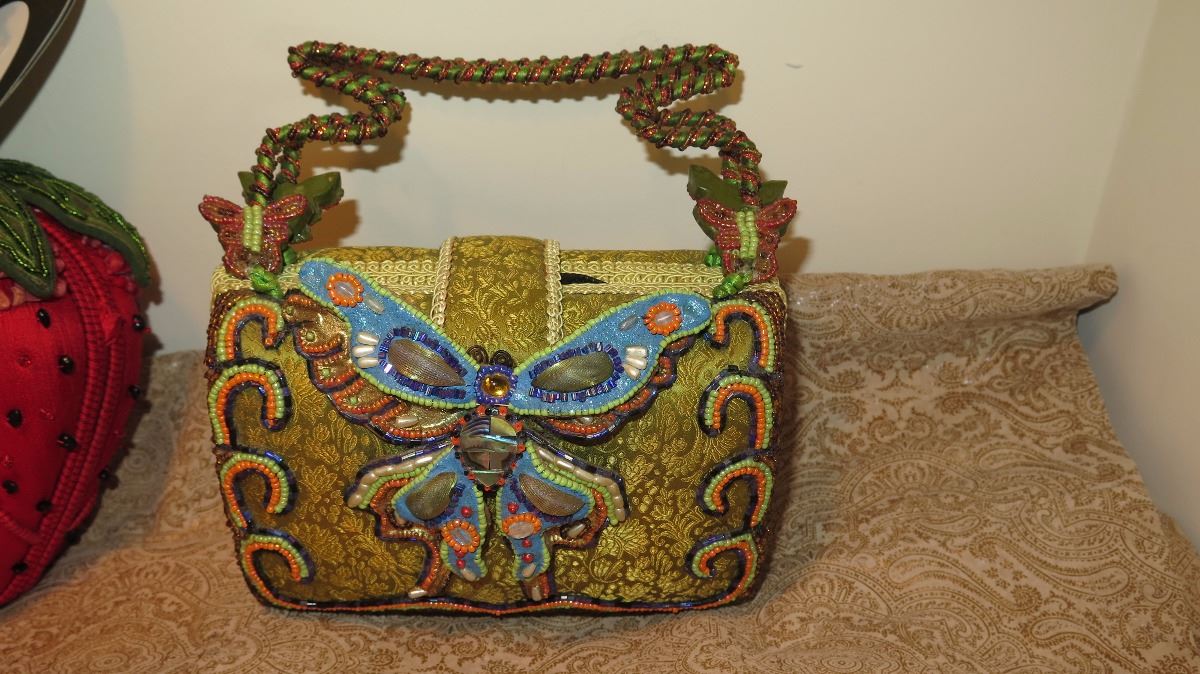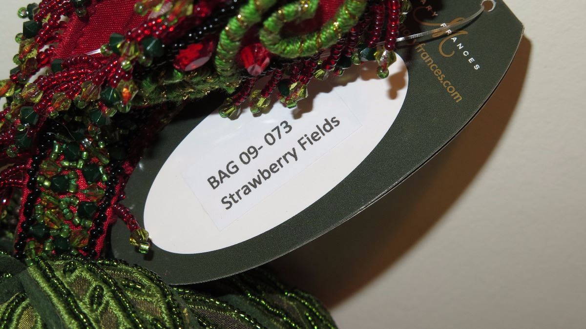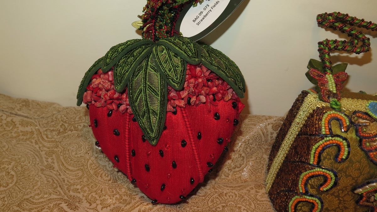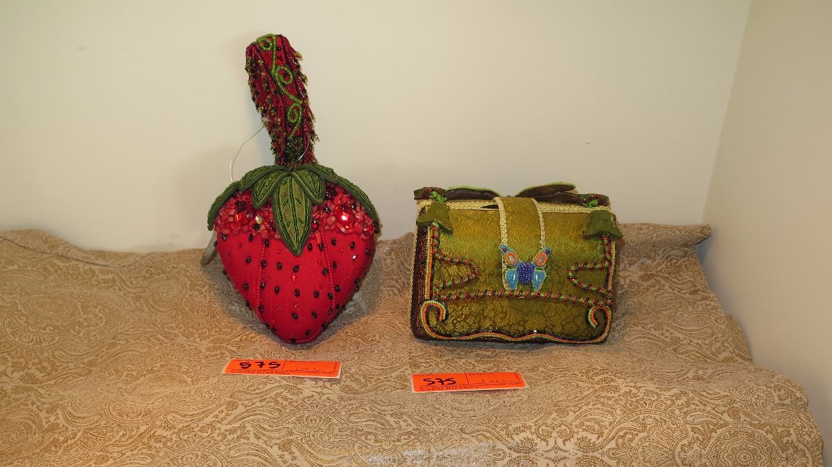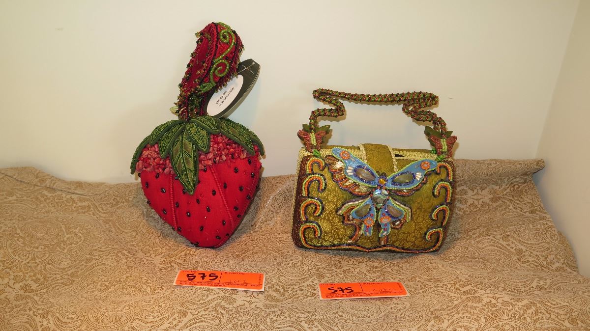 2 New Mary Frances Beaded Bags: "Strawberry Fields" and Green Satin Brocade