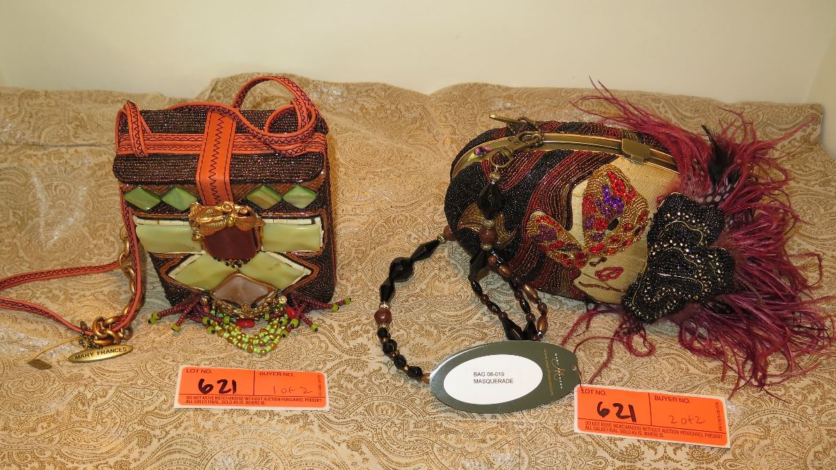 2 New Mary Frances Beaded Handbags: Oval "Masquerade" and Orange-Trim Box Bag