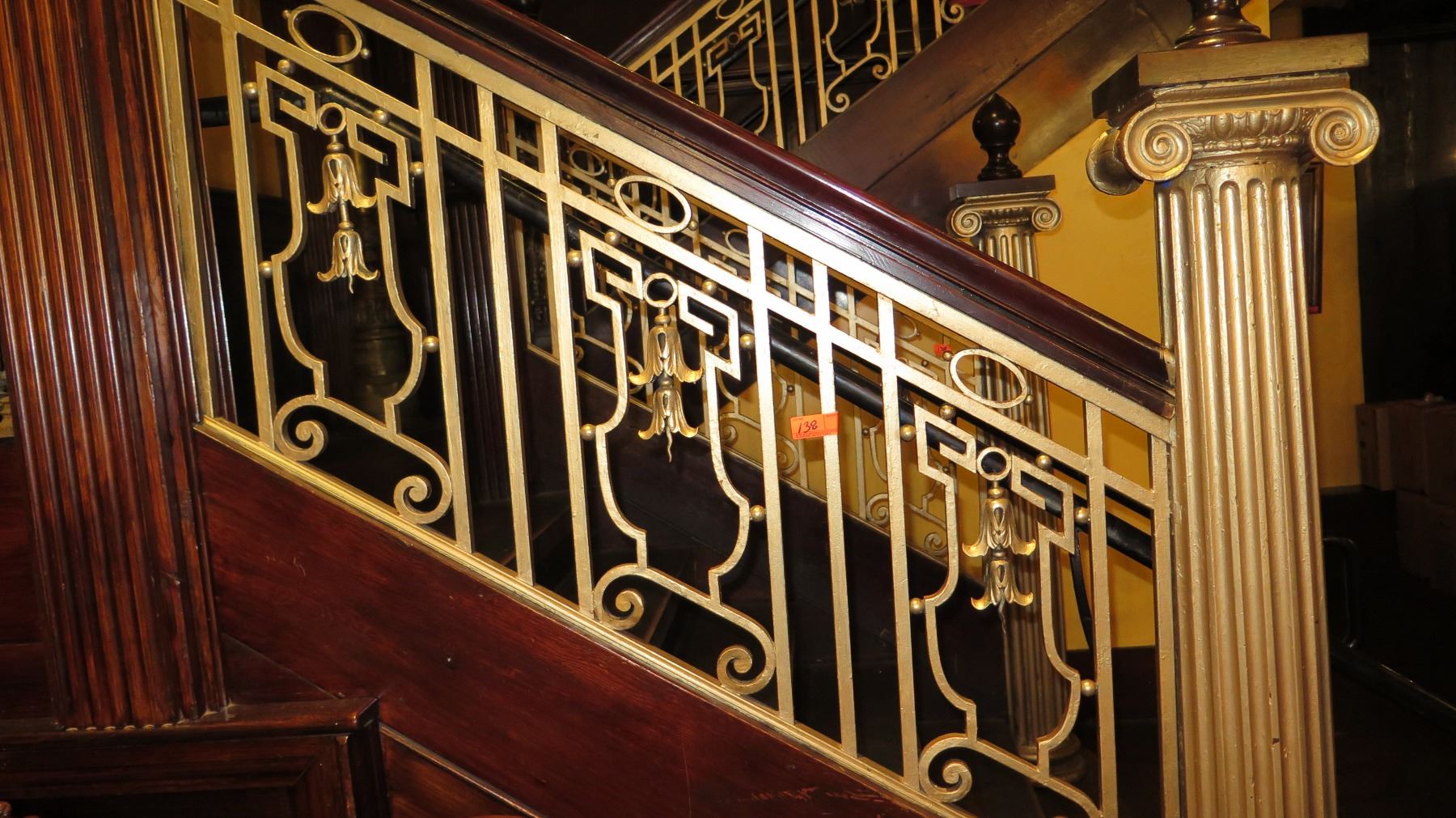 2-Piece Wrought Iron Scrollwork Railing Accents - Sections Measure (55"L x 25.5"W) (59"L x 25"W). Does not include wood frame surround, OSF says iron part can be removed fairly easily). Does not include wood frame surround. OSF says iron part can be removed fairly easily. This and all other iron railings will be available for removal July 26.