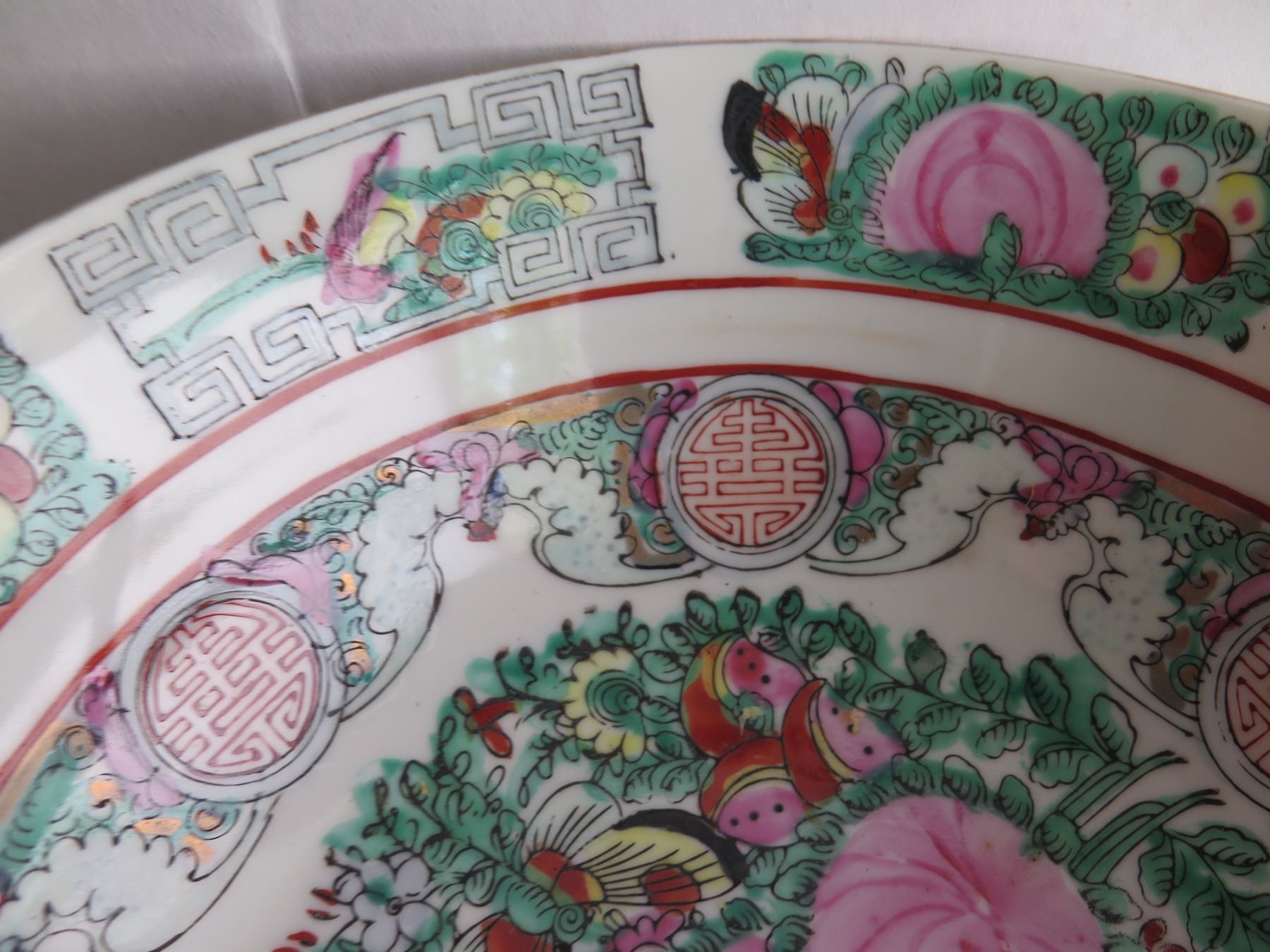 2 Rimmed Famille Rose Soup Bowl & Spoon, Hong Kong 8" Dia