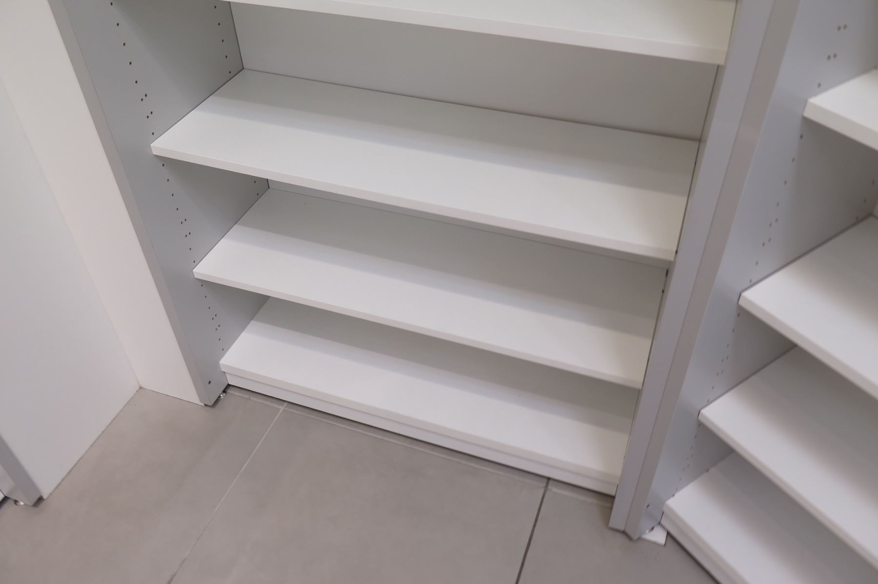 2 Sections of Metal Wall-Mount Shelving (Each Section 37"W x 16"D x 10ft Tall), Top has cabinet doors
