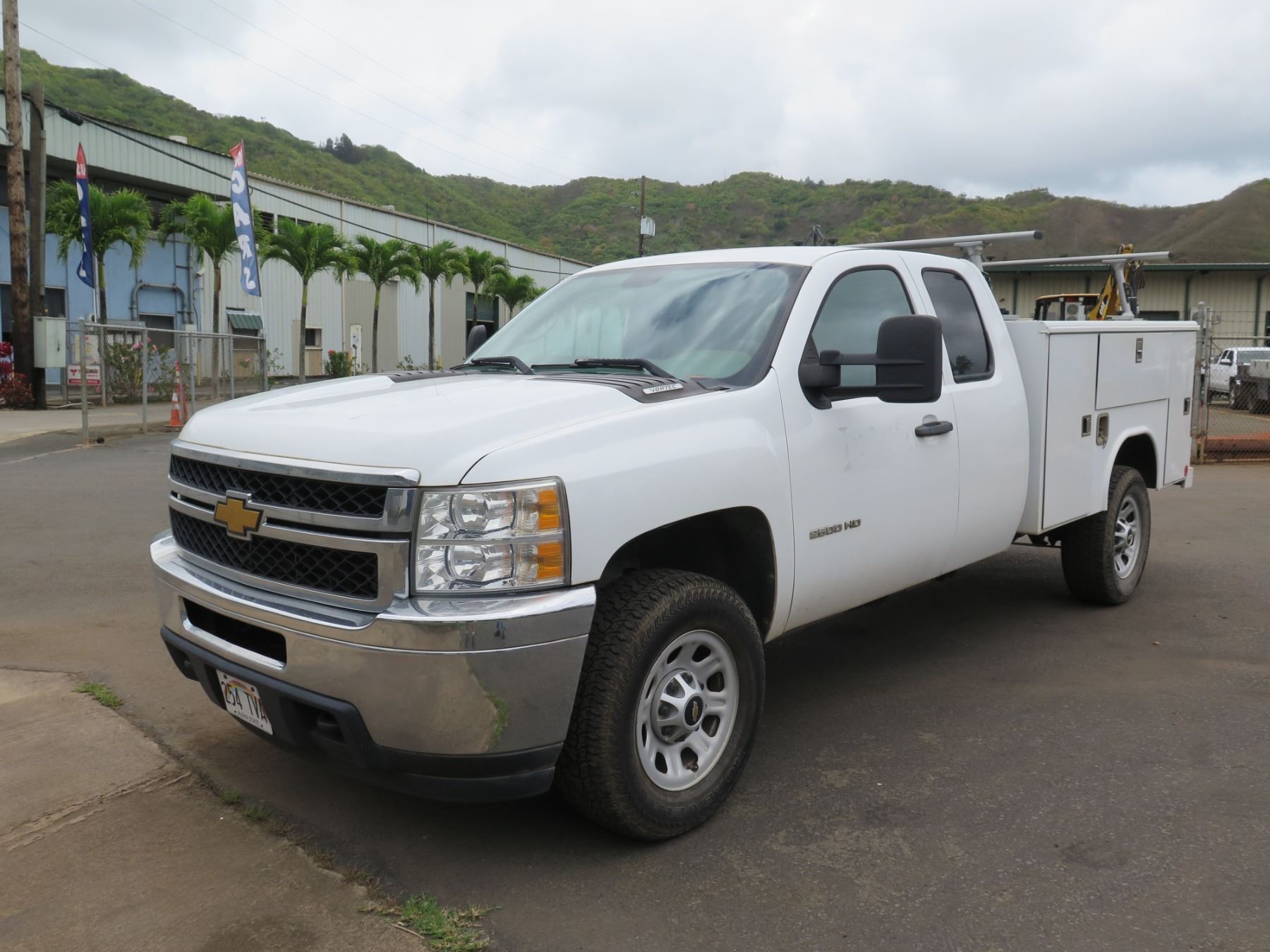 2013 Chevy Silverado 2500HD Service Truck w/ Racks, Lic. 254TVA (Starts & Runs - See Video). Odometer reads 122023. Has a dead battery and a jump start is required to start it.
