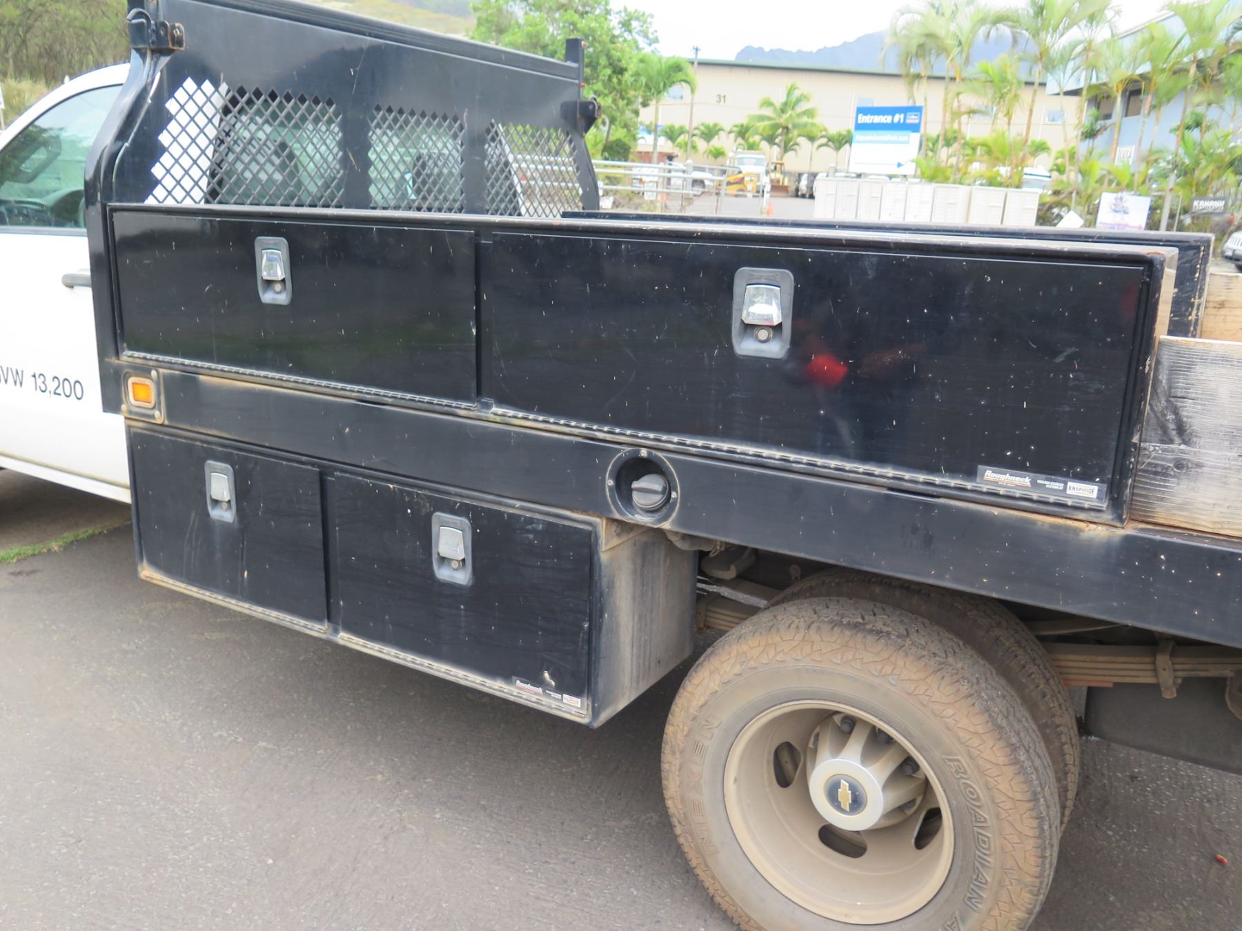 2014 Chevy Silverado 3500HD Flatbed Truck w/ Toolboxes, Lic. 519TVG (Starts & Runs - See Video). Odometer reads 54830. Has a dead battery and a jump start is required to start it.