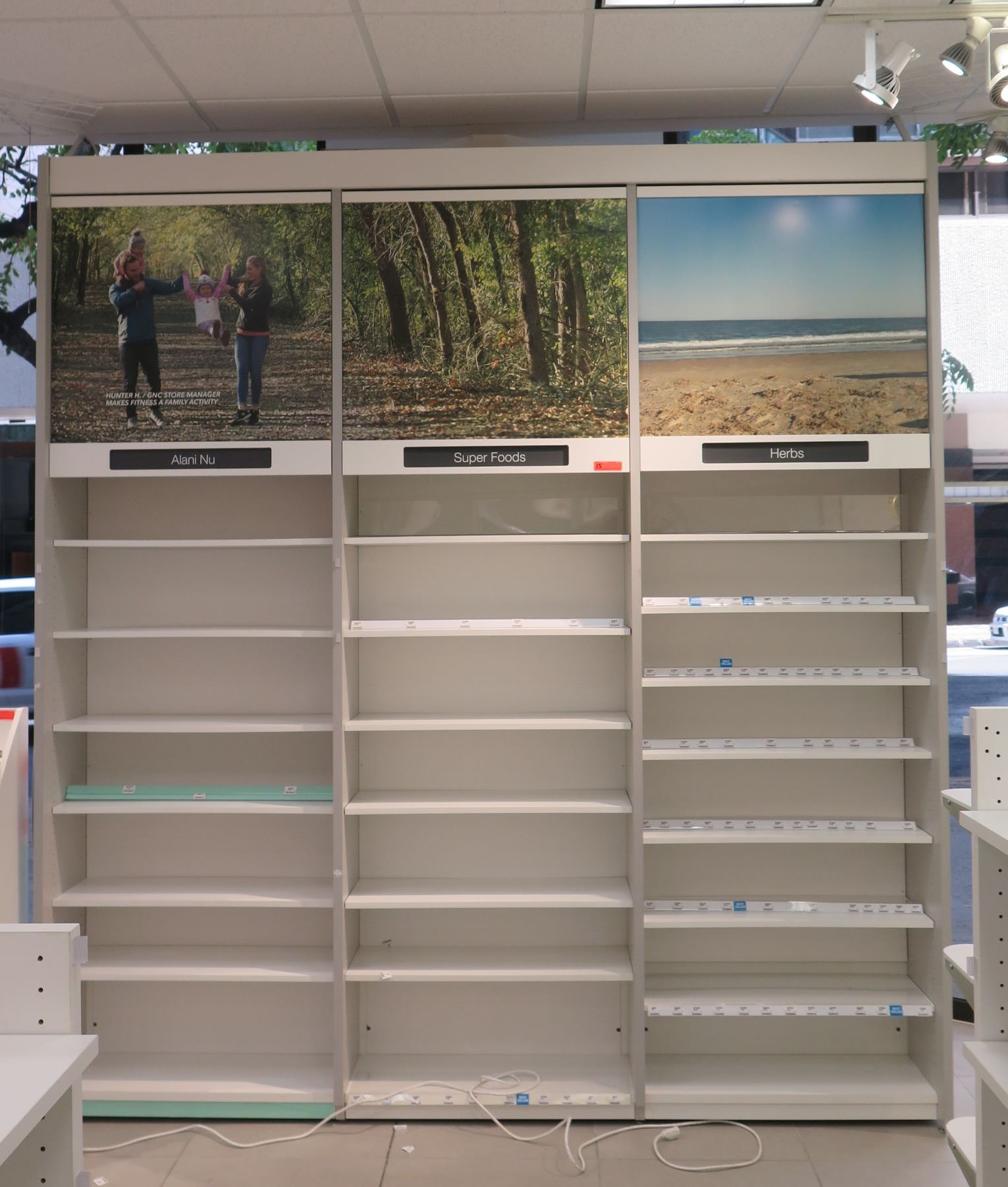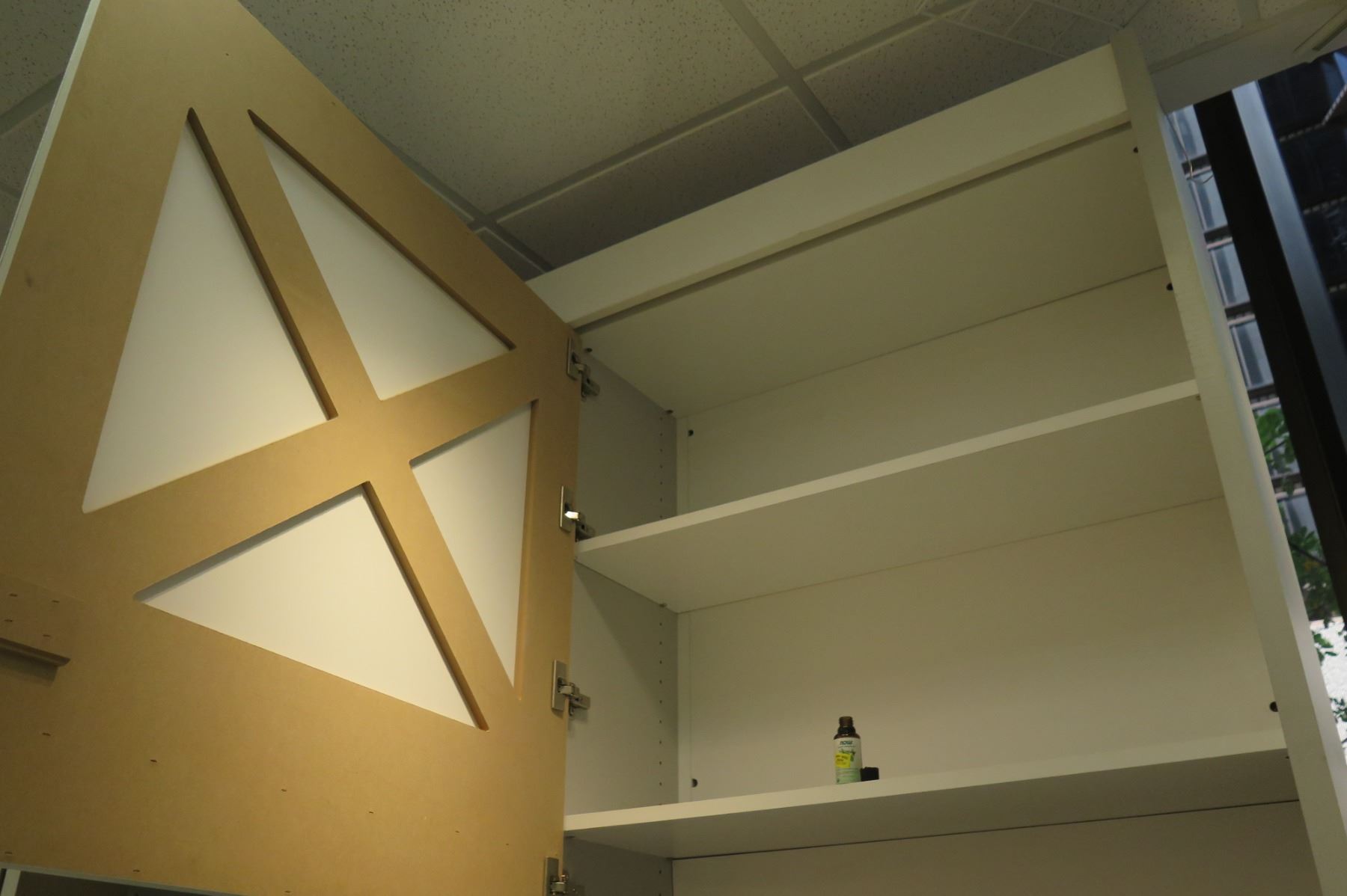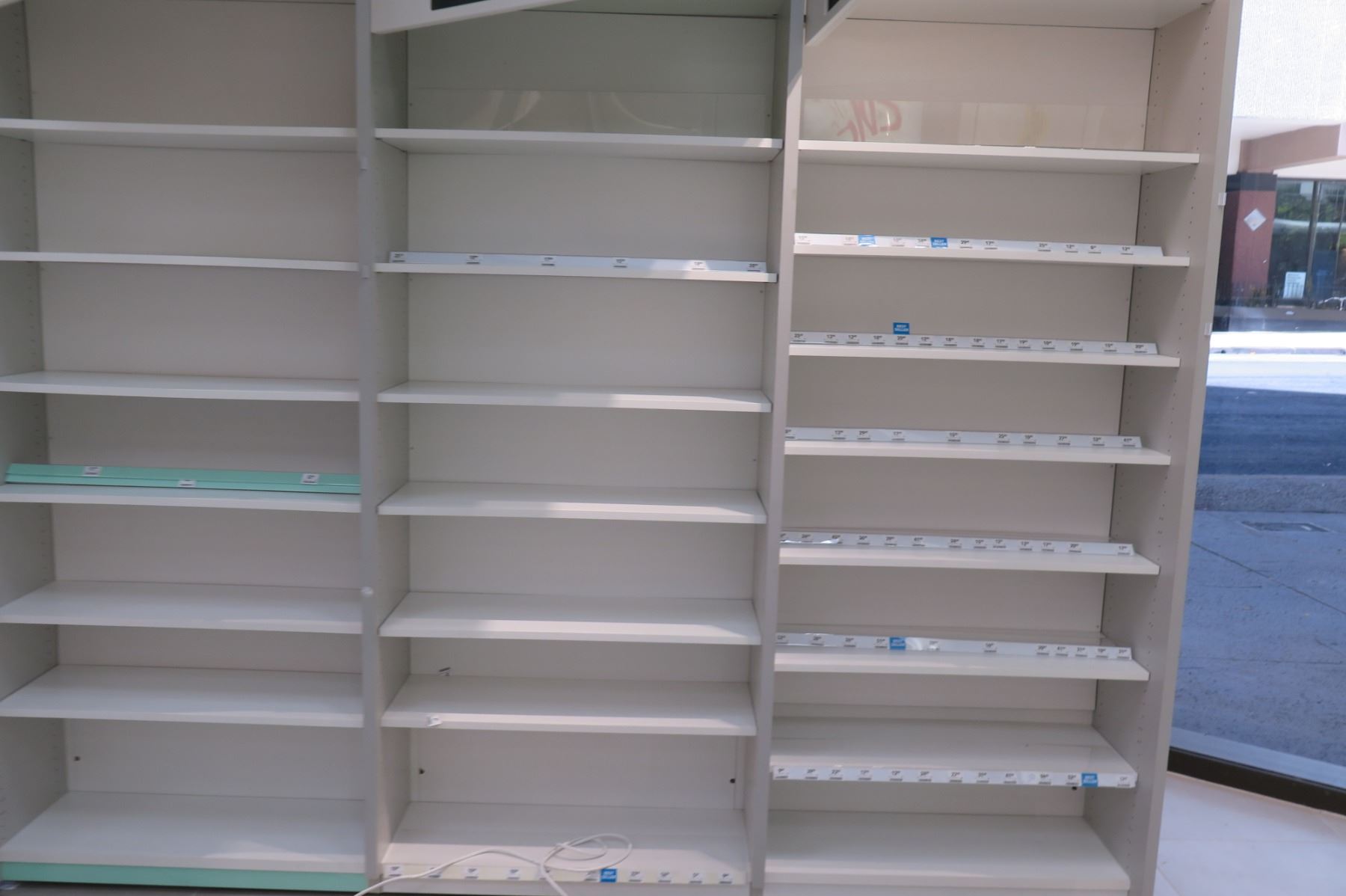 3 Sections Metal Wall-Mount Shelving (Each Section 36"W x 16"D x 10ft Tall), Top has cabinet doors