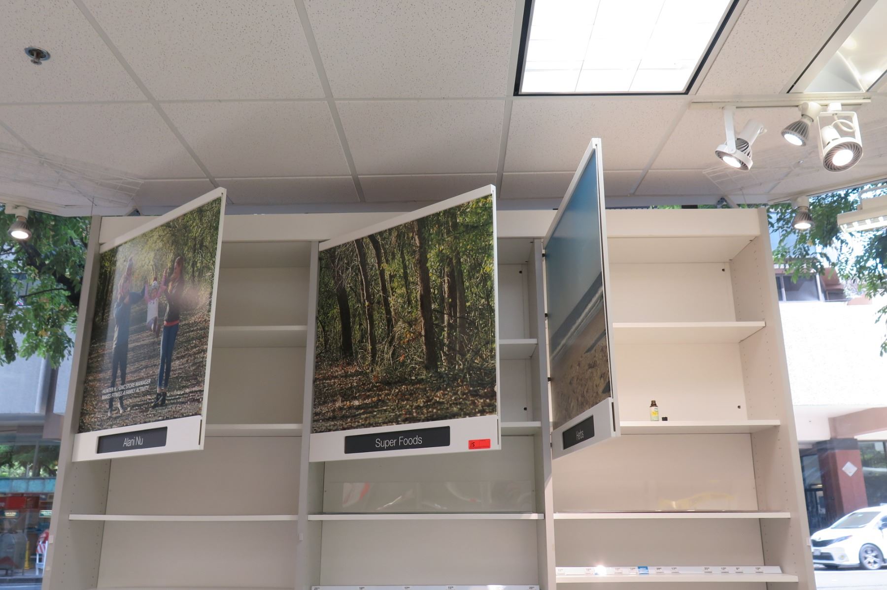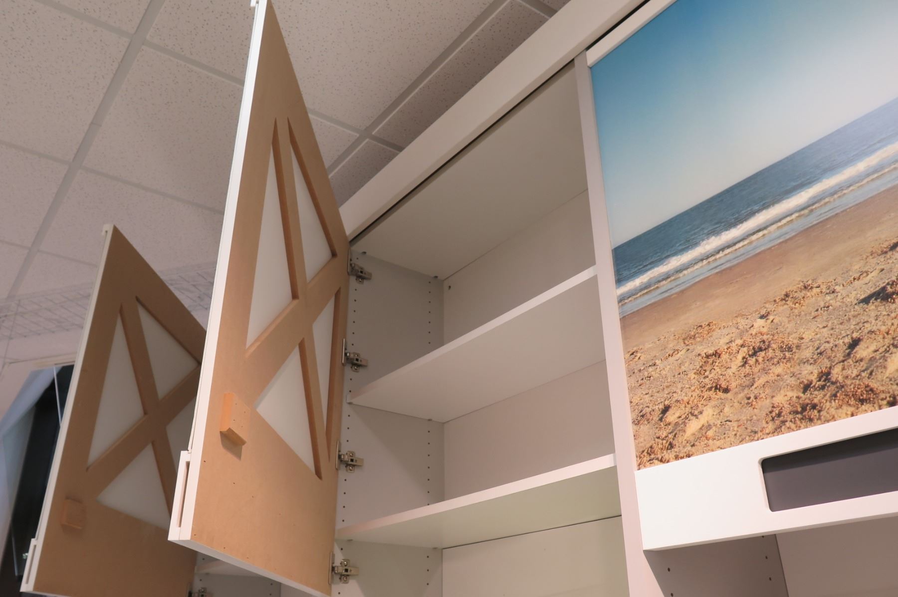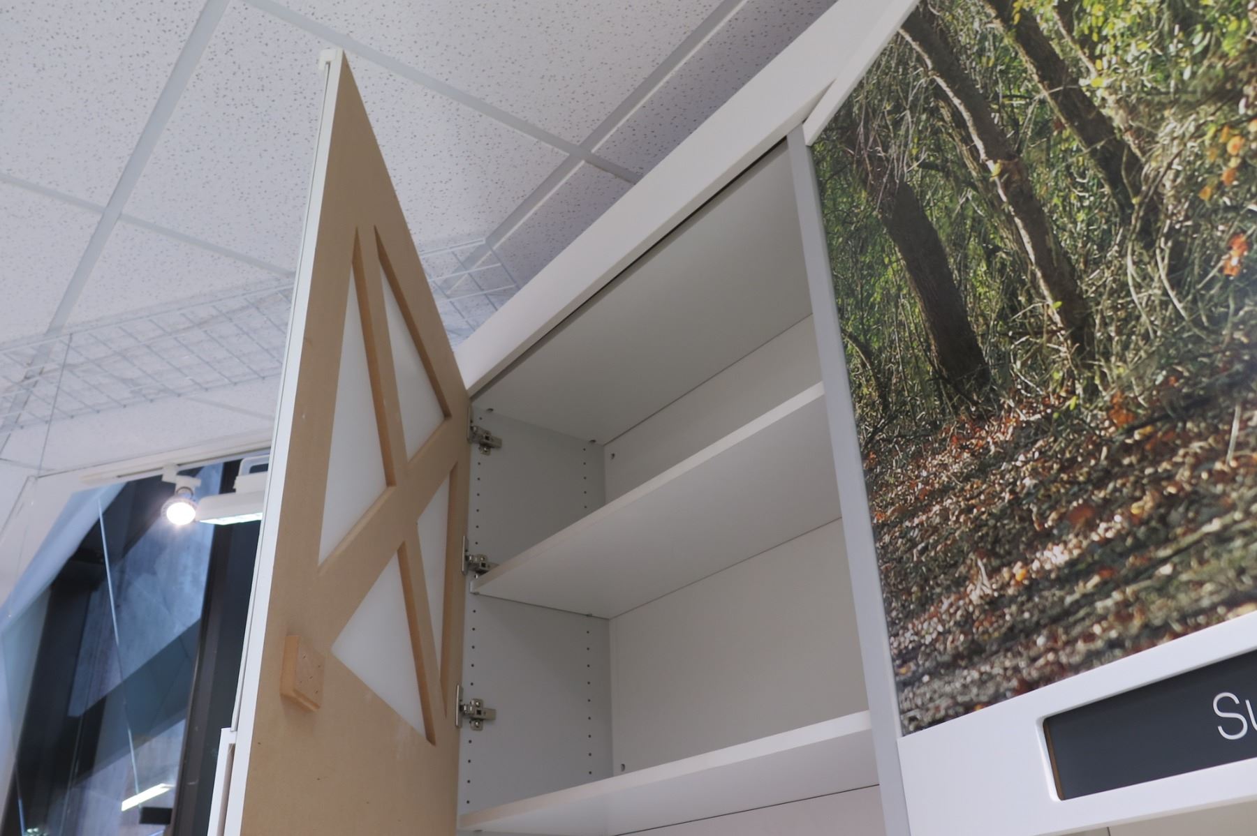 3 Sections Metal Wall-Mount Shelving (Each Section 36"W x 16"D x 10ft Tall), Top has cabinet doors