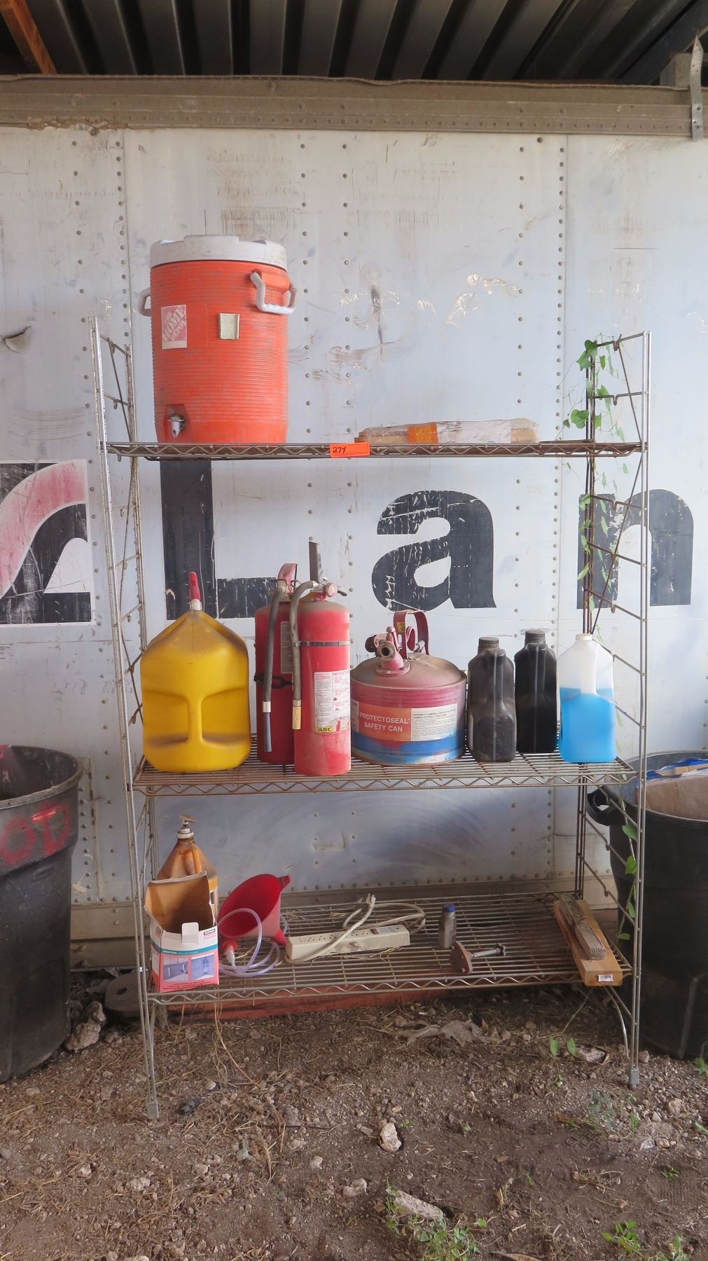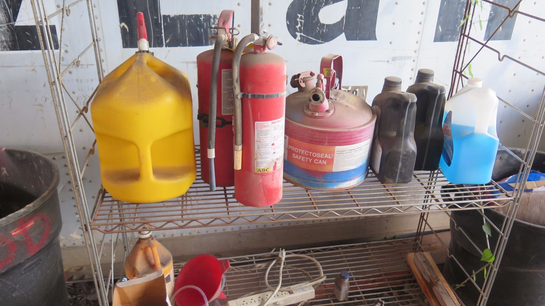 3-Shelf Wire Shelving w/Contents: Gas Can, Water Dispenser, Fire Extinguishers, etc.