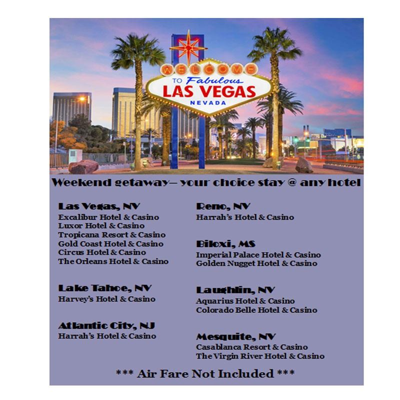 **Provides accommodations for two adults, 3-year expiration, No room taxes, Nightly resort fee applies, extra days can be added on at a discounted rate, upgrades can be added if available. Choose from: *Las Vegas: Excalibur Hotel & Casino, Luxor Hotel & Casino, Tropicana Resort & Casino, Gold Coast Hotel & Casino, Circus Hotel & Casino, The Orleans Hotel & Casino *Lake Tahoe, NV: Harvey's Hotel & Casino *Atlantic City, NJ: Harrah’s' Hotel & Casino *Reno, NV: Harrah's Hotel & Casino *Biloxi, MS: Imperial Palace Hotel & Casino, Golden Nugget Hotel & Casino *Laughlin, NV: Aquarius Hotel & Casino, Colorado Belle Hotel & Casino *Mesquite, NV: Casablanca Resort & Casino, The Virgin River Hotel & Casino ***Airfare Not Included***(reservations must be made at least 30 days prior to travel) (recipients must be at least 21 years of age)
