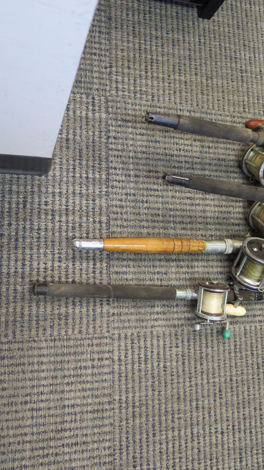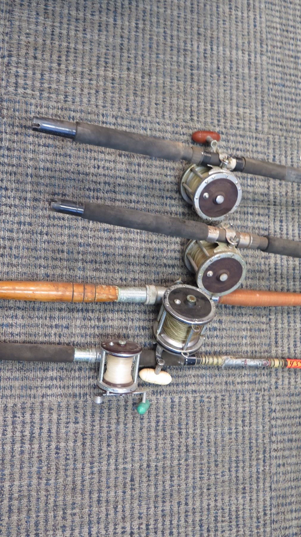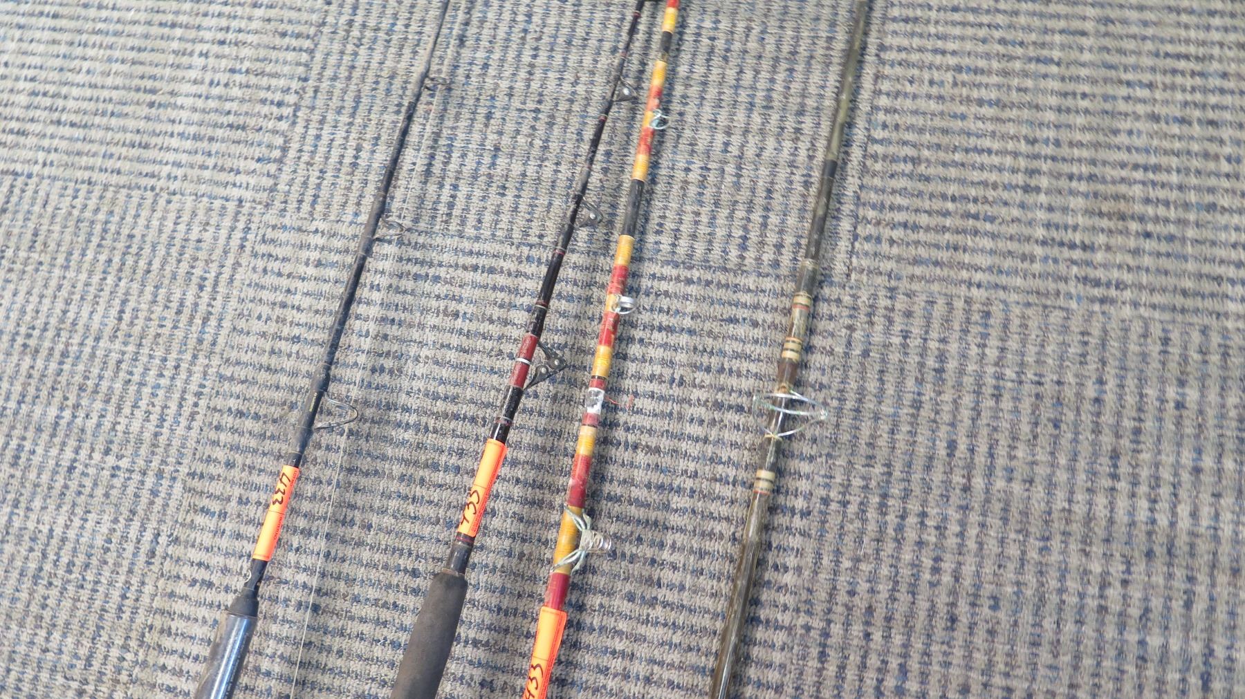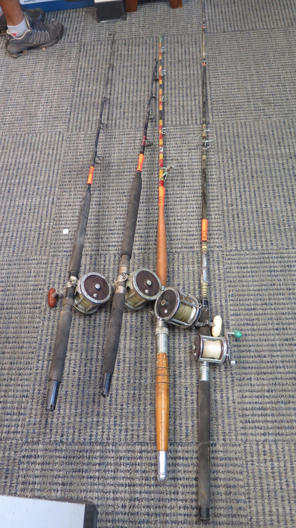 4 Fishing Rods w/ 2 Penn Reels - Rods are Various Lengths (these were stored outdoors, may need repa