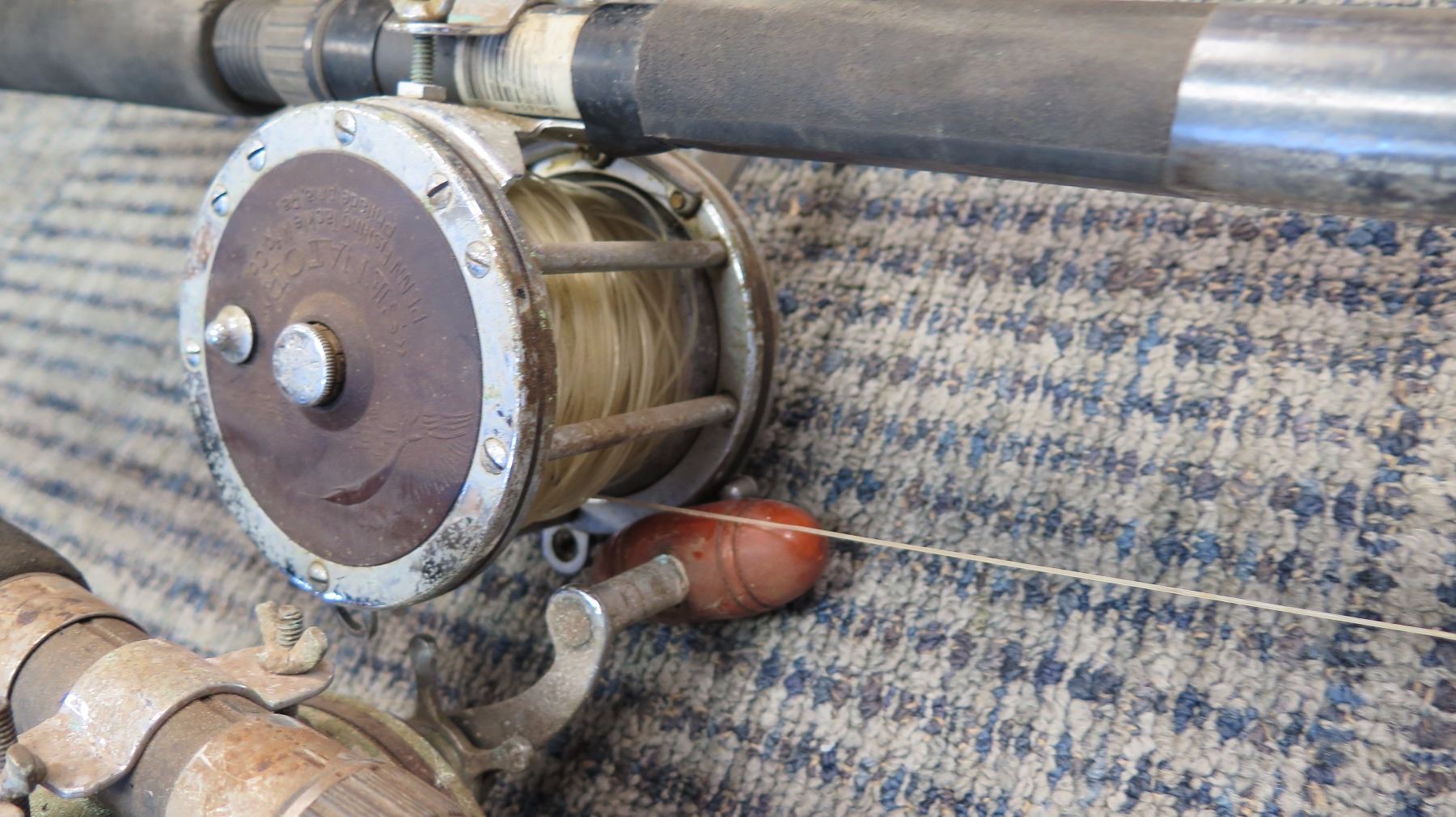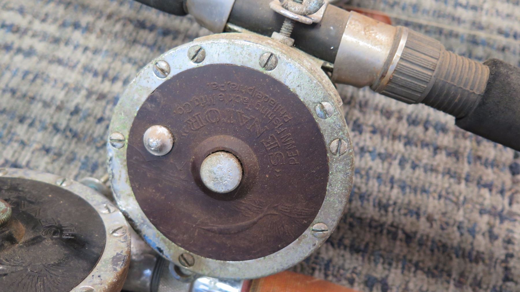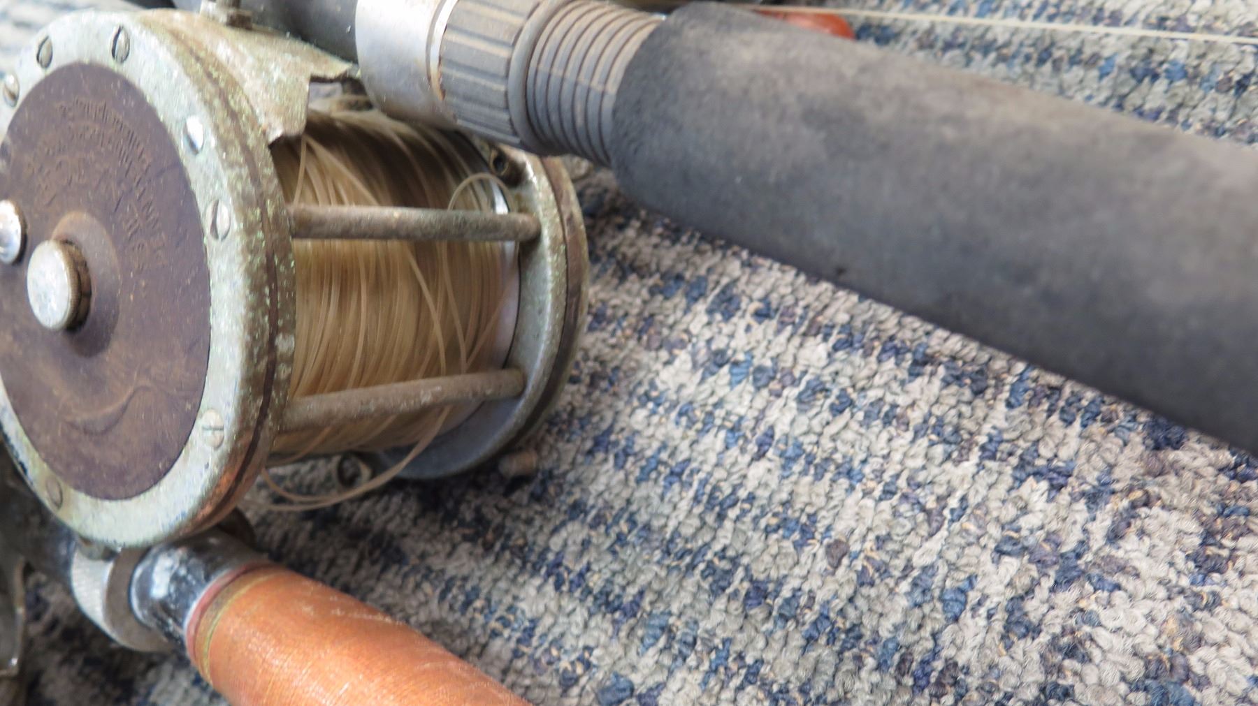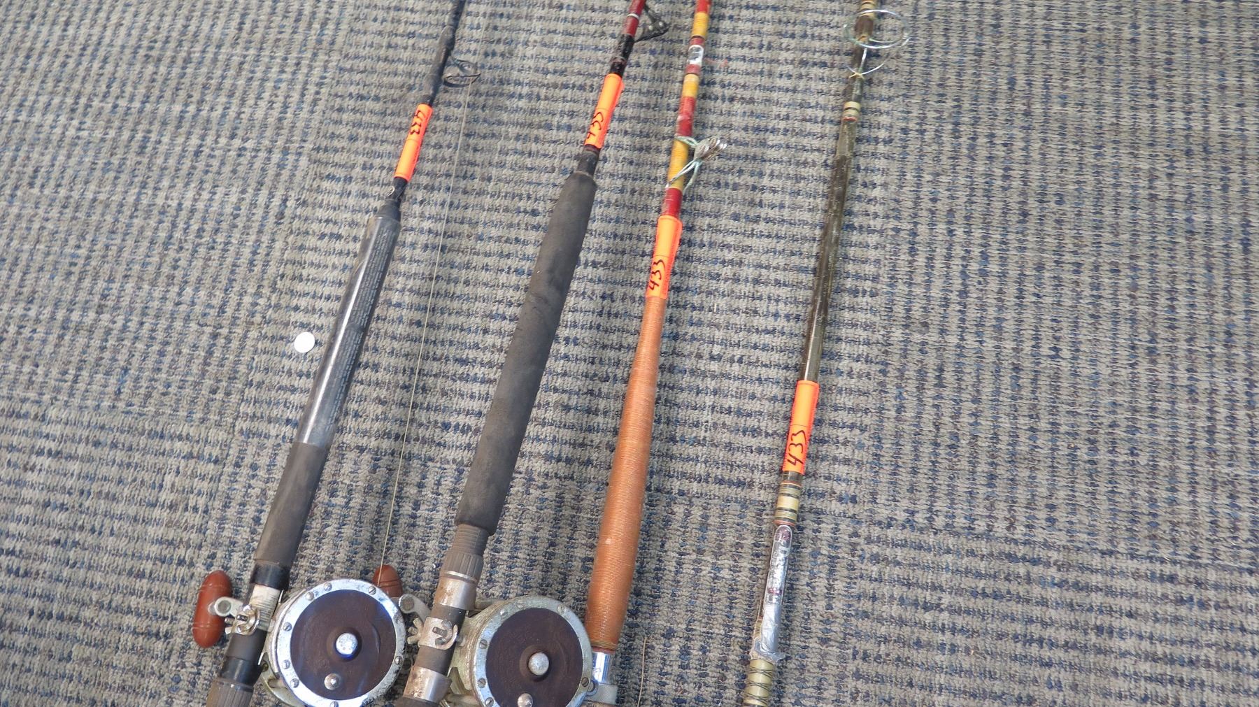 4 Fishing Rods w/ 2 Penn Reels - Rods are Various Lengths (these were stored outdoors, may need repa