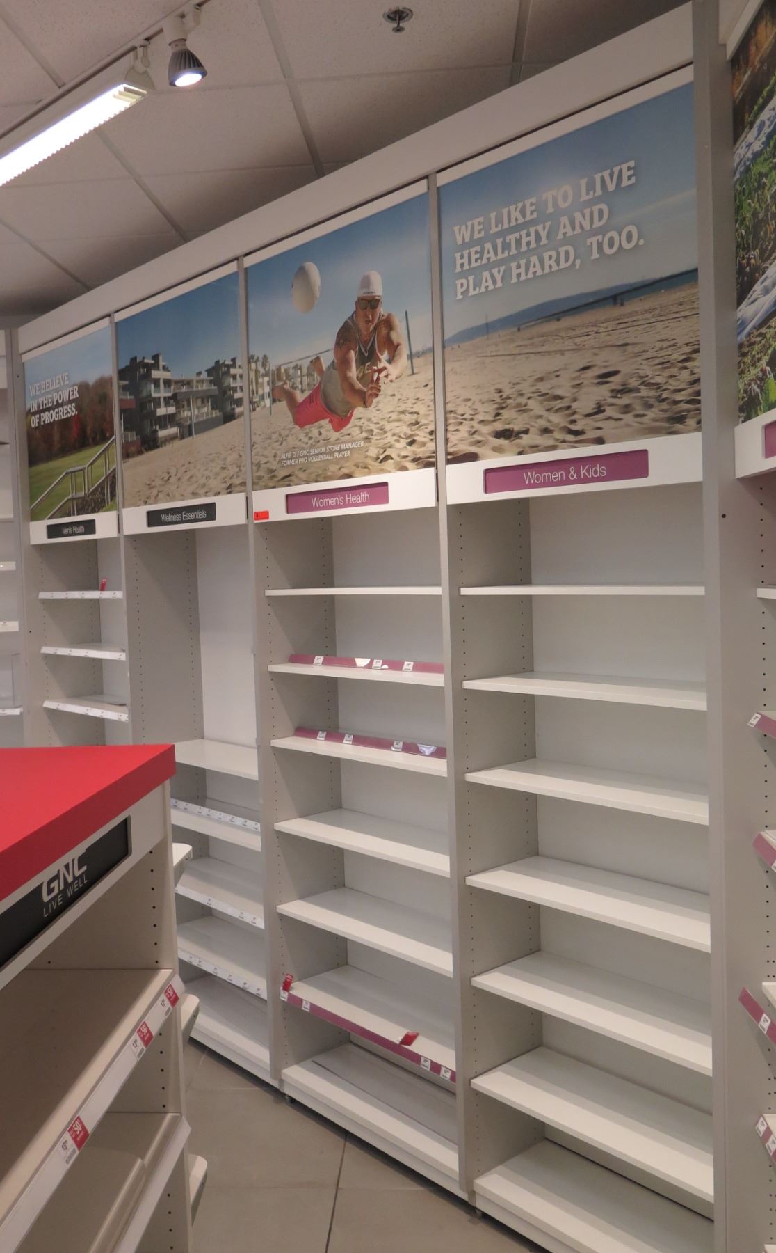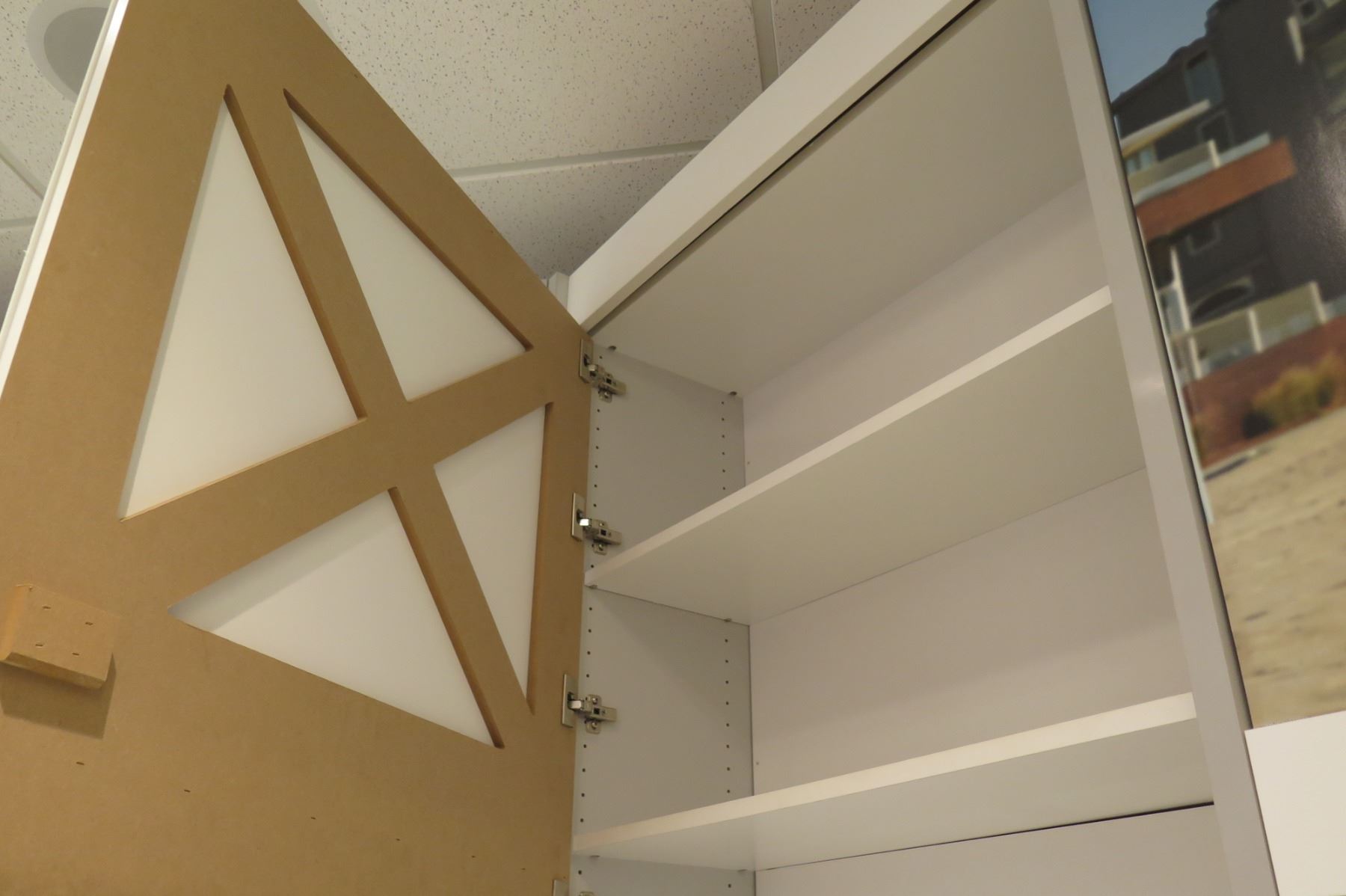 4 Sections of Metal Wall-Mount Shelving (Each Section 36"W x 16"D x 10ft Tall), Top has cabinet door