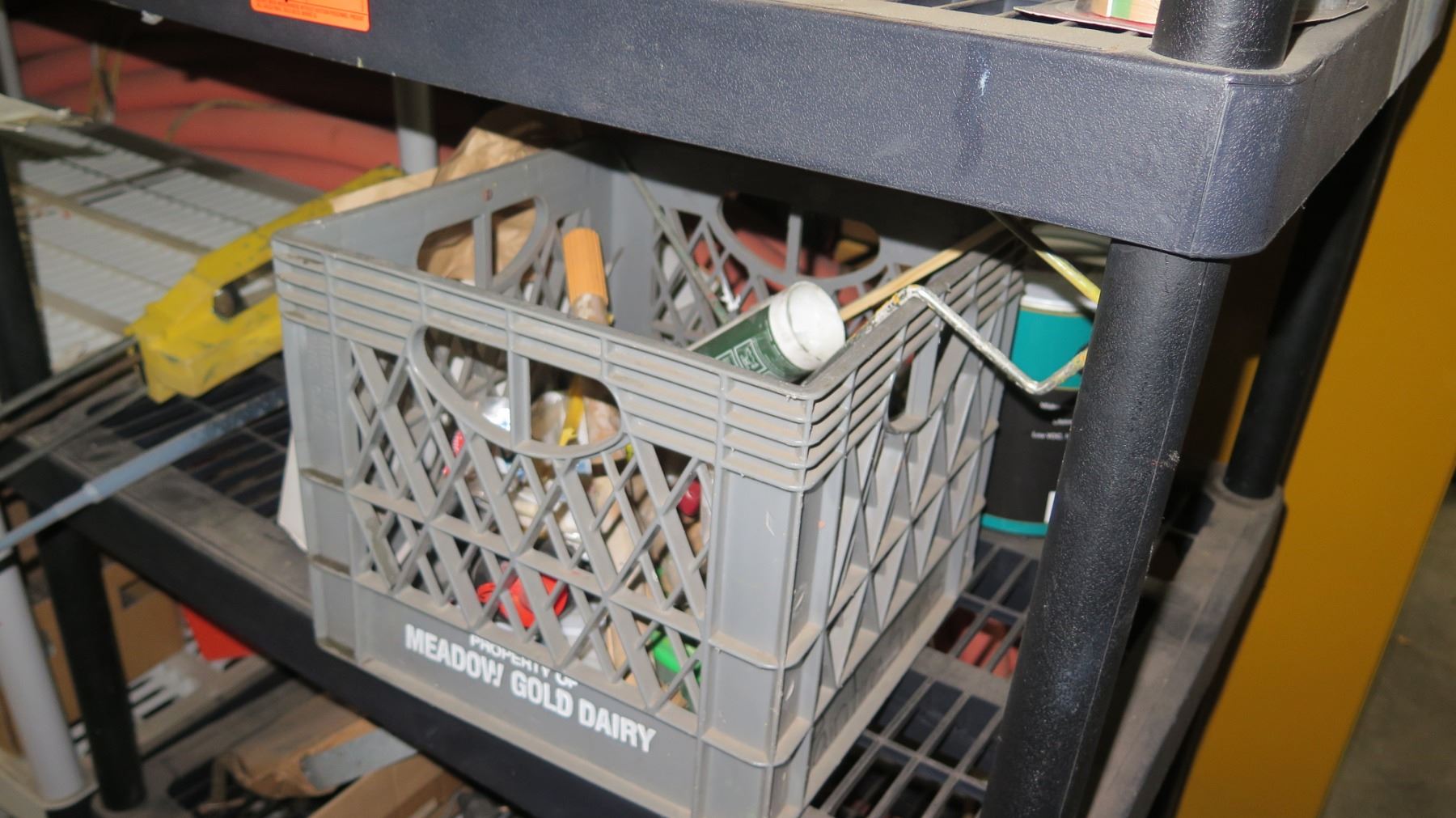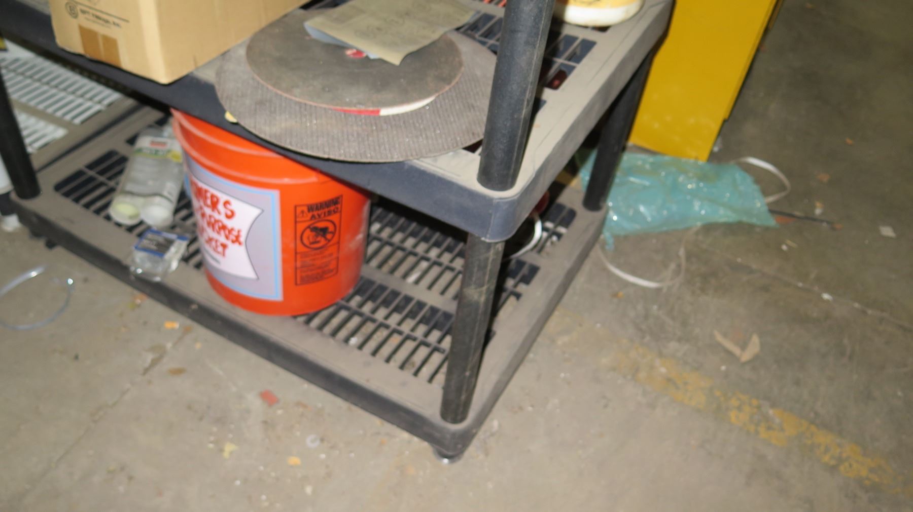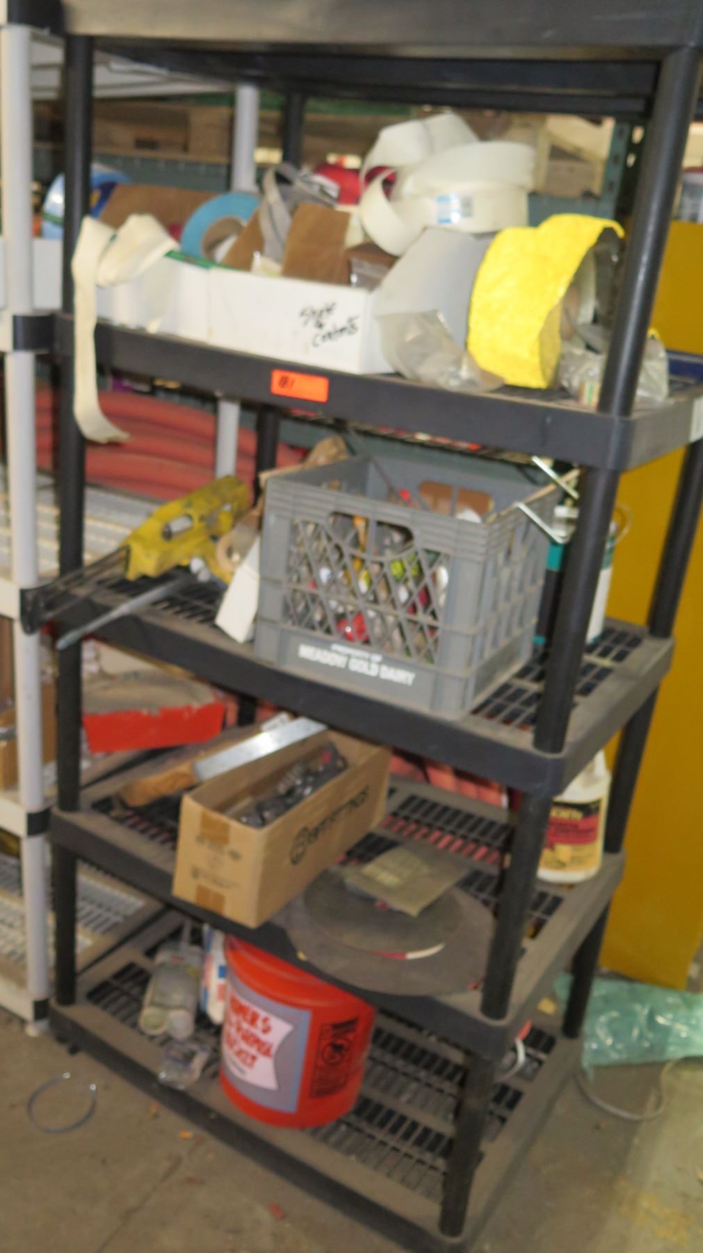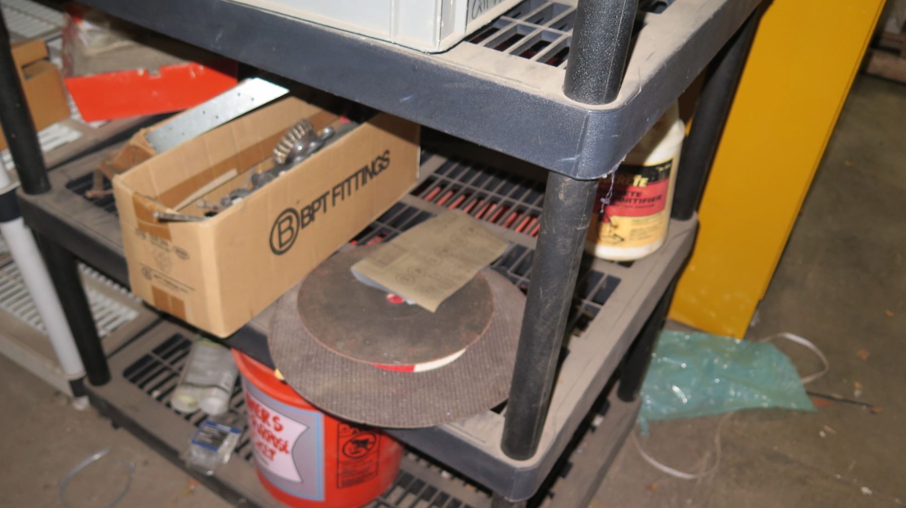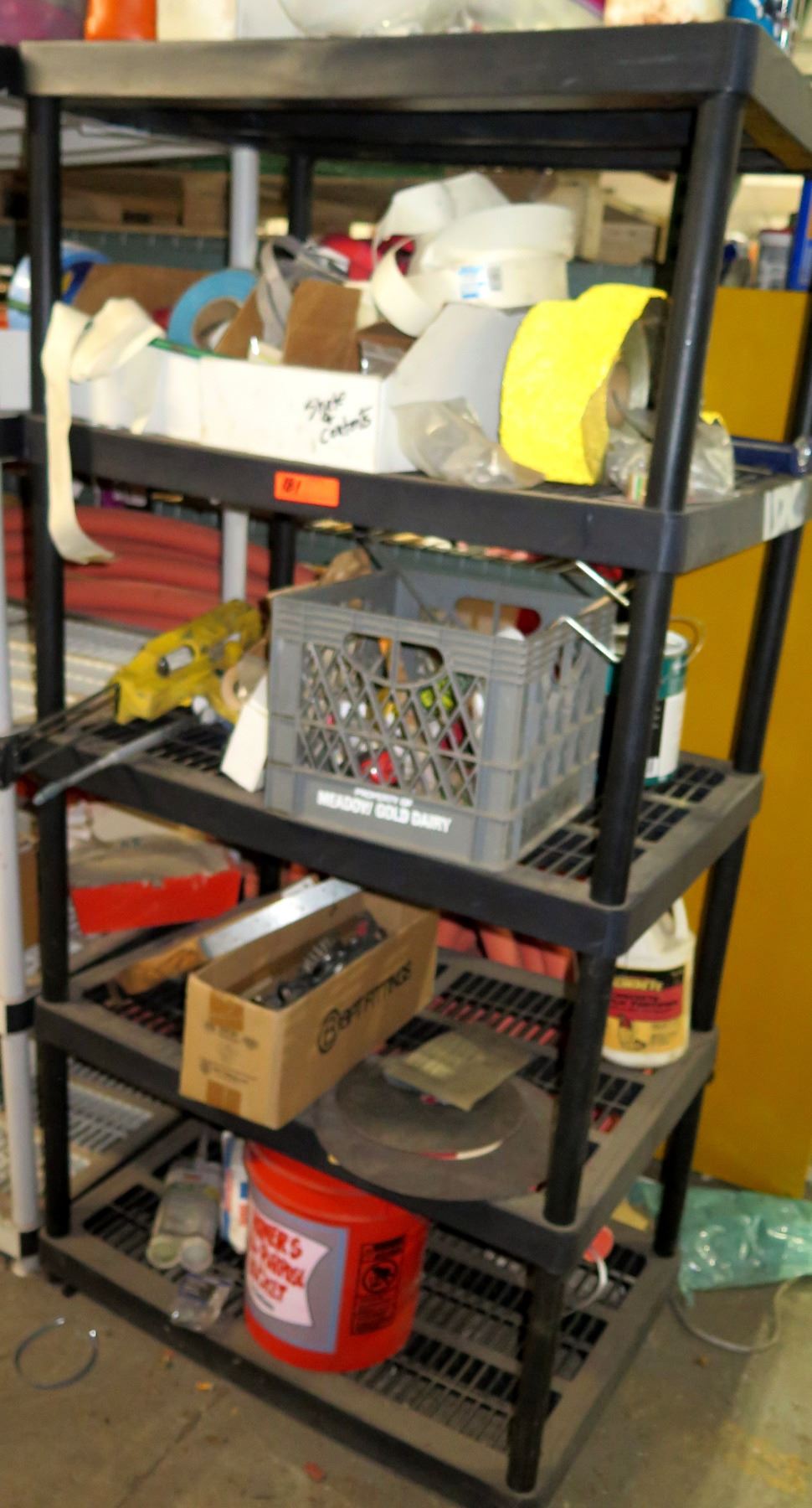 4 Tier Plastic Shelf w/ Contents - Misc Tools, Fittings, Nylon Strap, etc