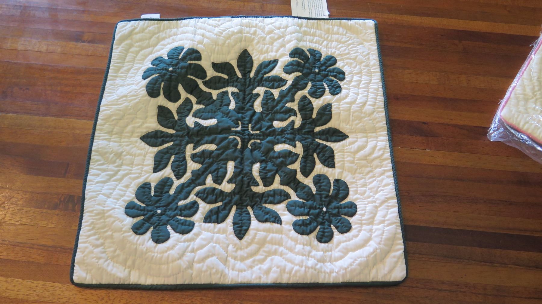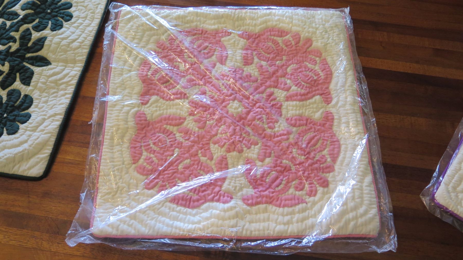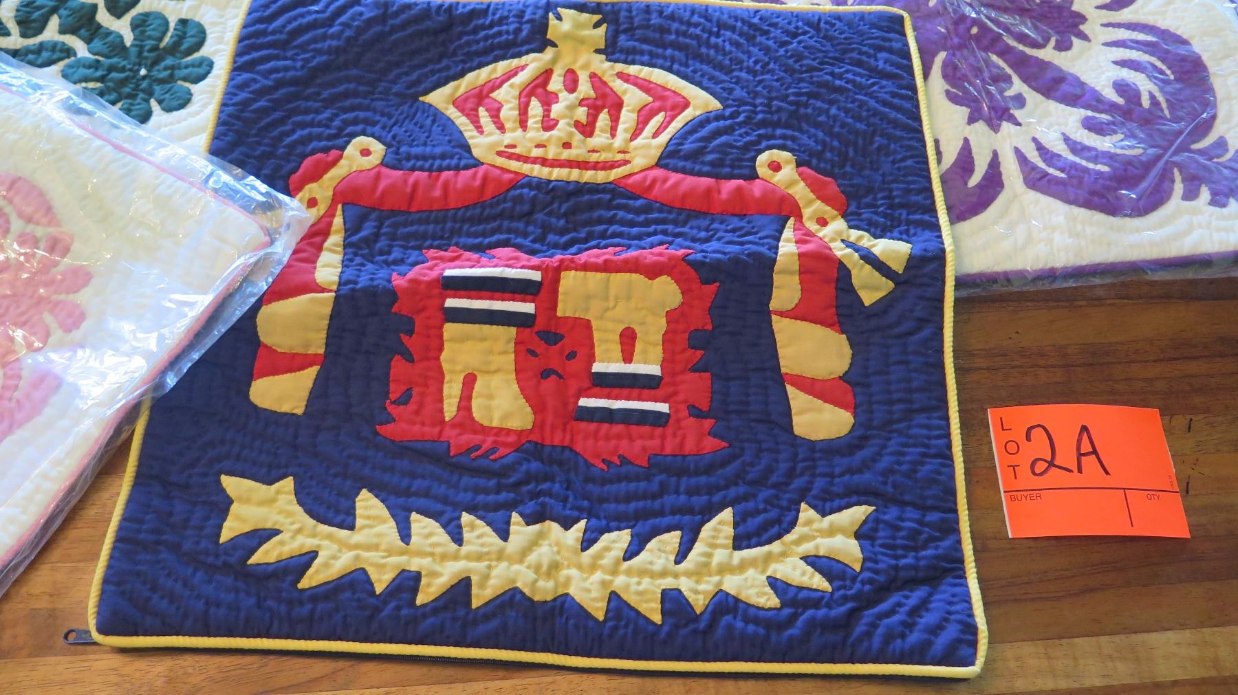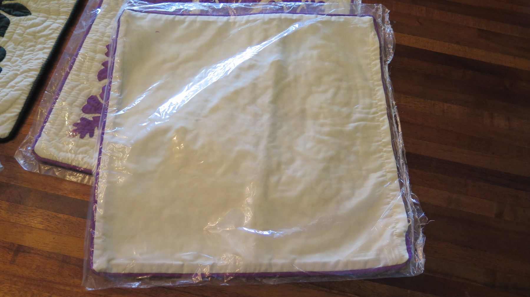 5 Quilted Pillow Covers - Hand-Stitched (4 New, Non-Authentic, Made in the Philippines), Blue is Custom-Made (not sure where it was made). Approx. 17"x17" (purple design pillows are slightly smaller)