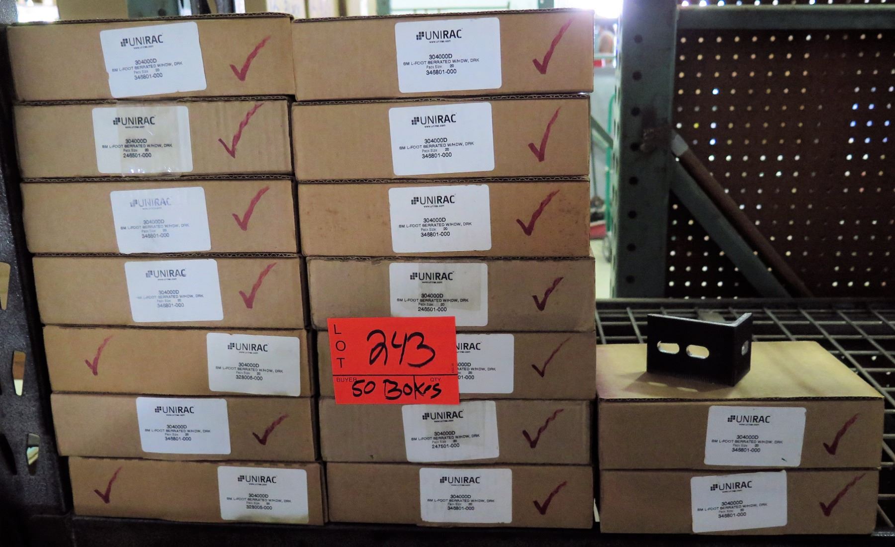 These sell online for $2.52. There are 50 boxes of 20 in this lot (total $2520). https://www.solaris-shop.com/unirac-304000d-solarmount-serrated-l-foot-dark/
