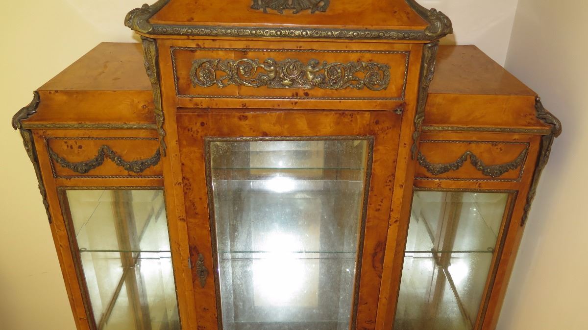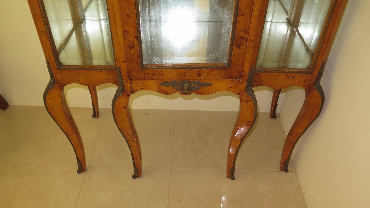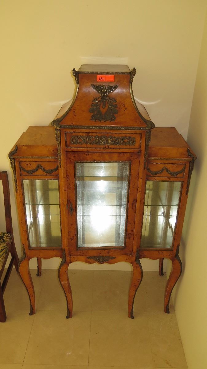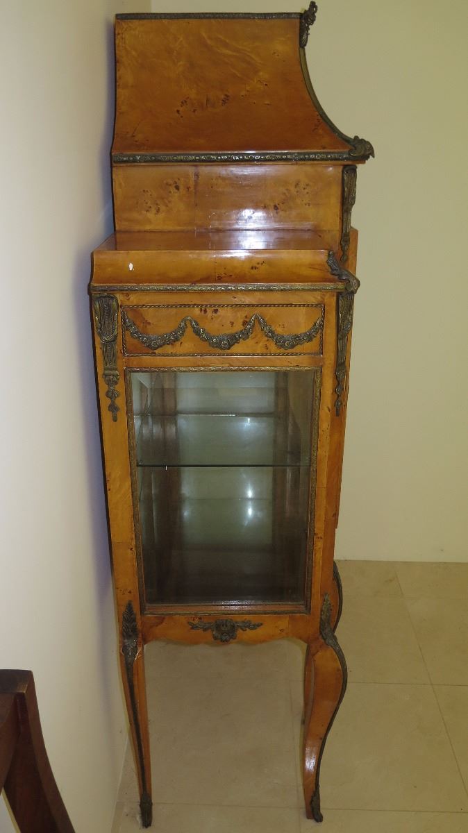 6-Legged Burl Wood Glass Vitrine Cabinet w/Gilt Swag Ornamentation 41X19X65