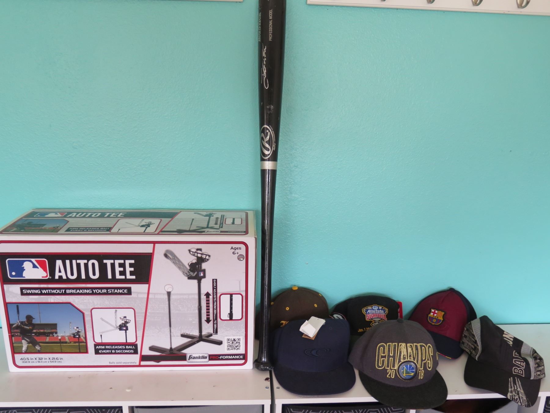 6 Unused Hats, Auto Tee, Used Wooden Bat