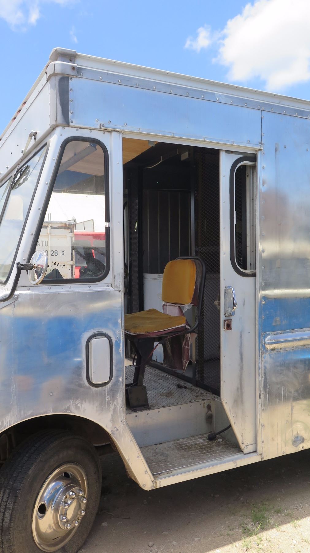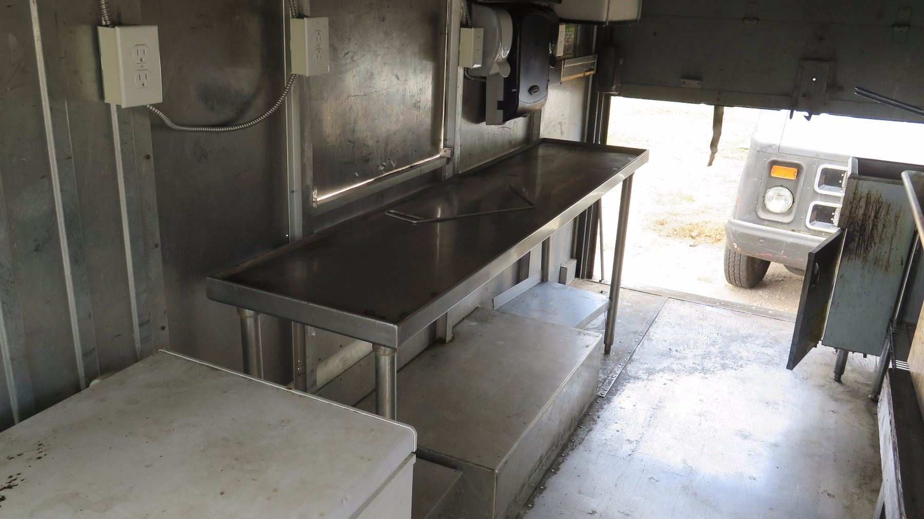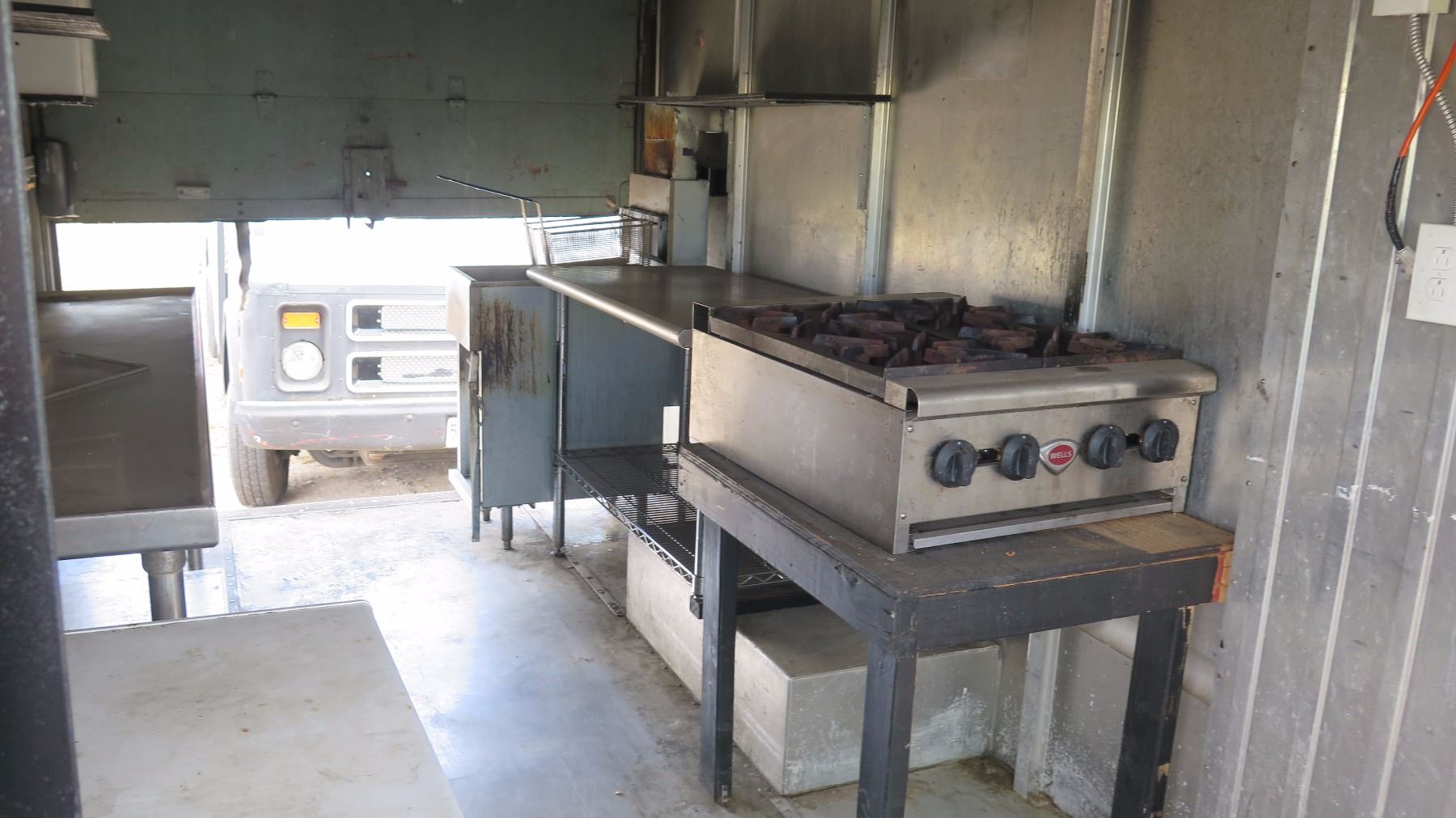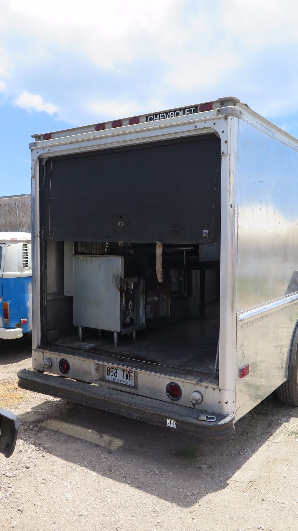 83 Chevy, 147.5"L, 80.5"W, 77.5"H - Has Title. Freezer, 4-Burner Range, Fryer, Shelf