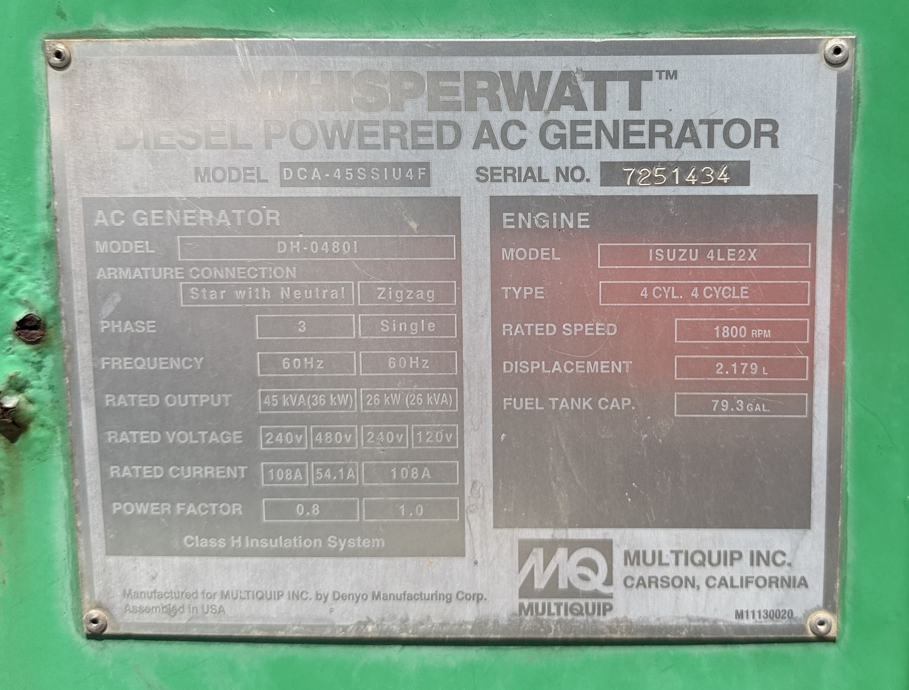 2016 Multiquip DCA45SSIU4FSG 36 kW Mobile Generator (Starts & Runs - See Video)
