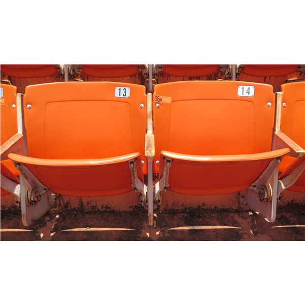 Pair Aloha Stadium Seats w/ Backs & 3 Armrests, Orange, Seats 13 & 14, 45"x13"x28"H. Note: Seats have been removed for pick u...