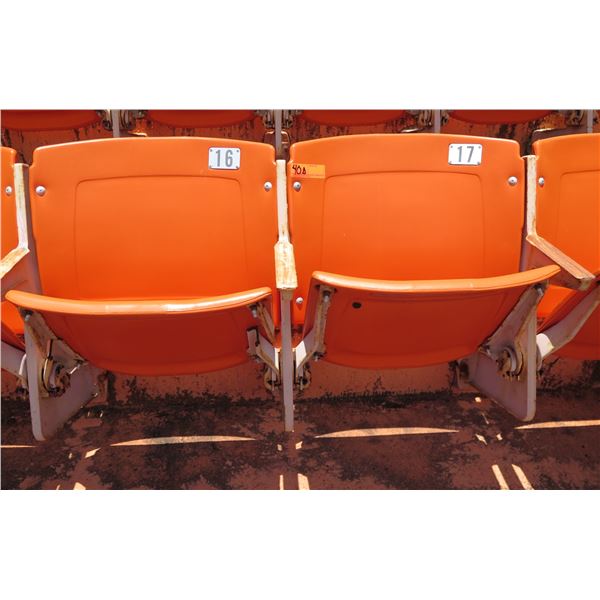 Pair Aloha Stadium Seats w/ Backs & 3 Armrests, Orange, Seats 16 & 17, 45"x13"x28"H. Note: Seats have been removed for pick u...