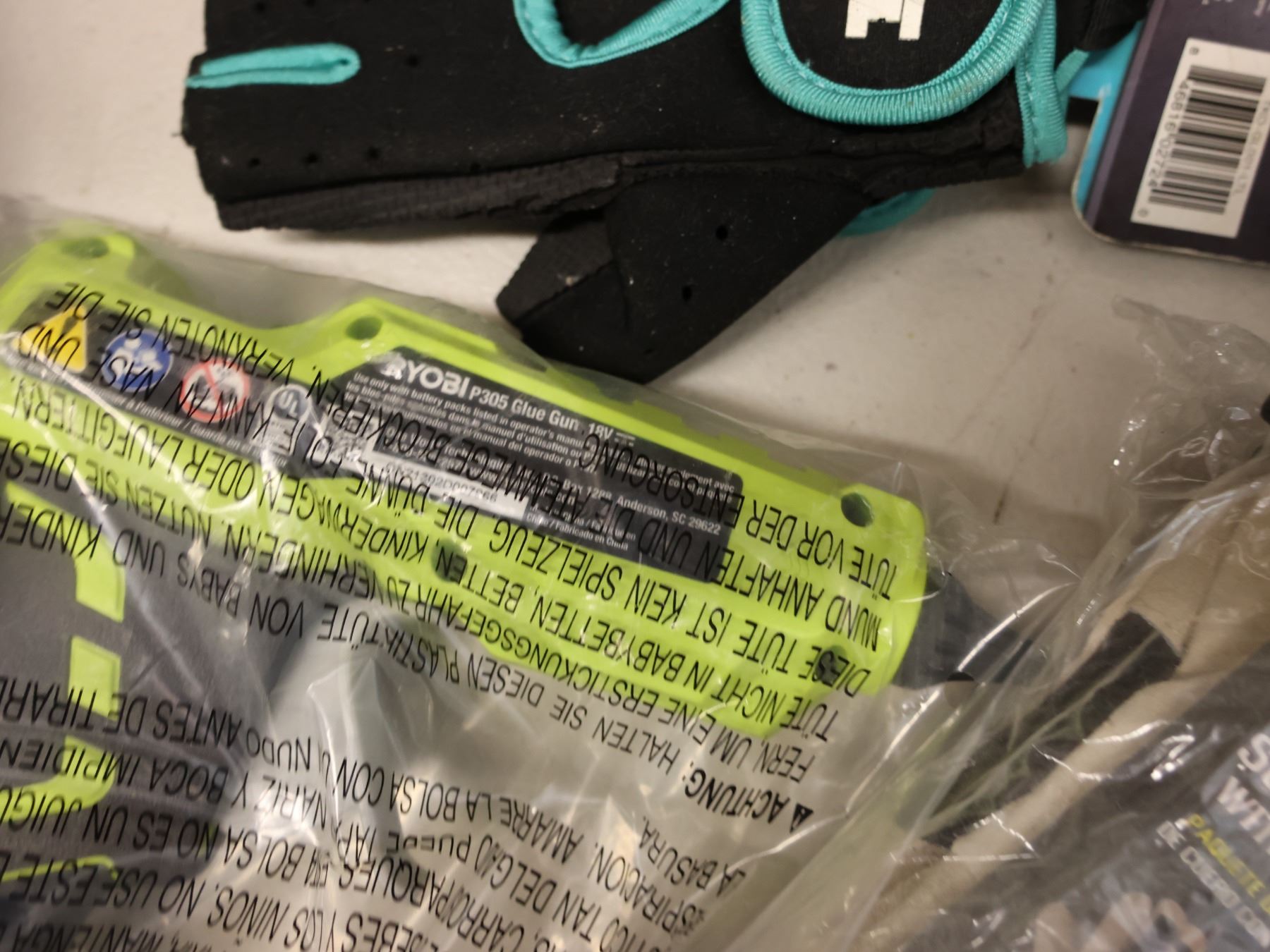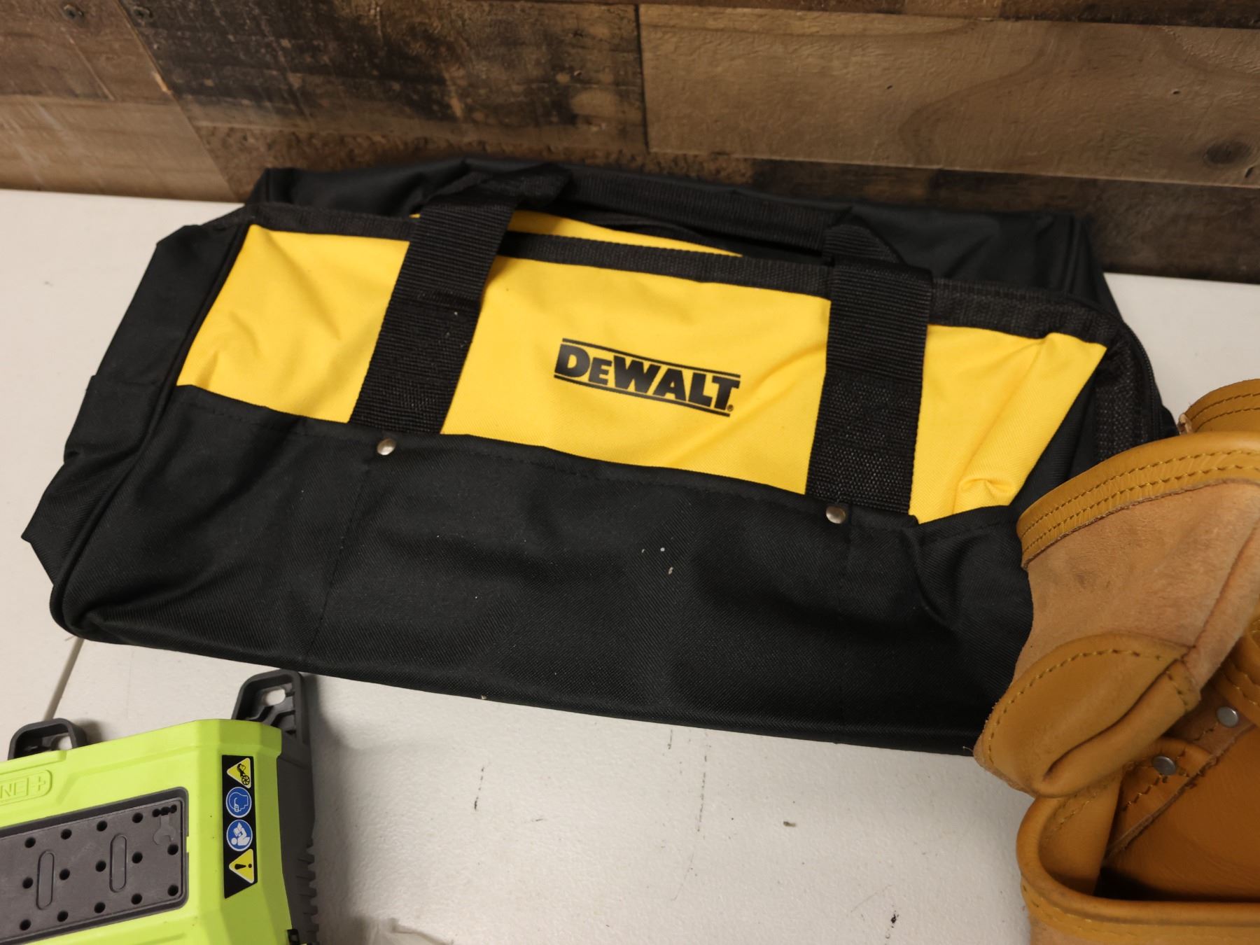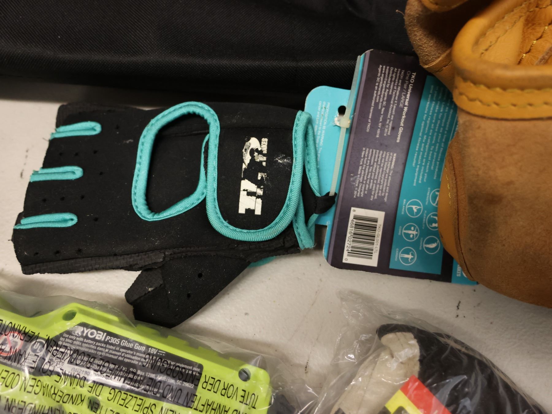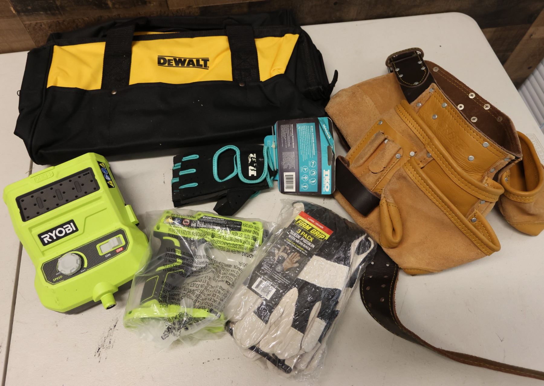AWR Tool Apron, Gloves, Ryobi Glue Gun & Rotary Tool Station in DeWalt Bag