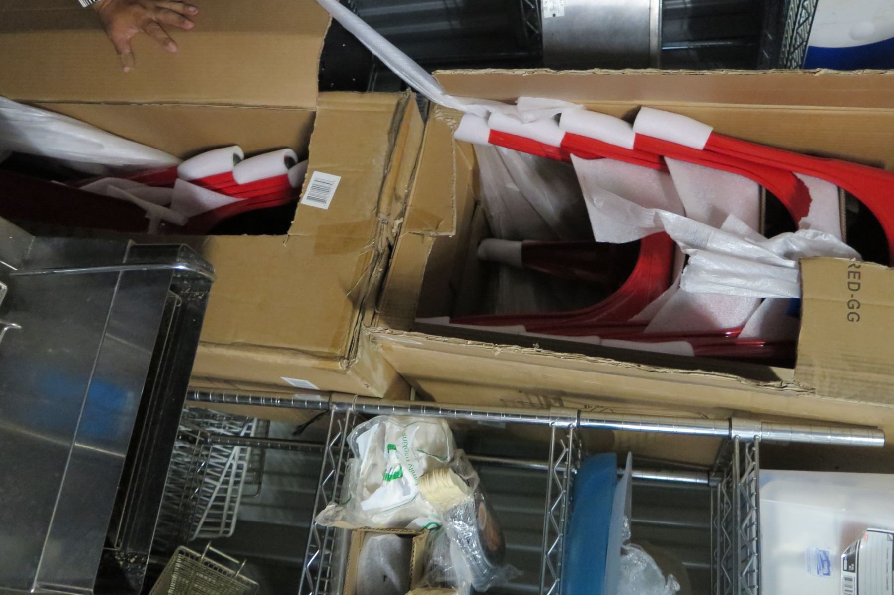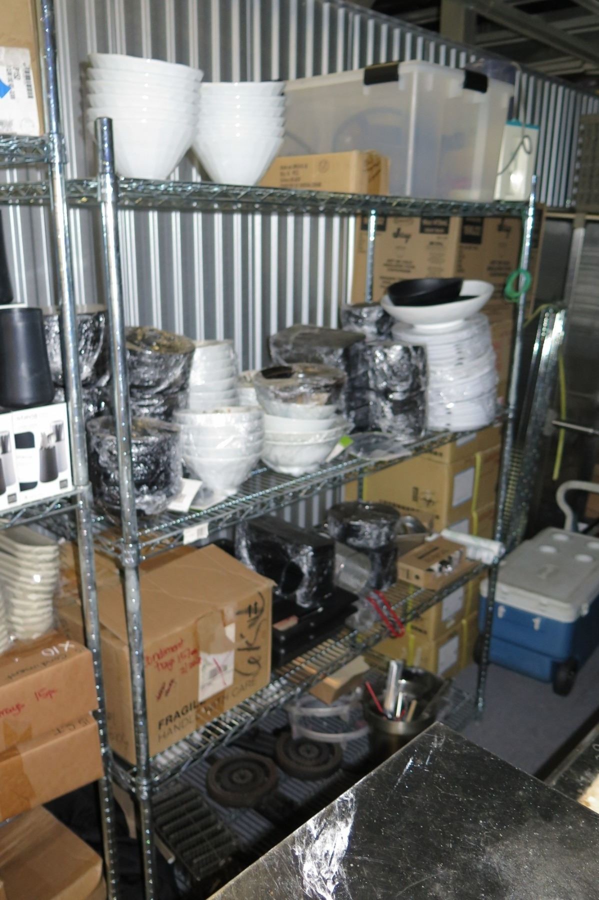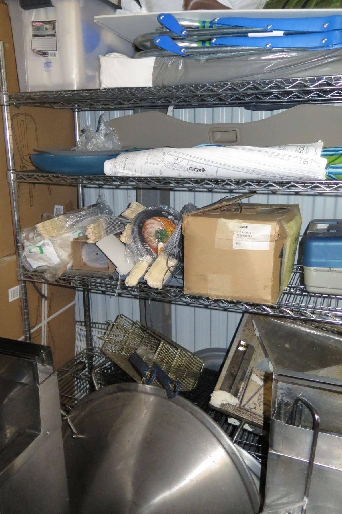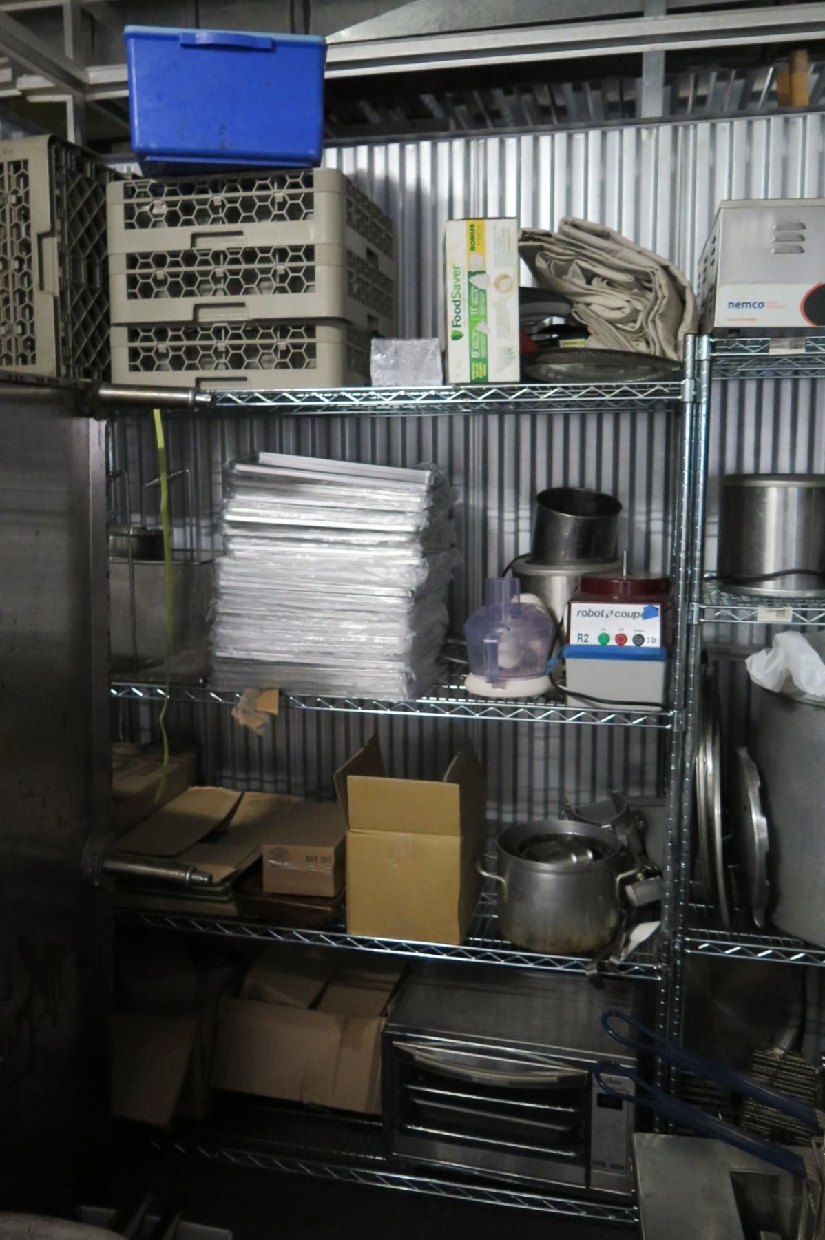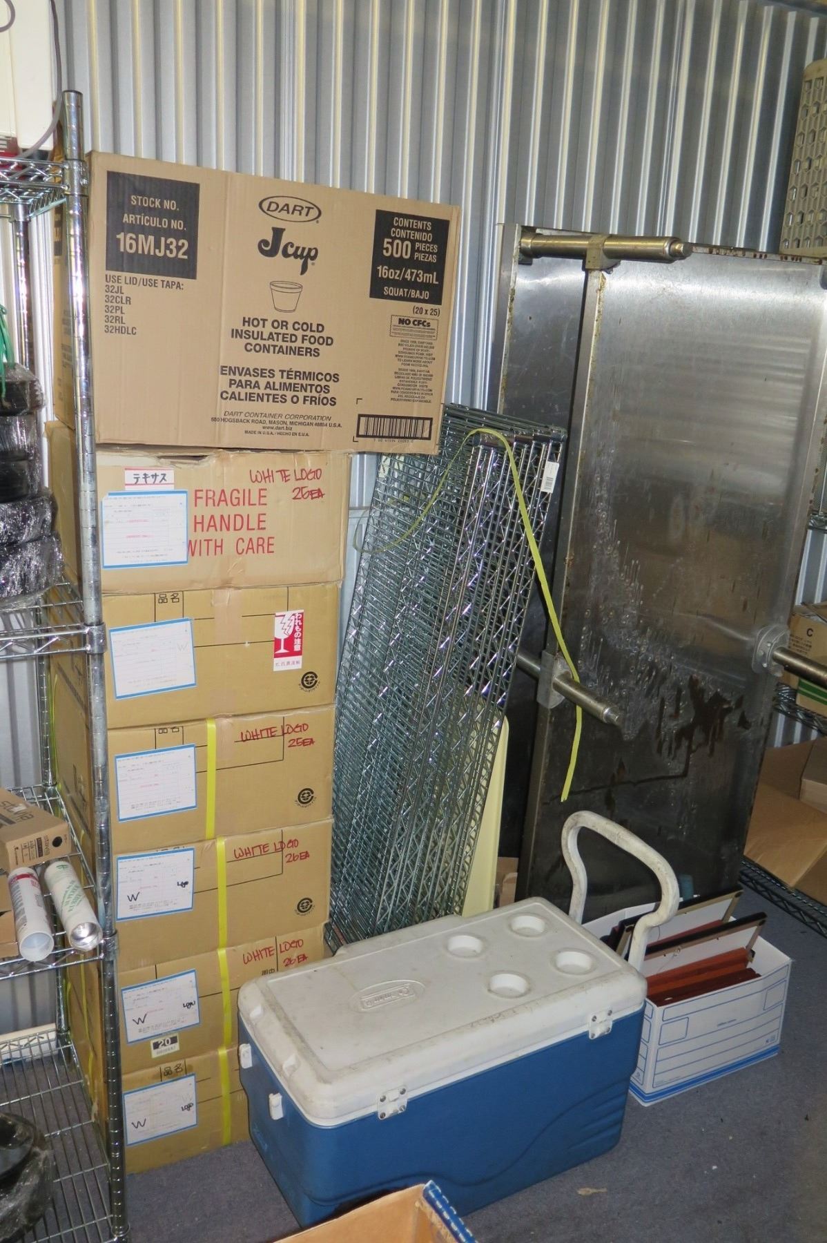 You are bidding on everything "in" the storage unit: restaurant equipment, Robot Coupe blender, 14 red retro metal barstools, sheet pans, microwaves, rice cookers, cash registers, faucets, shelving, glasses/bowls/dishes & serveware, pots, pans, foodservice supplies, shelving, burners, food warmers, faucets, containers & MORE!