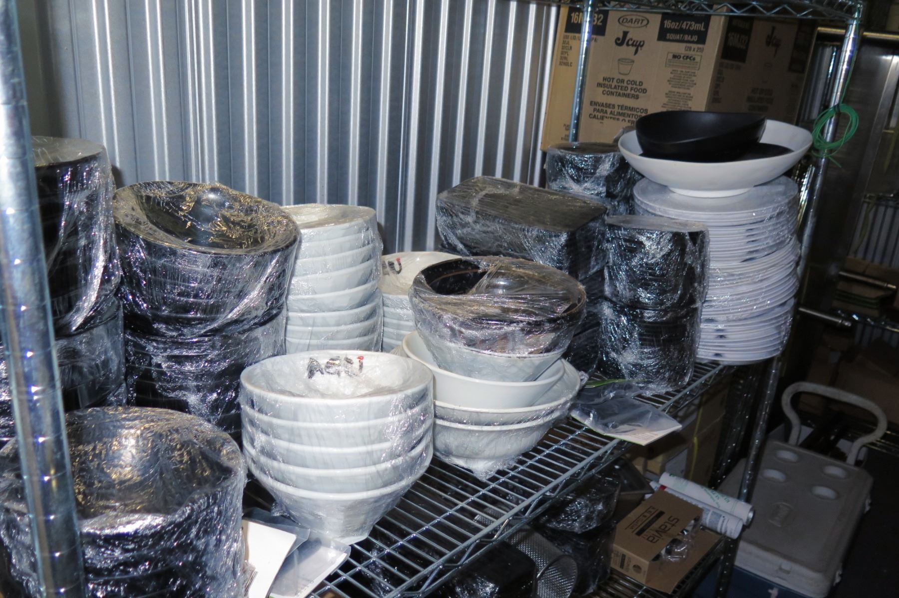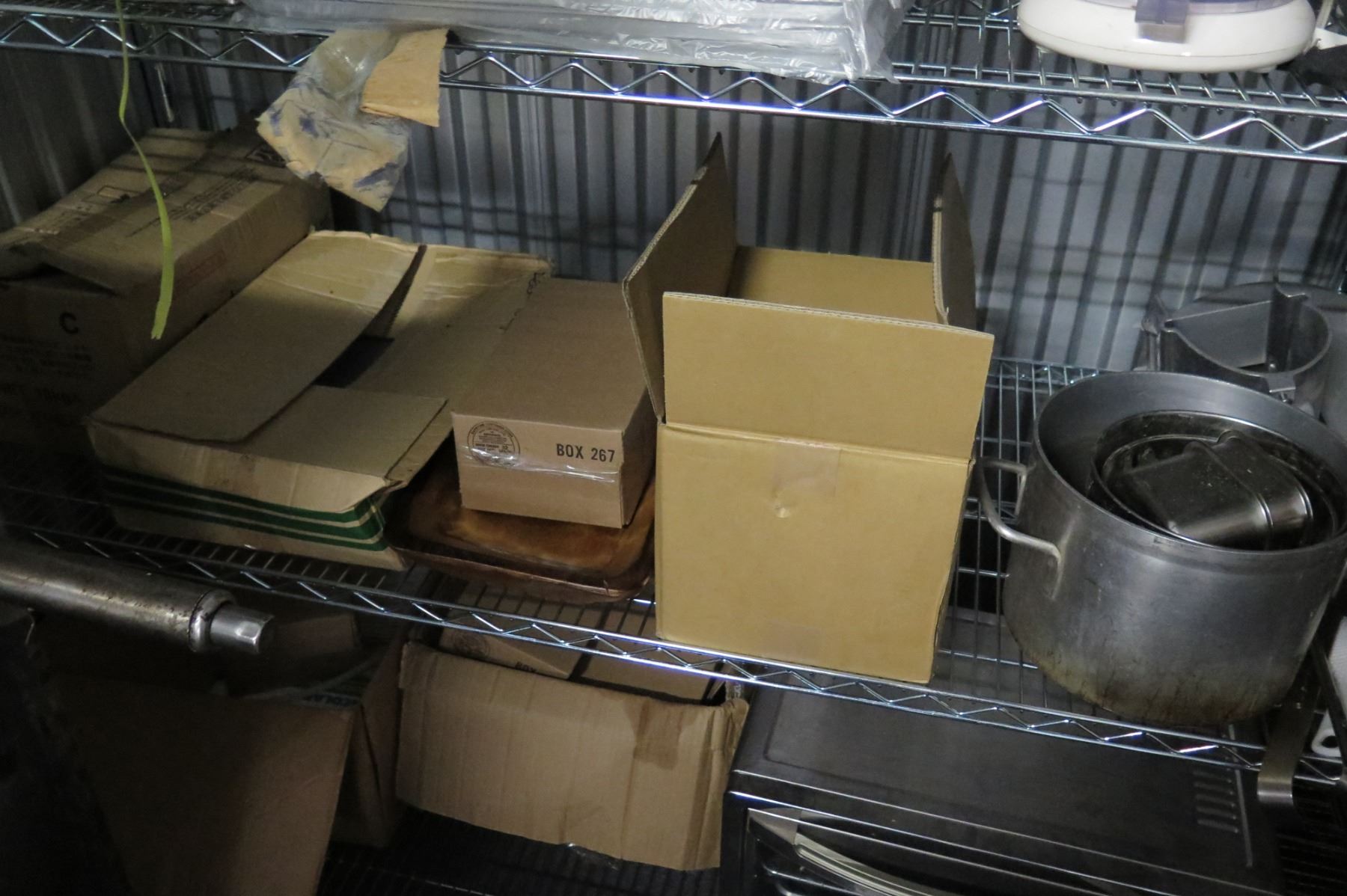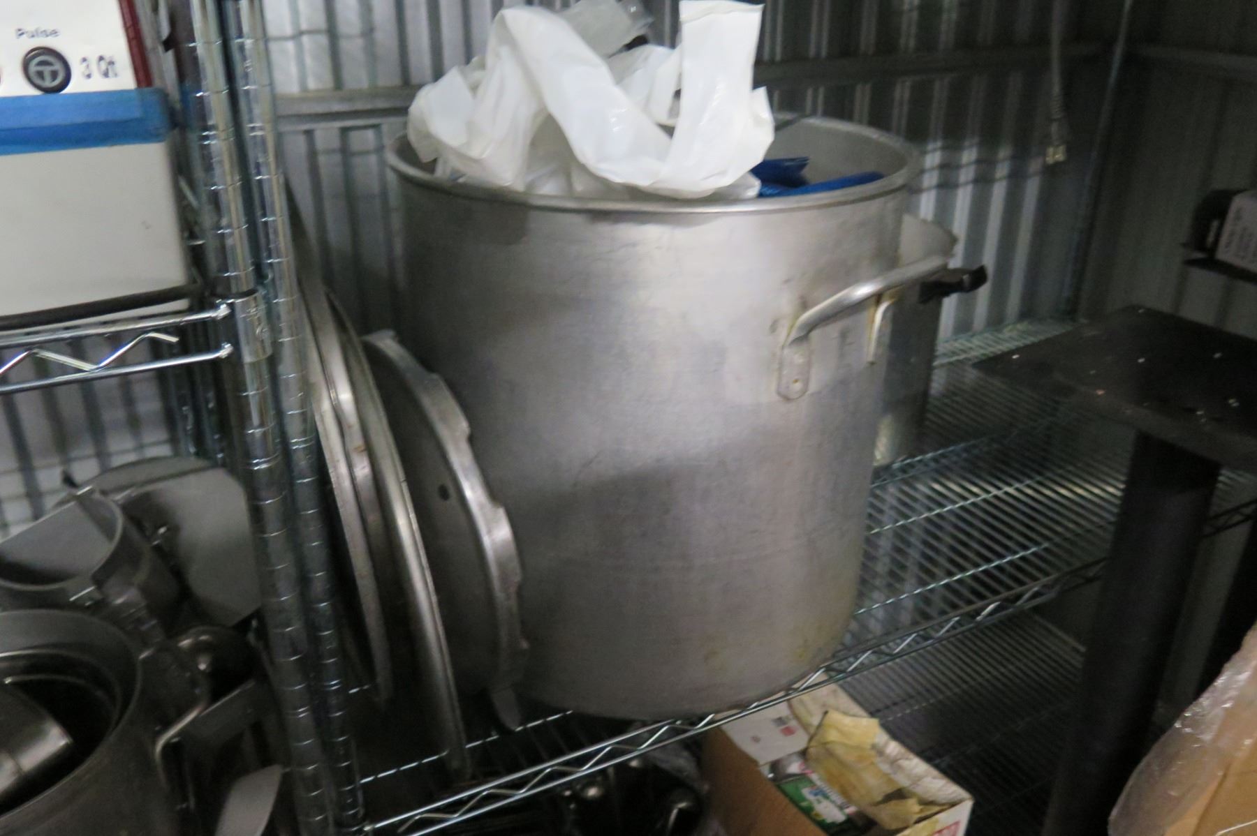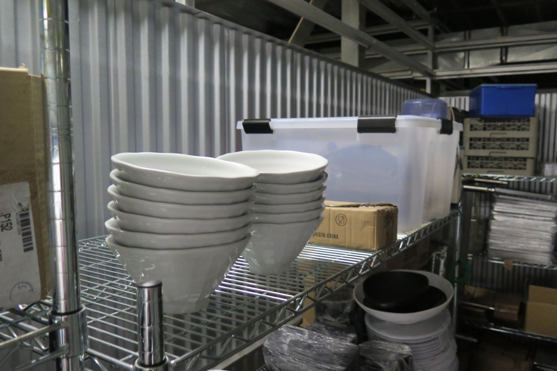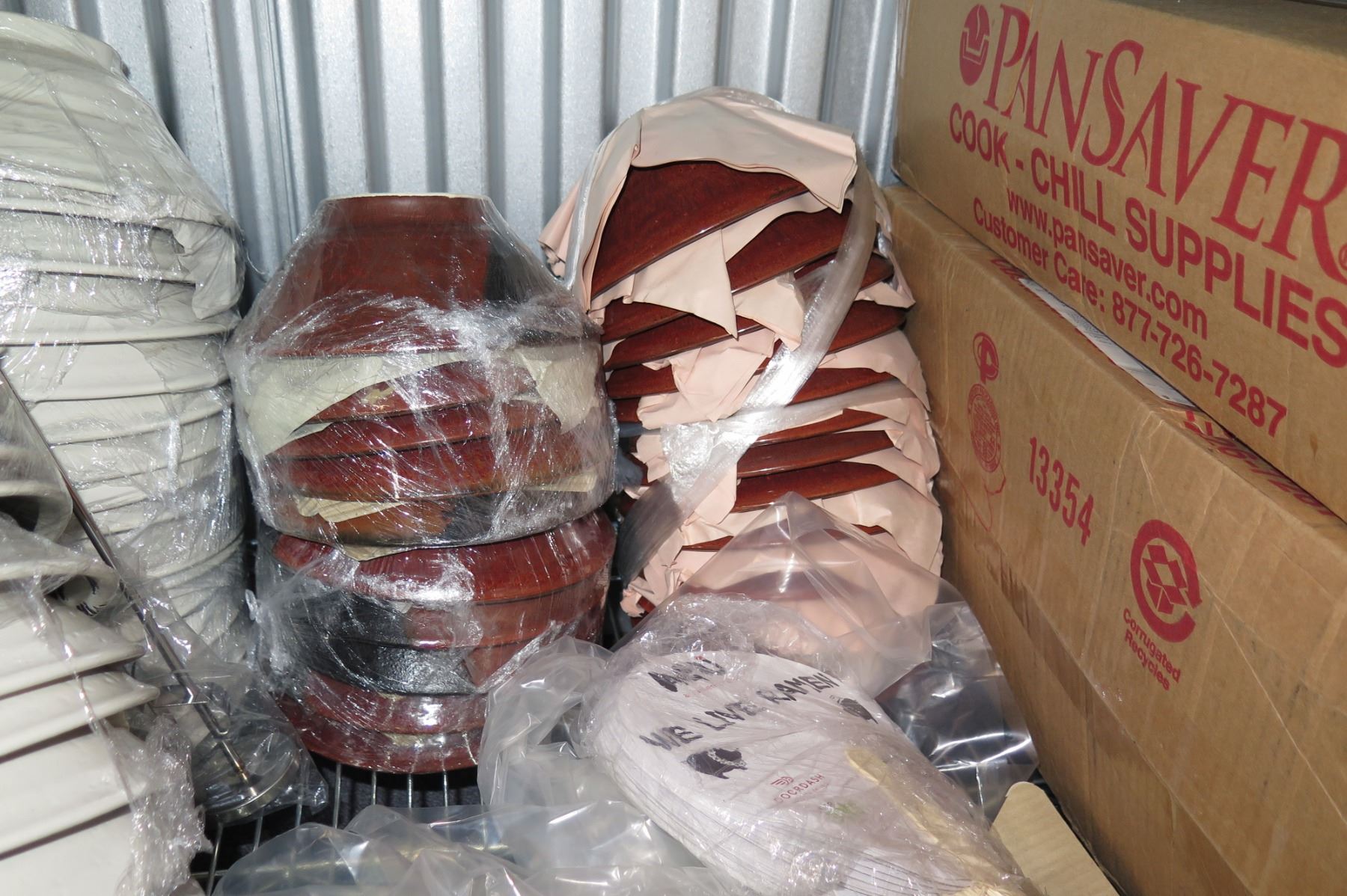You are bidding on everything "in" the storage unit: restaurant equipment, Robot Coupe blender, 14 red retro metal barstools, sheet pans, microwaves, rice cookers, cash registers, faucets, shelving, glasses/bowls/dishes & serveware, pots, pans, foodservice supplies, shelving, burners, food warmers, faucets, containers & MORE!