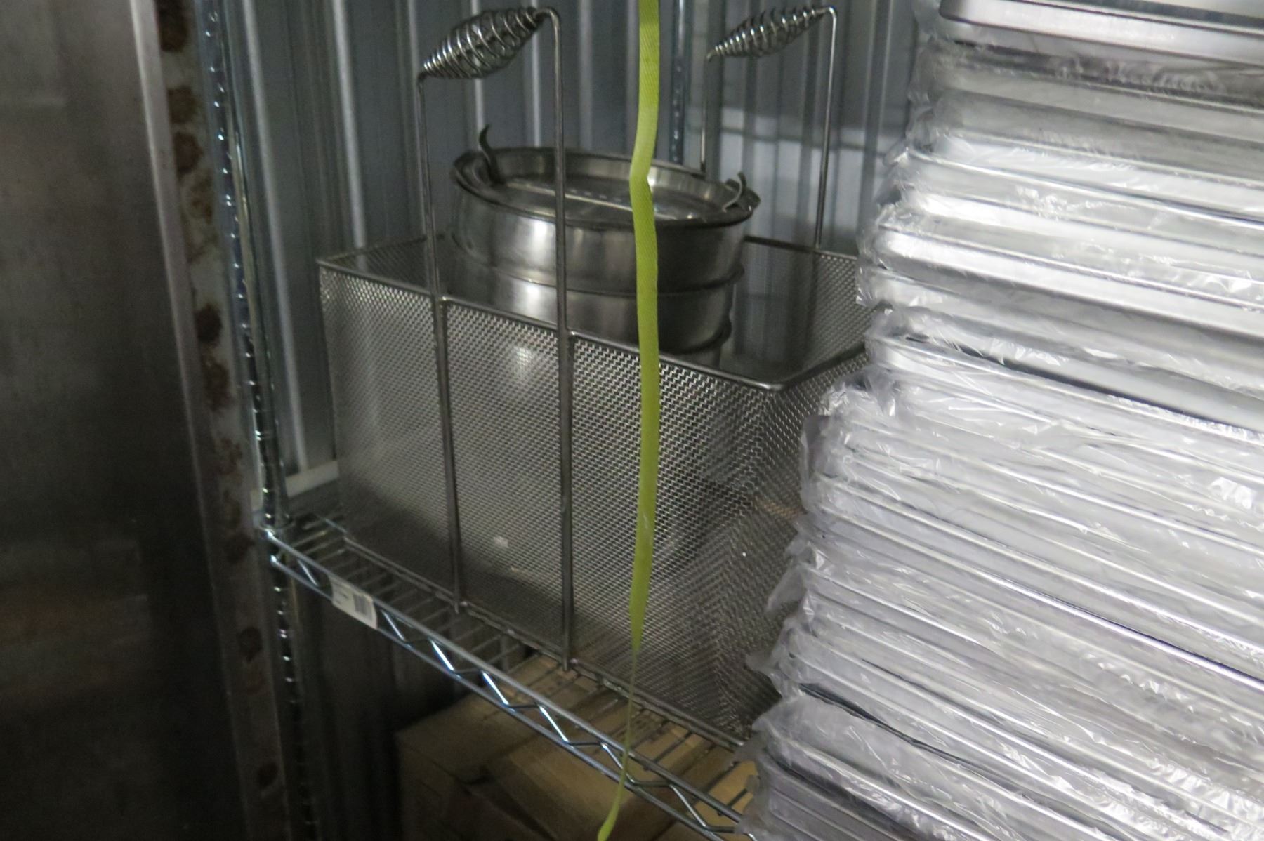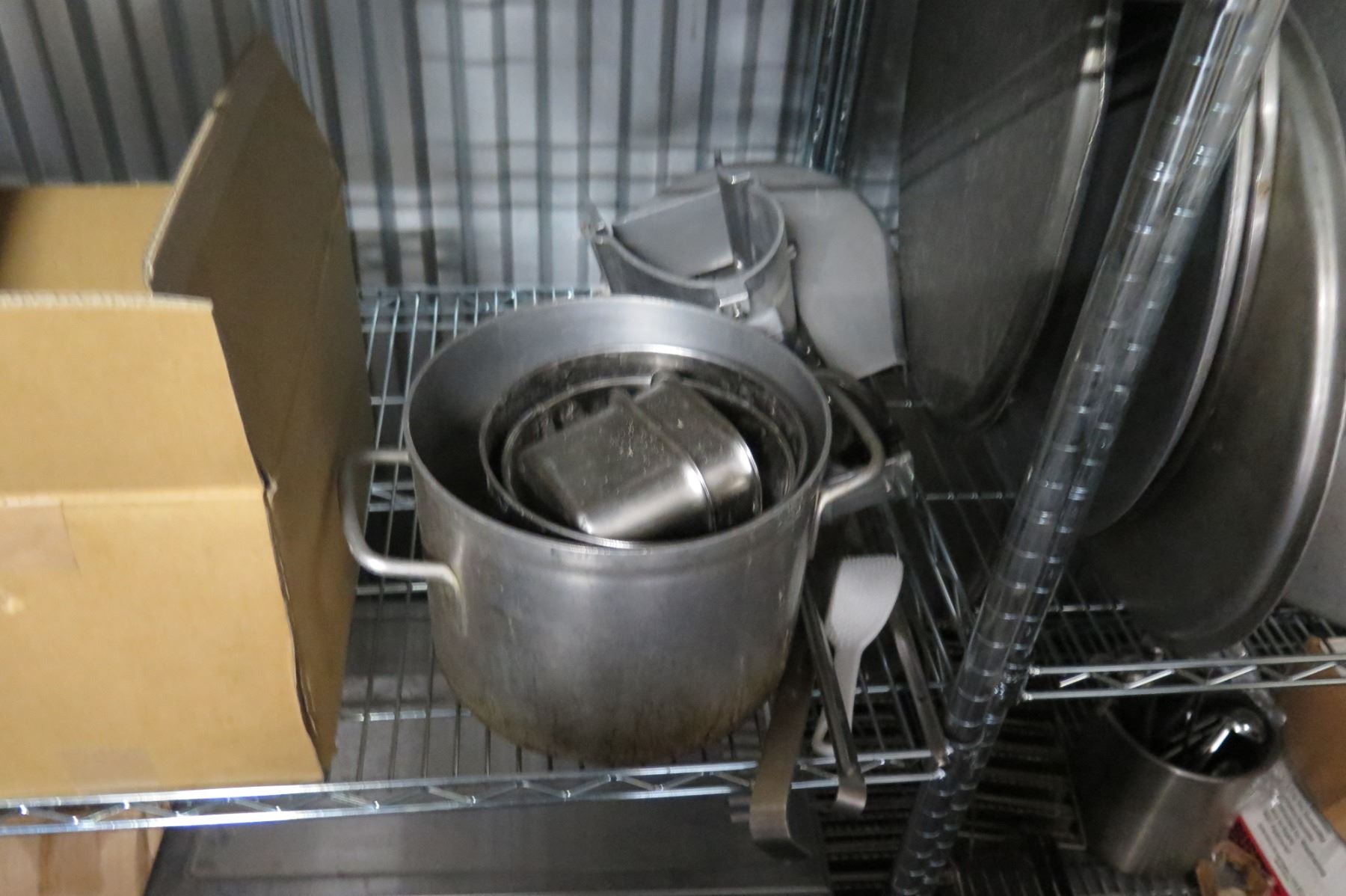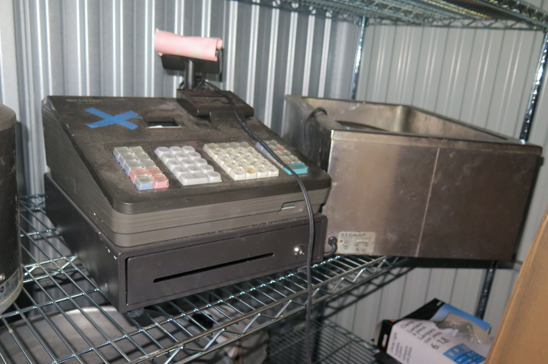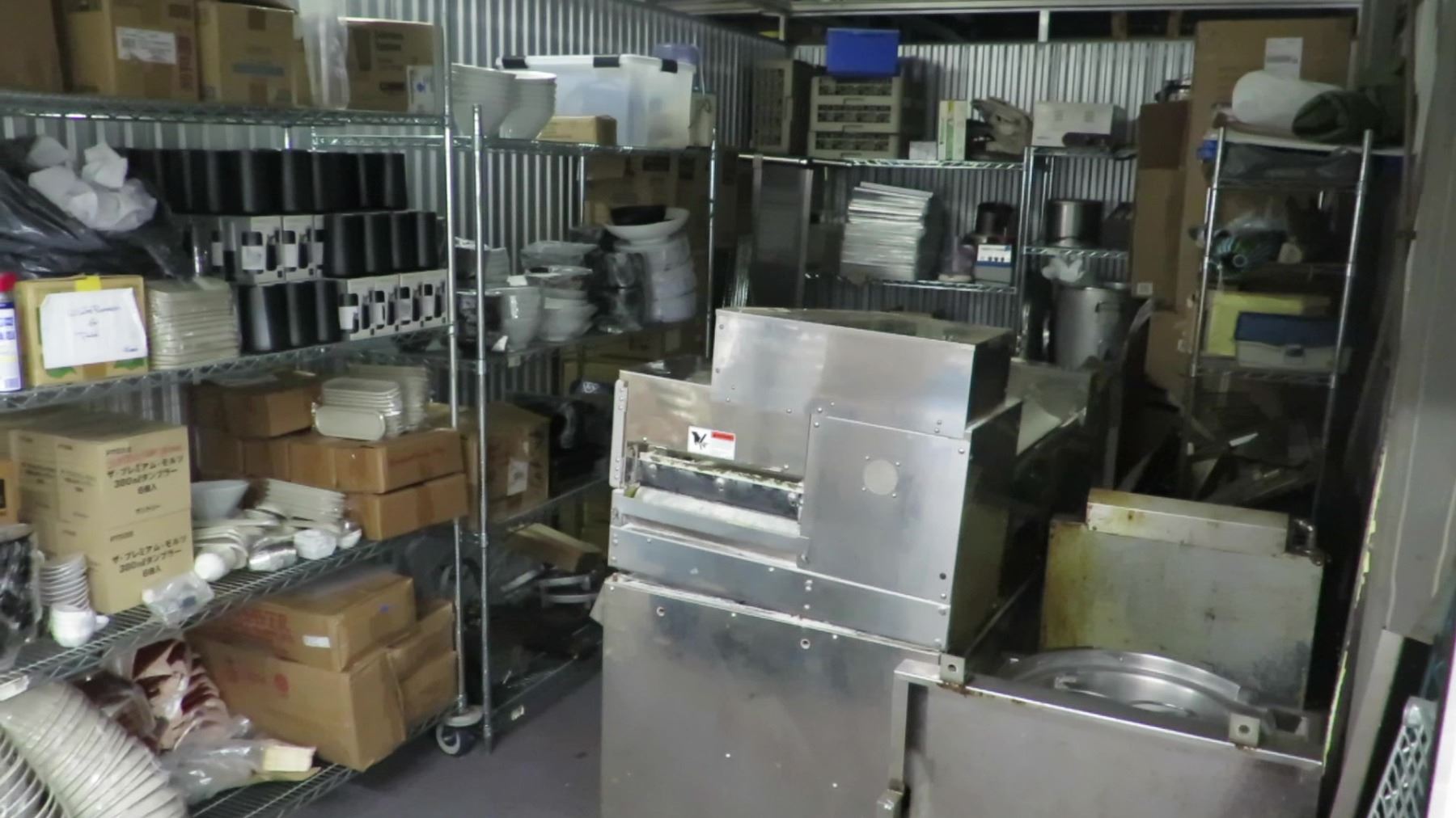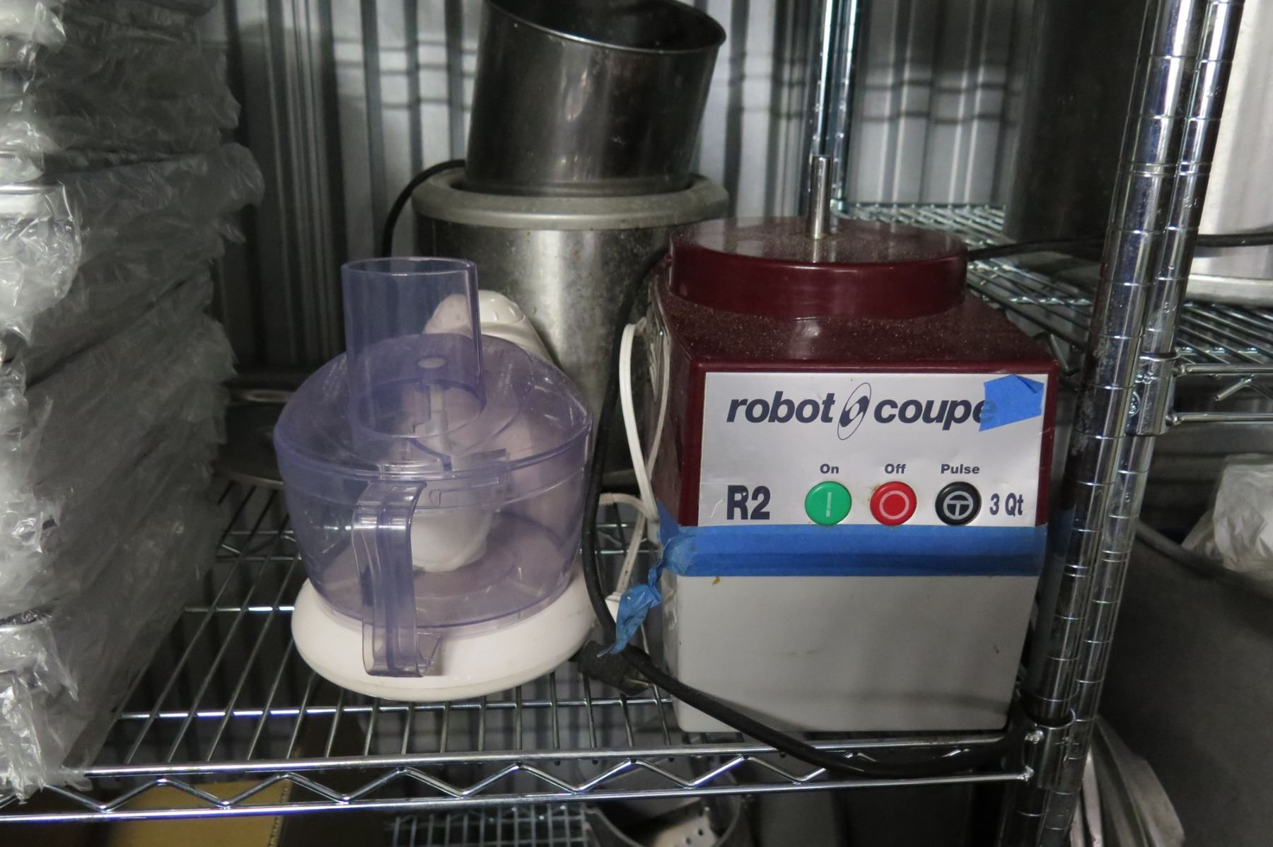You are bidding on everything "in" the storage unit: restaurant equipment, Robot Coupe blender, 14 red retro metal barstools, sheet pans, microwaves, rice cookers, cash registers, faucets, shelving, glasses/bowls/dishes & serveware, pots, pans, foodservice supplies, shelving, burners, food warmers, faucets, containers & MORE!