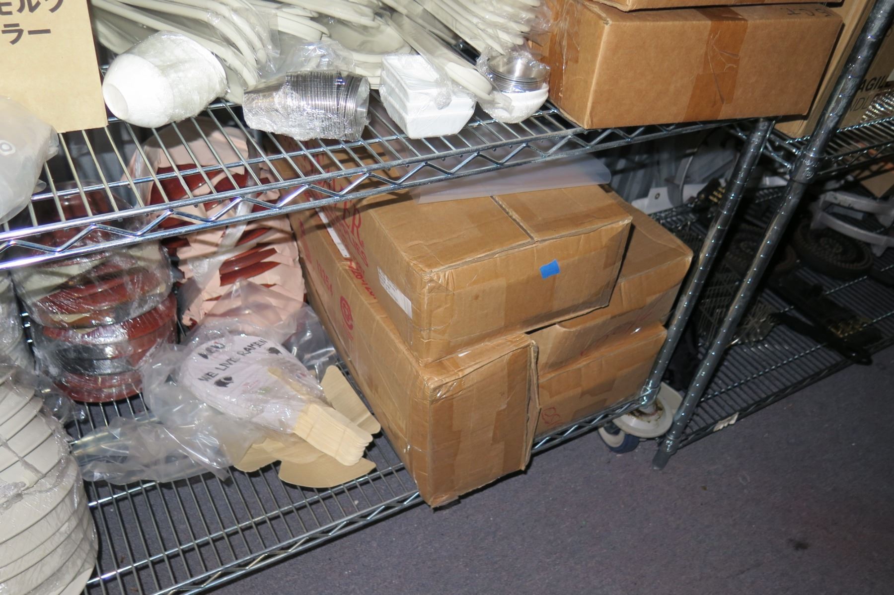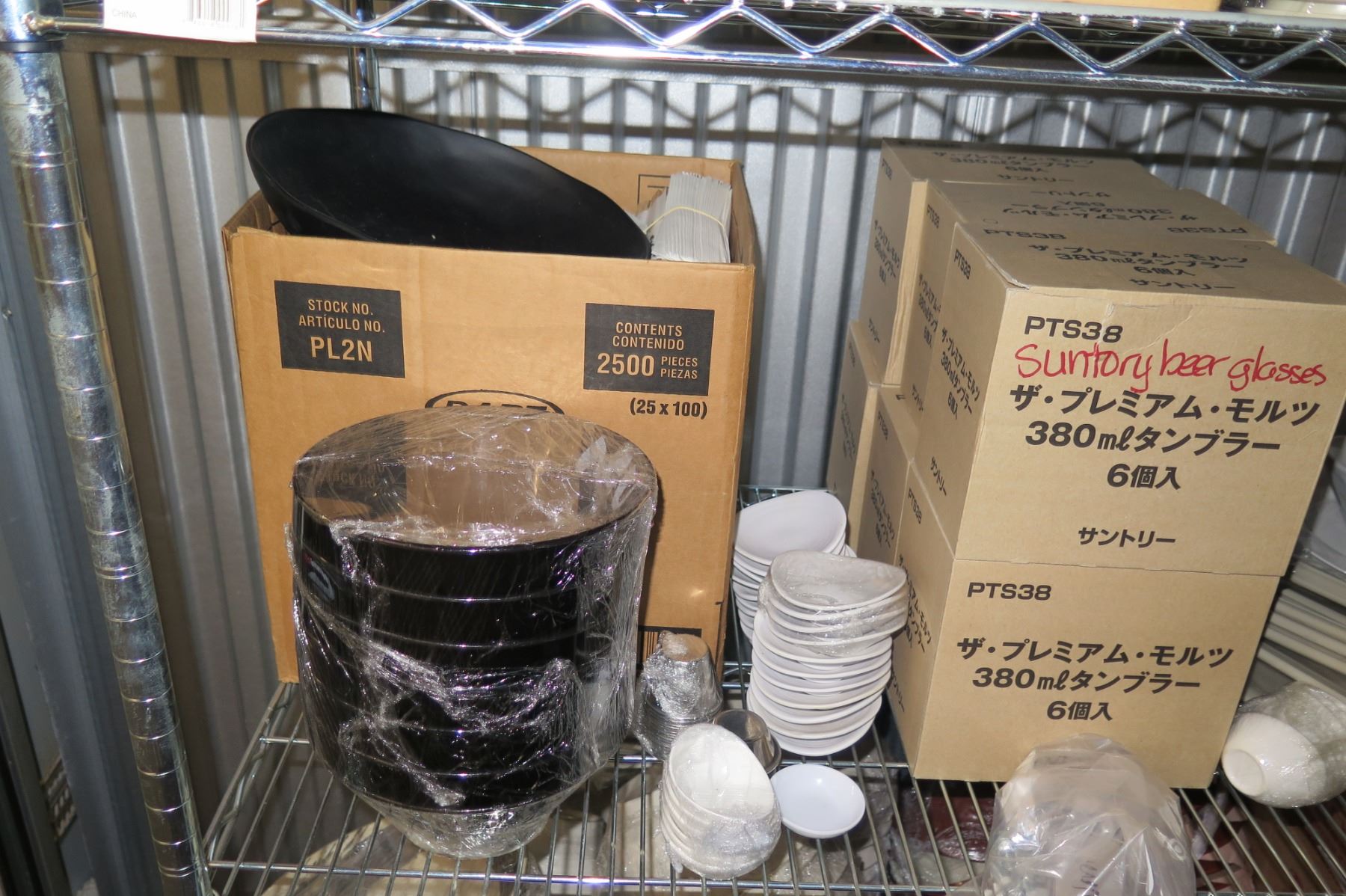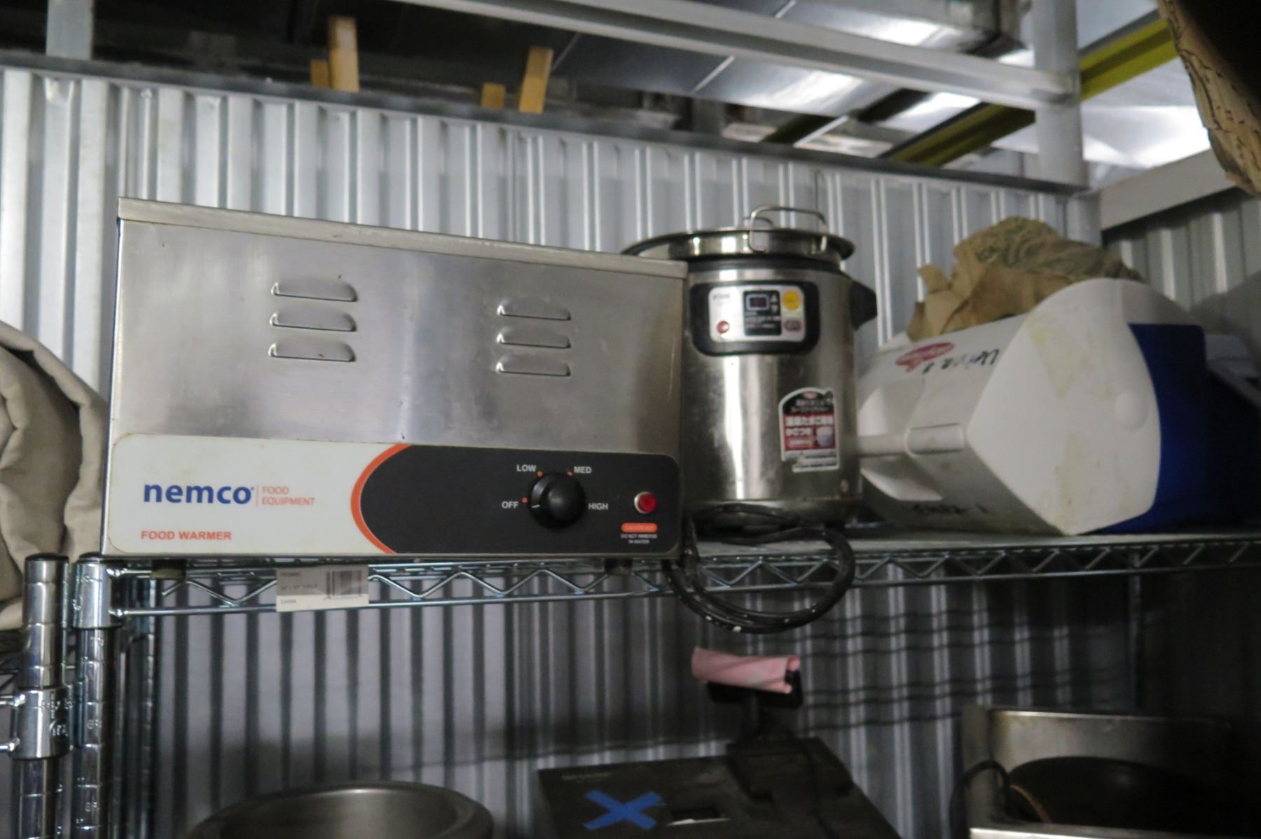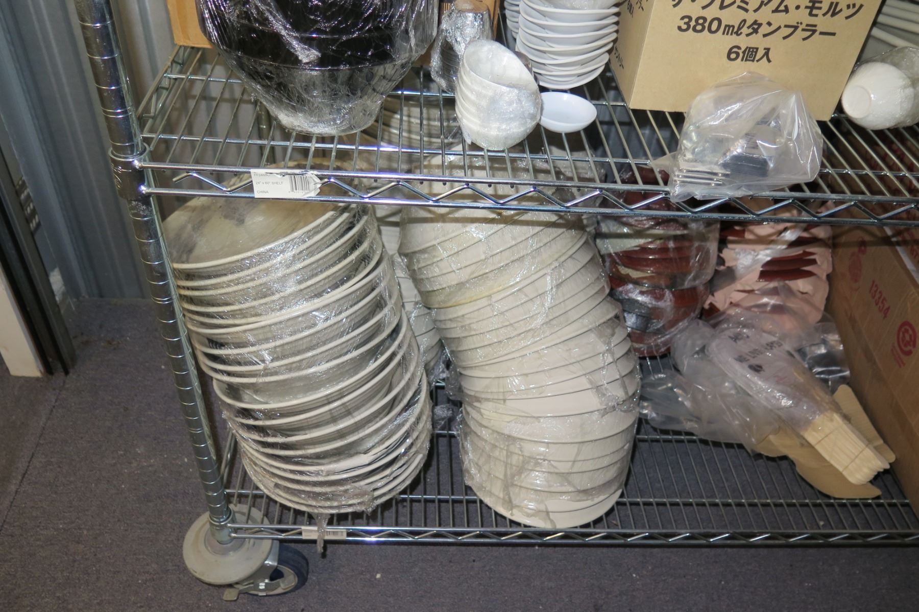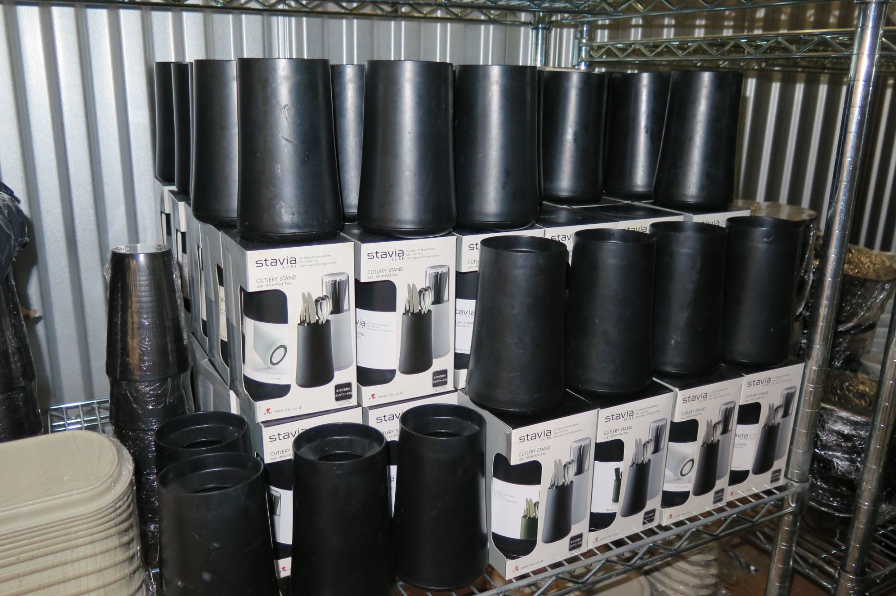 You are bidding on everything "in" the storage unit: restaurant equipment, Robot Coupe blender, 14 red retro metal barstools, sheet pans, microwaves, rice cookers, cash registers, faucets, shelving, glasses/bowls/dishes & serveware, pots, pans, foodservice supplies, shelving, burners, food warmers, faucets, containers & MORE!