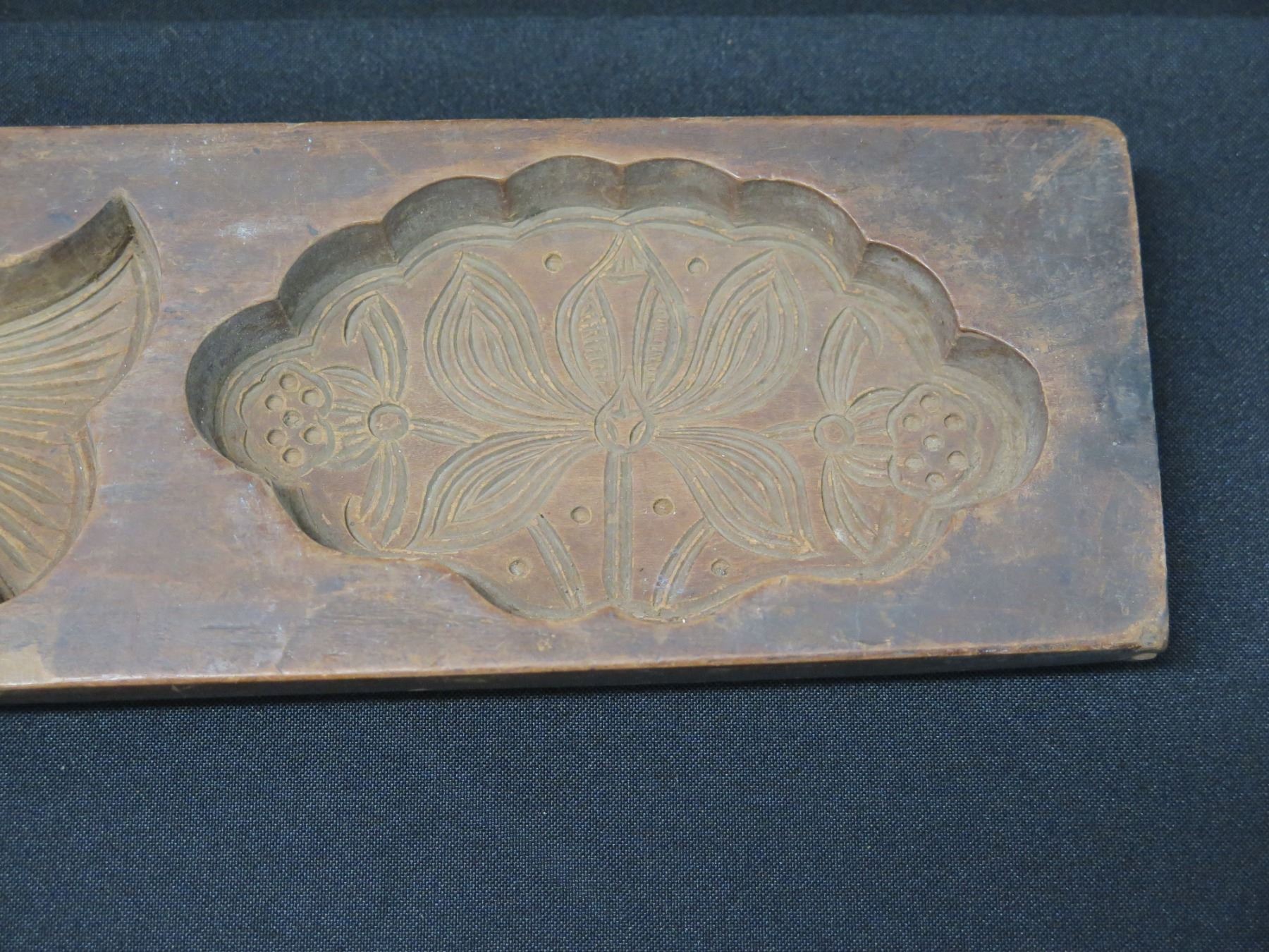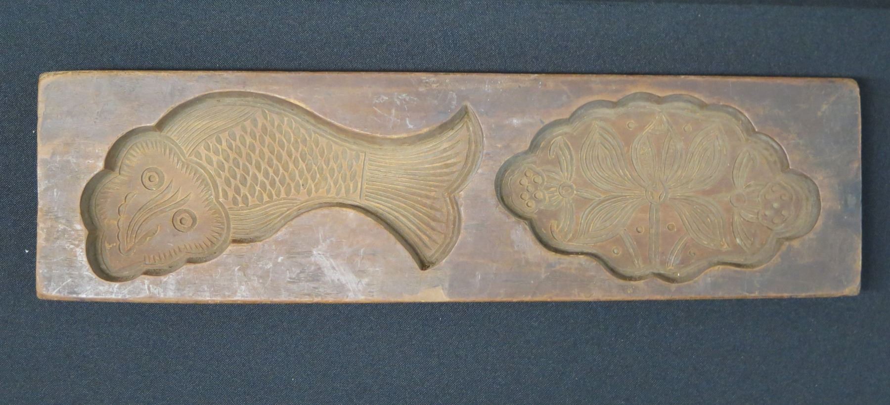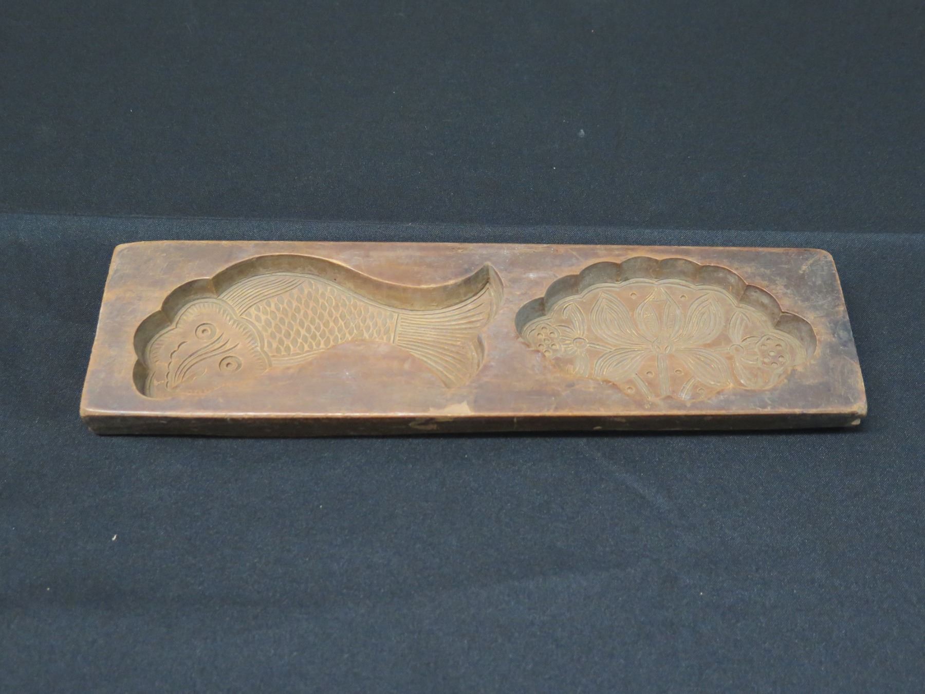 Antique Chinese Koi & Lotus Double Cake Mold 13" x 3.25". Seller reports that this was purchased from the Honolulu Academy of Arts gift shop.