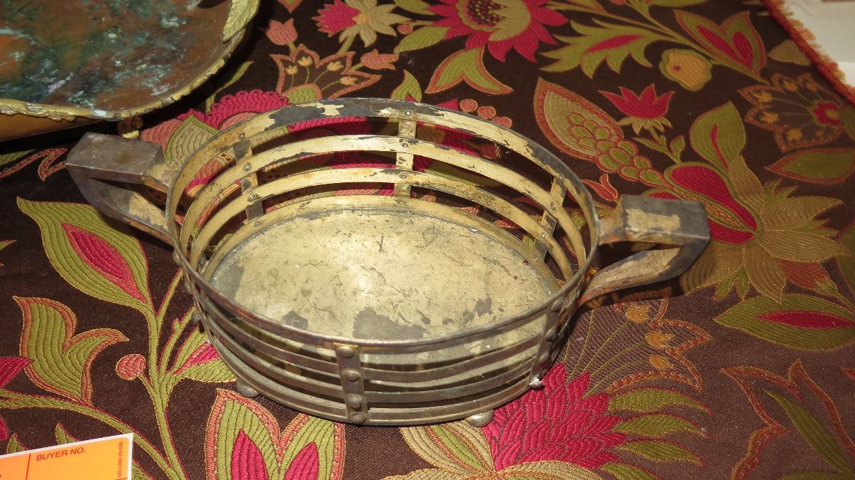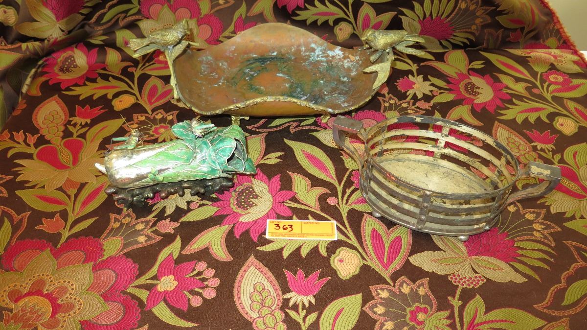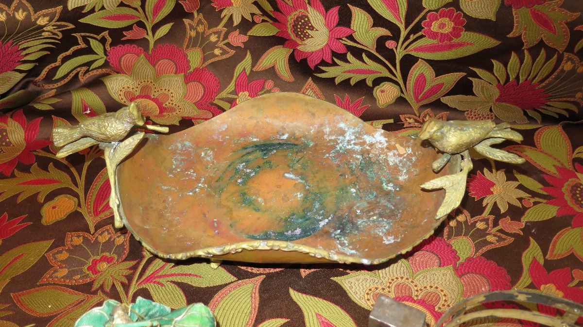 Antique Copper Plated Brass Tray w/Bird Ornamented Handles, Antique Metal Overlay Piece w/Crickets, Round Metal Basket