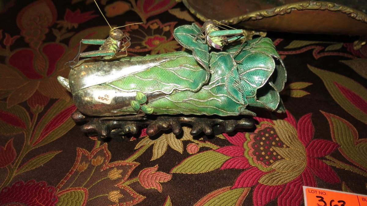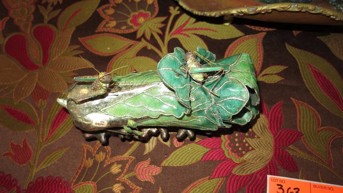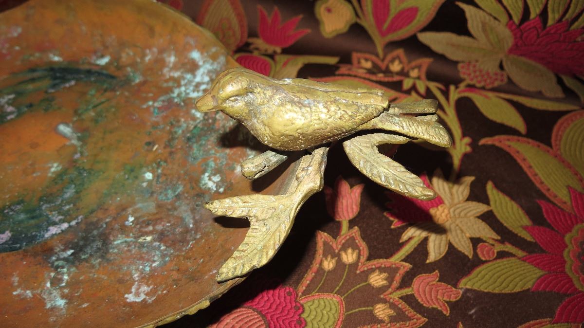 Antique Copper Plated Brass Tray w/Bird Ornamented Handles, Antique Metal Overlay Piece w/Crickets,