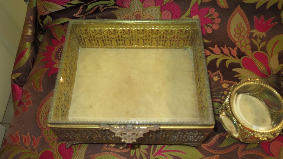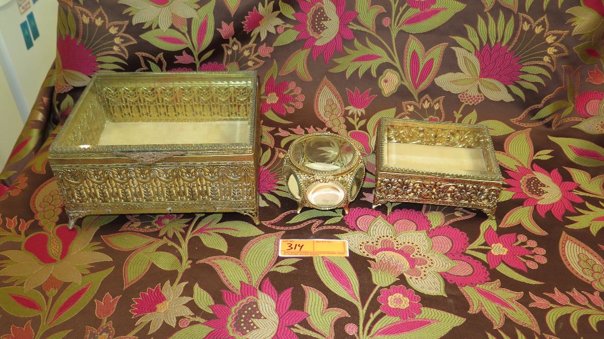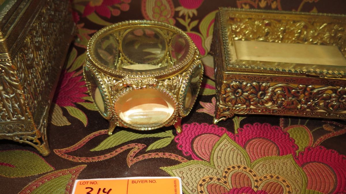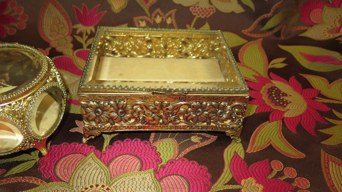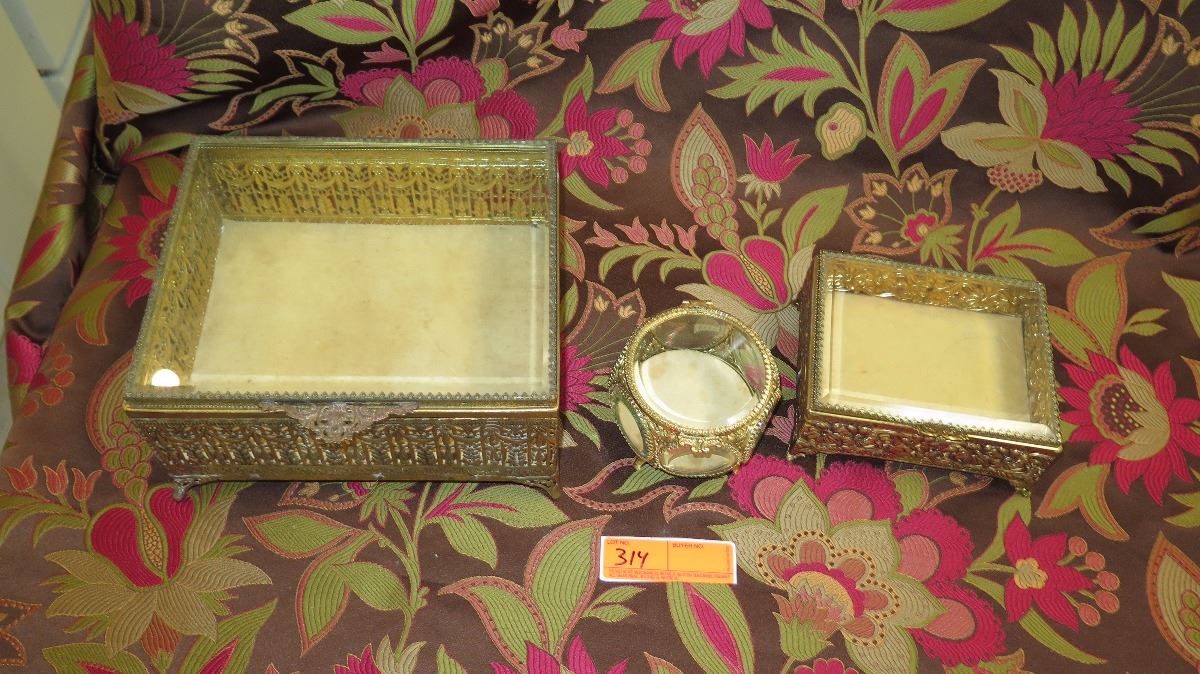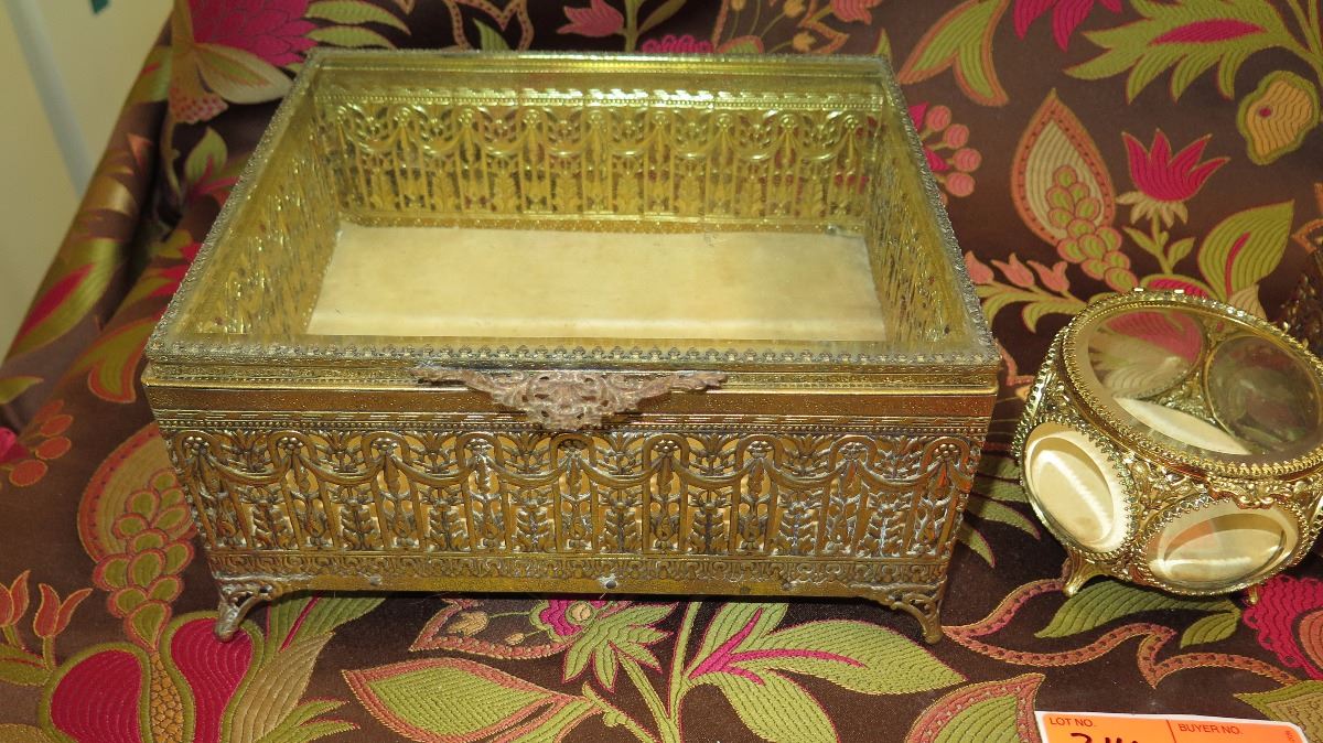 Antique Filigree Metal Boxes w/Gilt Overlay and Glass Lids