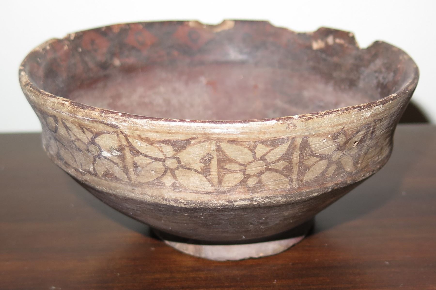 Antique Pottery w/Geometric Design, Some Damage, 5" Dia.
