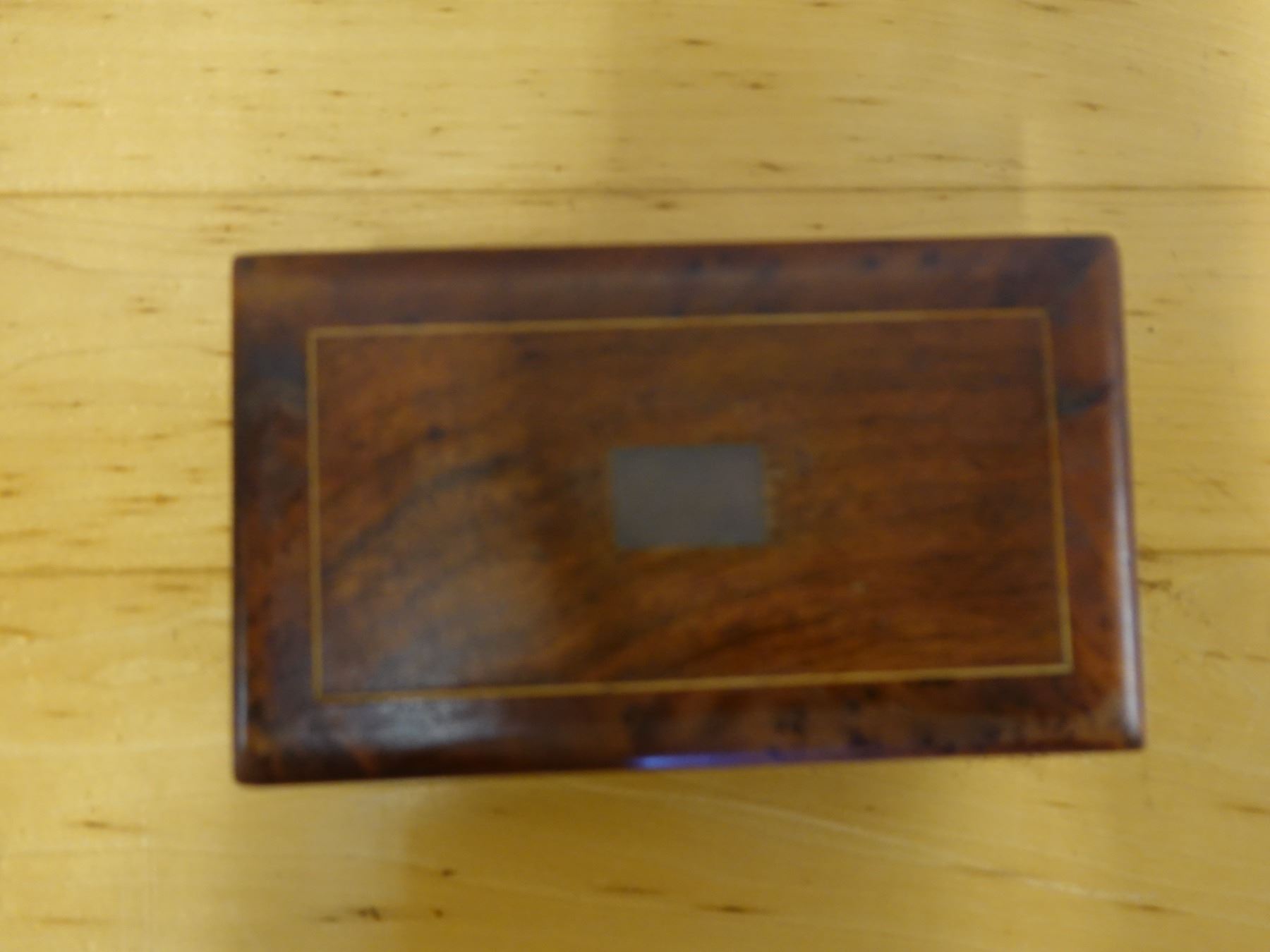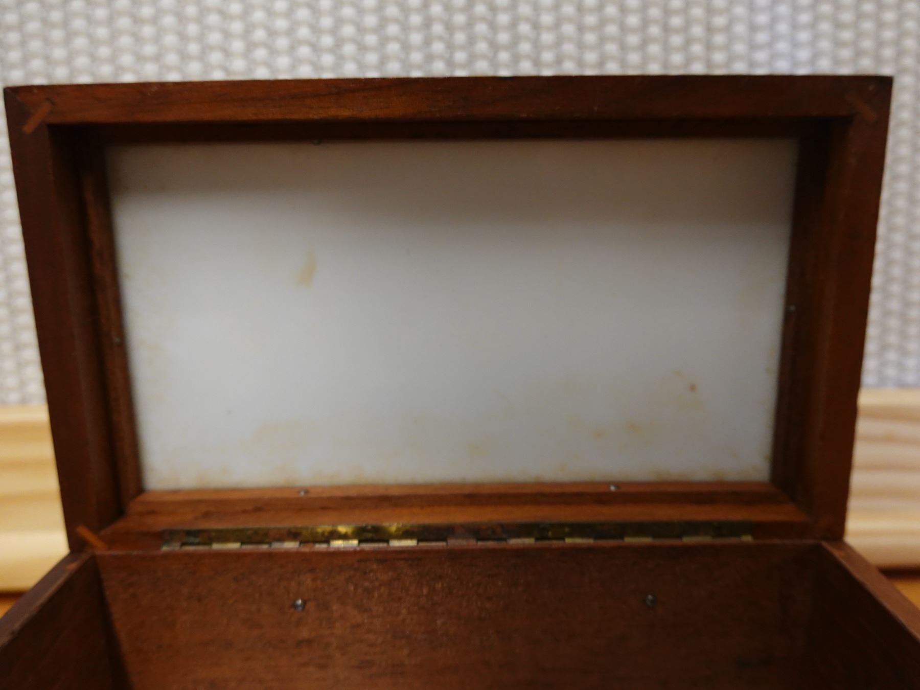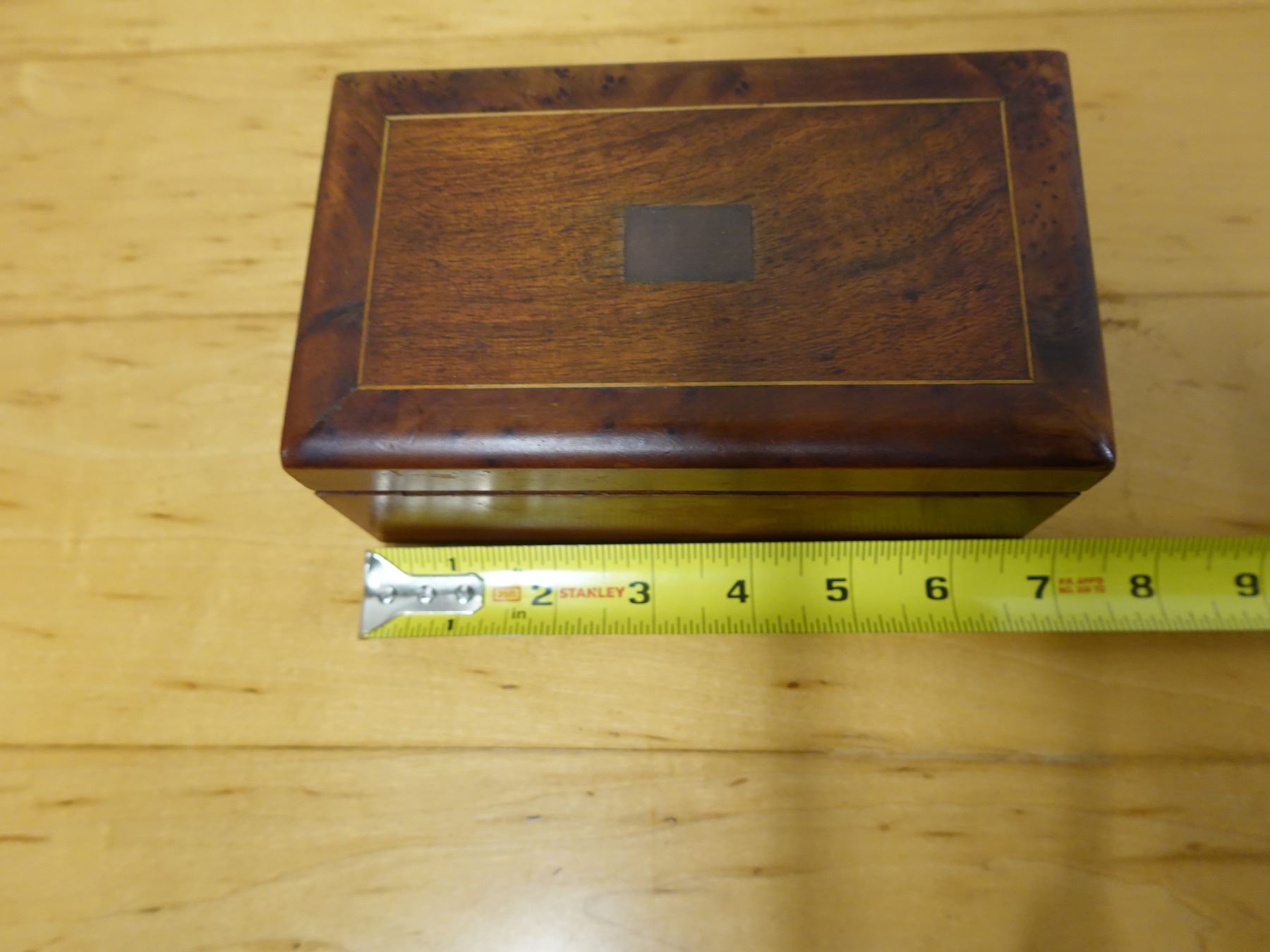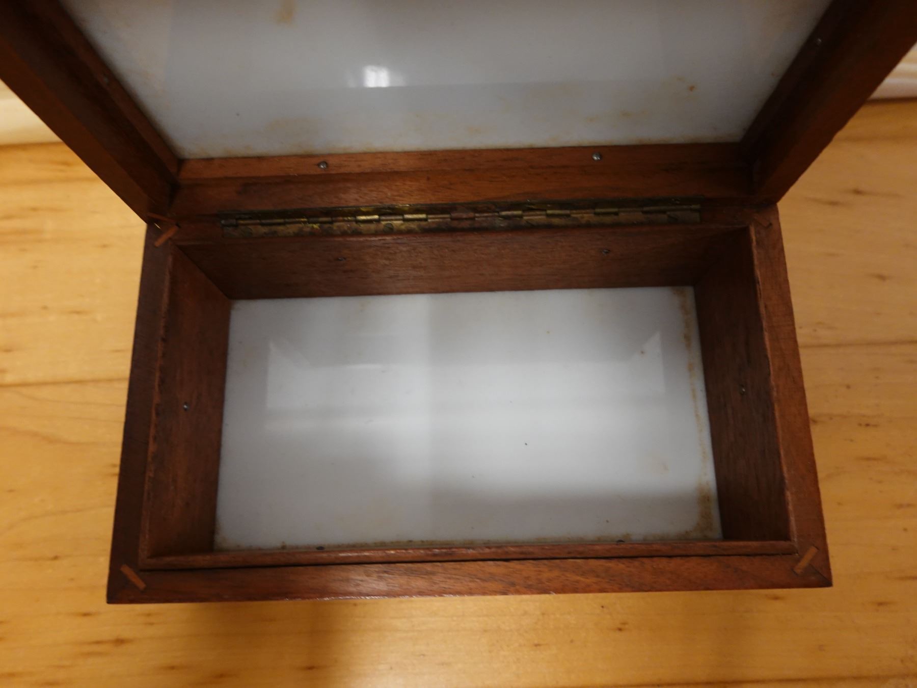 Antique Wooden Rectangular Box w/ Hinged Lid & Inlay Top, Interior Appears to be Lined w/ Milk Glass 6.5" x 3.5" x 3"H