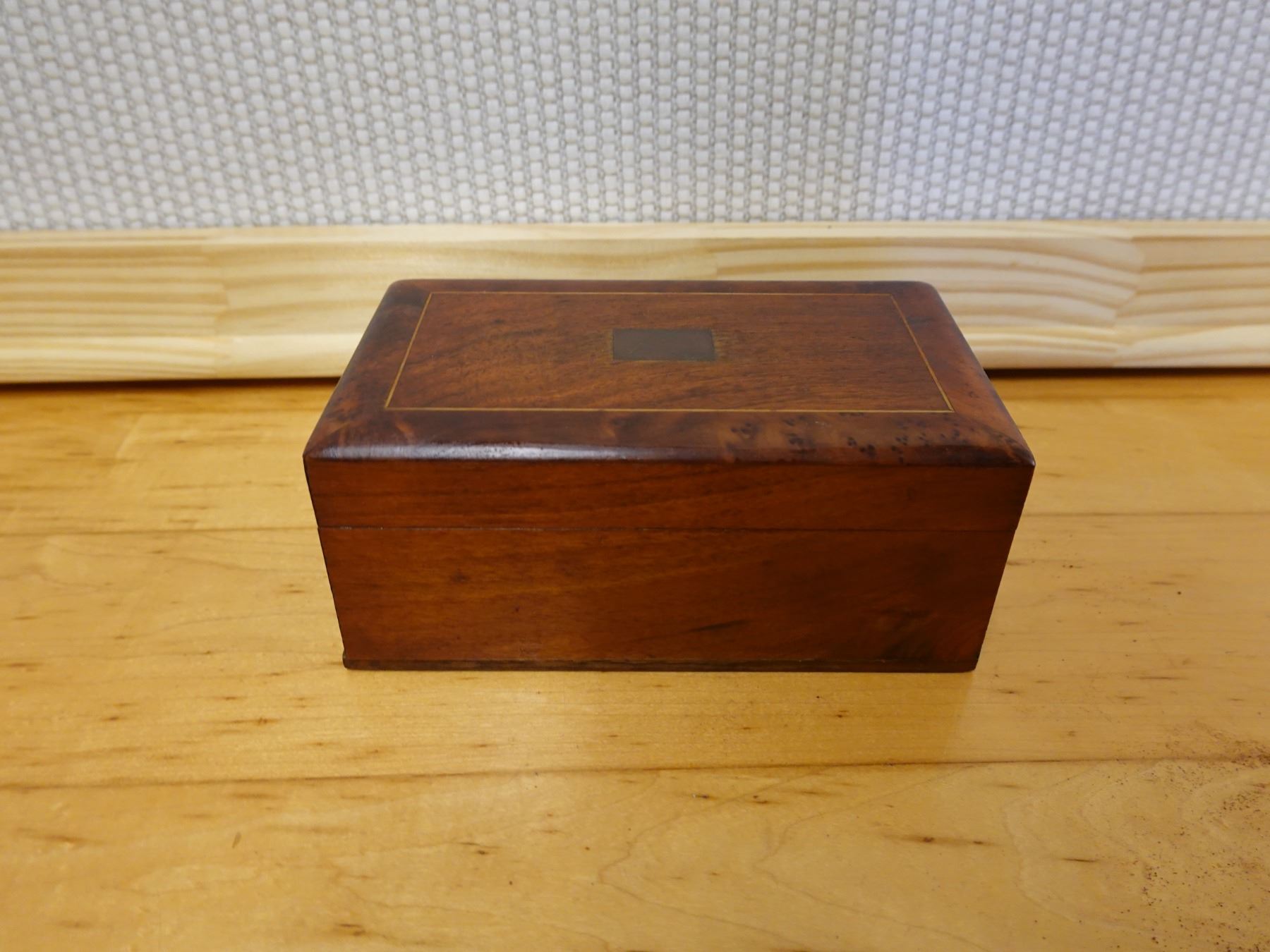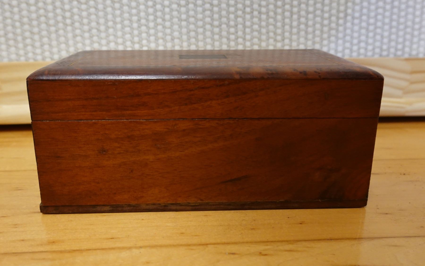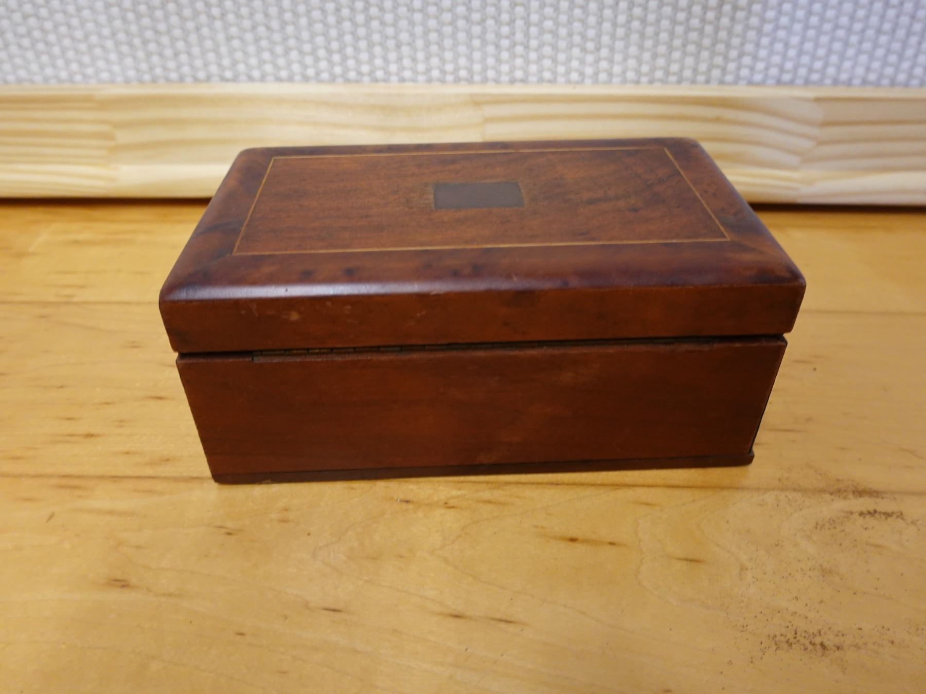 Antique Wooden Rectangular Box w/ Hinged Lid & Inlay Top, Interior Appears to be Lined w/ Milk Glass 6.5" x 3.5" x 3"H