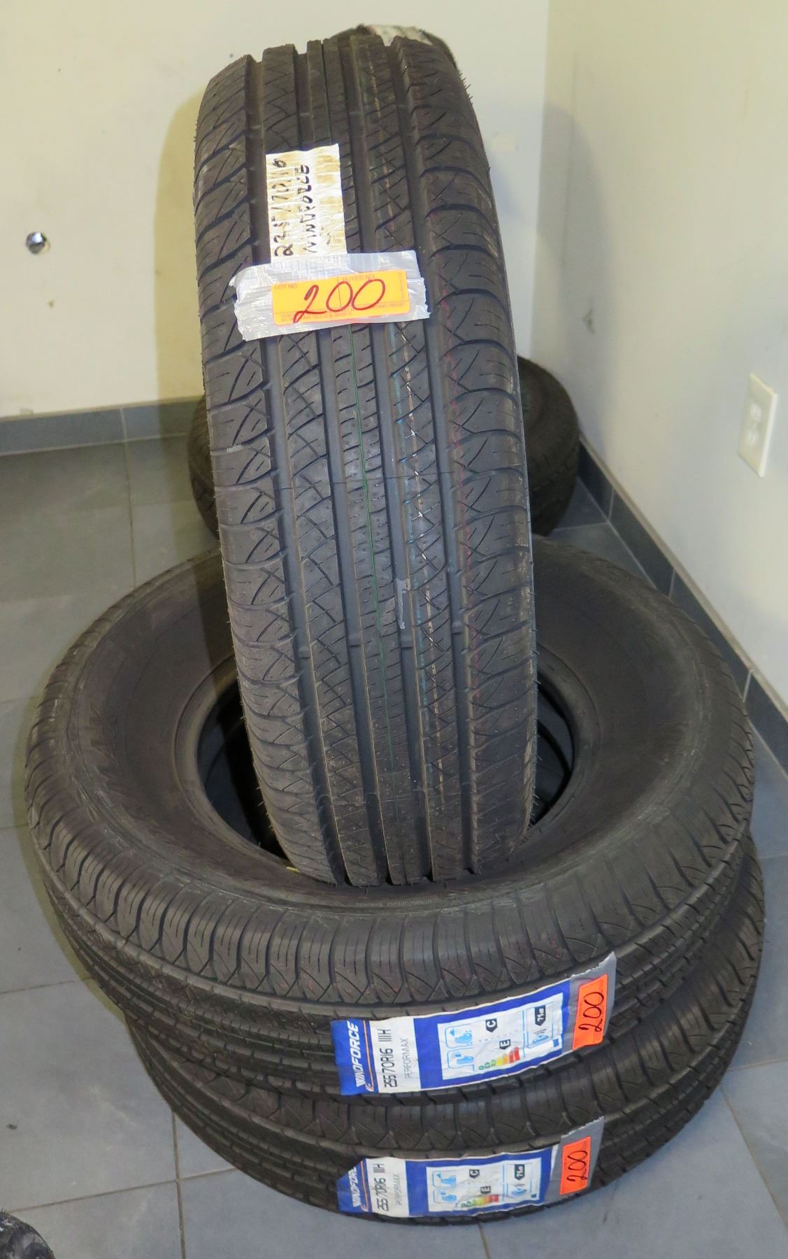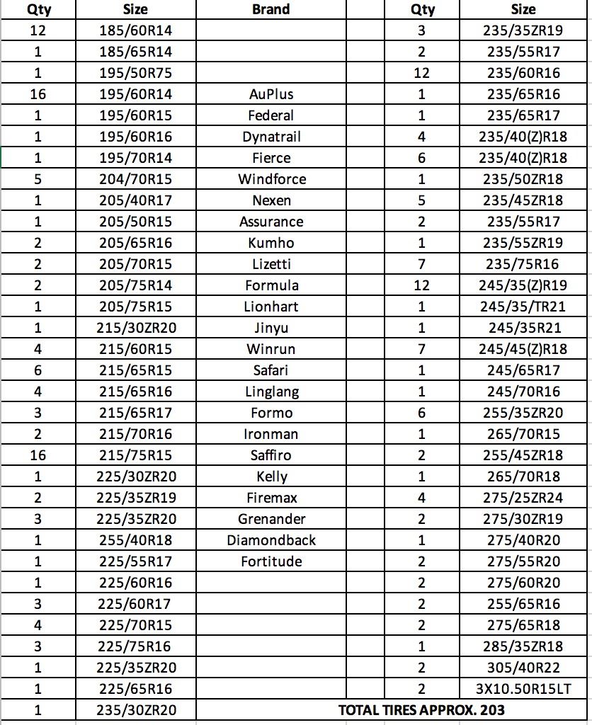 Approx 200 Tires! All New ! Various Sizes! (See 3rd Photo For Tire Sizes)