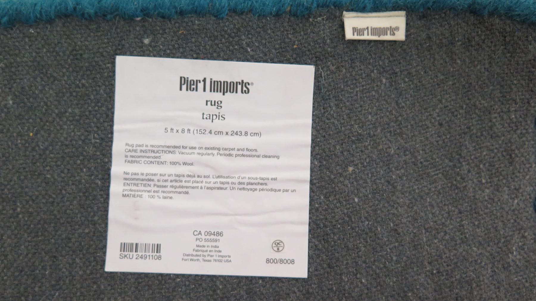 Area Rug: Blue w/White Accents, Pier 1, 5 ft. X 8ft. 100% Wool, Minor Signs of Wear