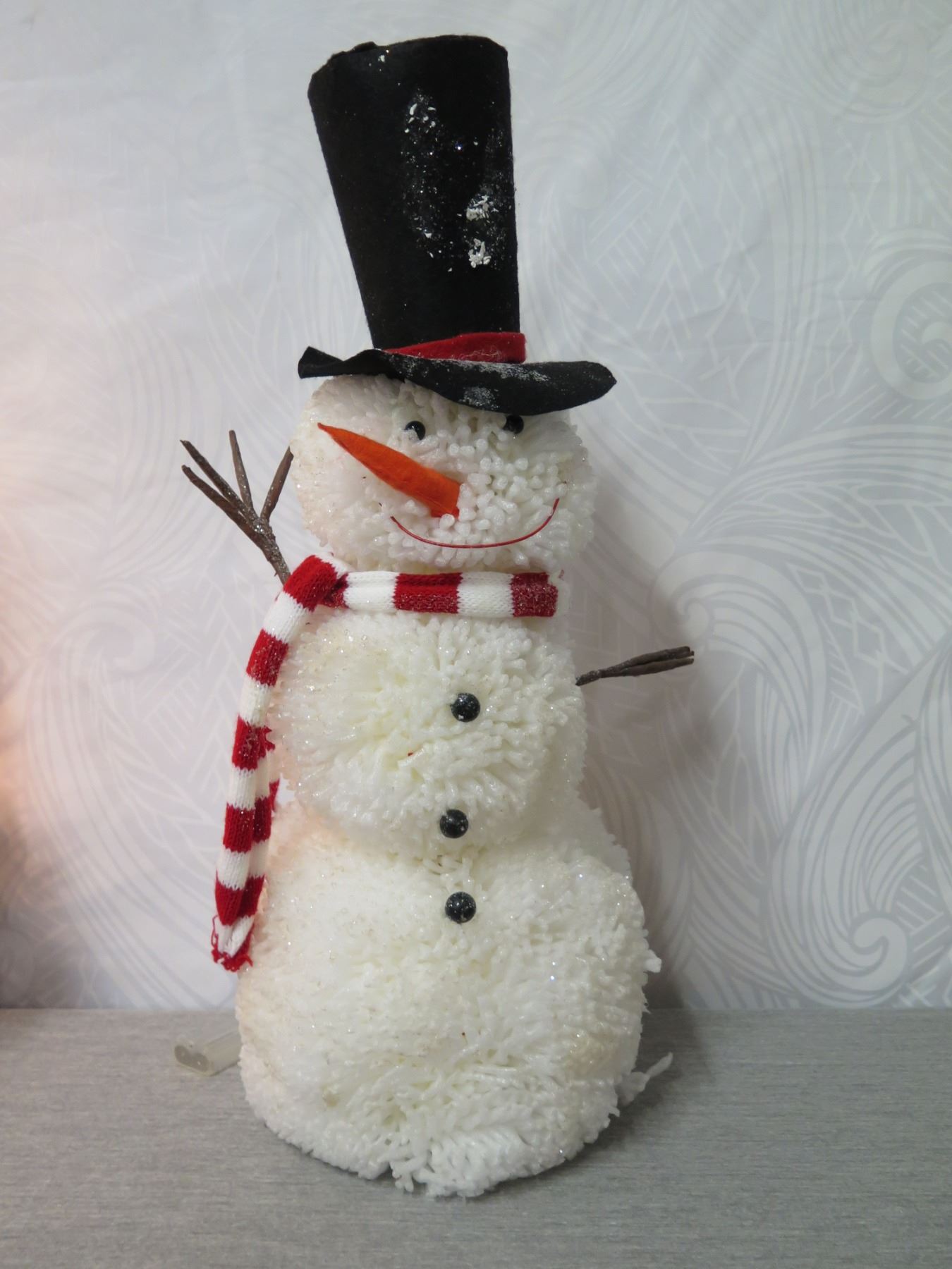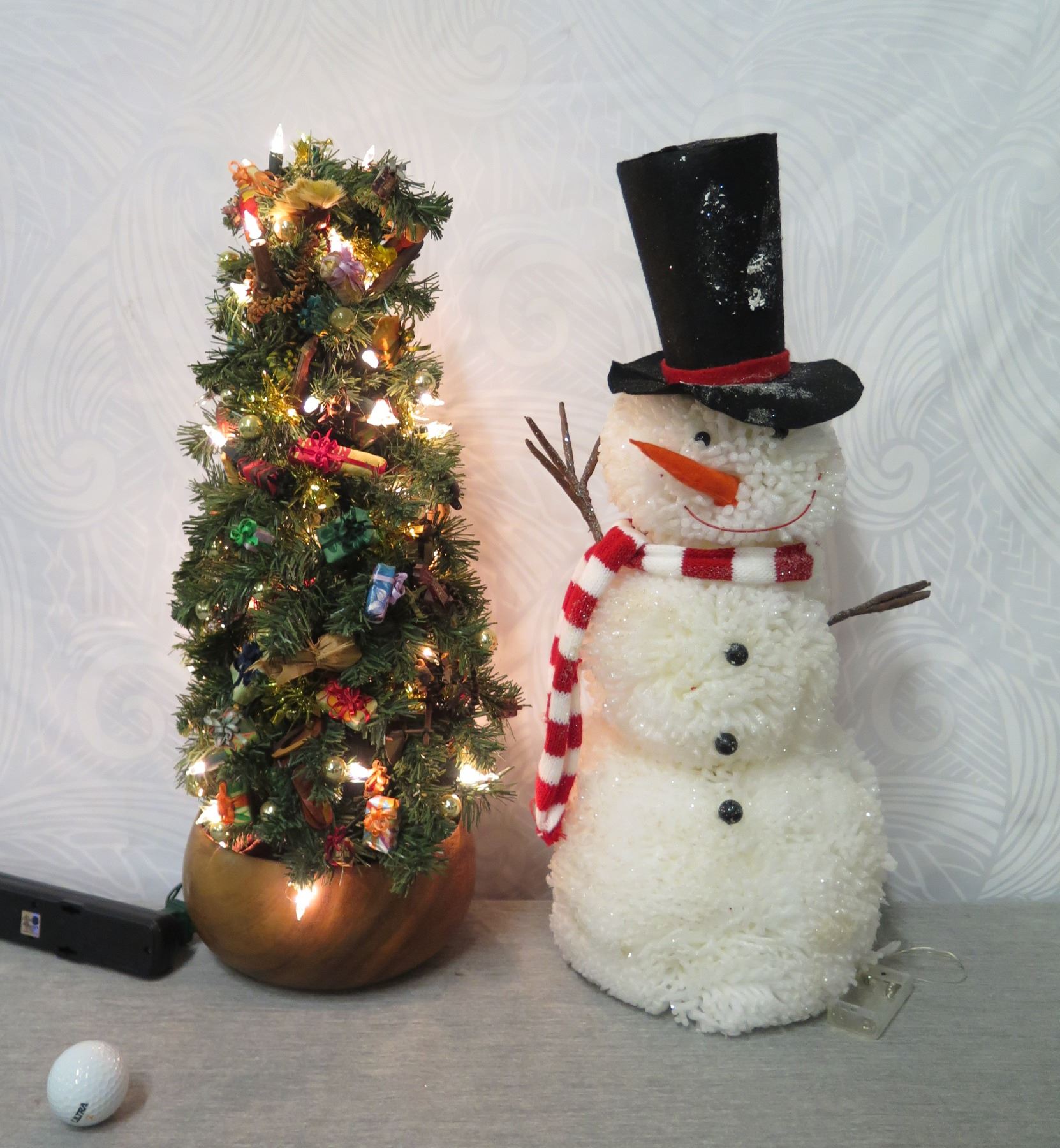 Artificial Illuminated Tree in Wood Bowl 'Mele's Mood' #9206 & Plush Snowman