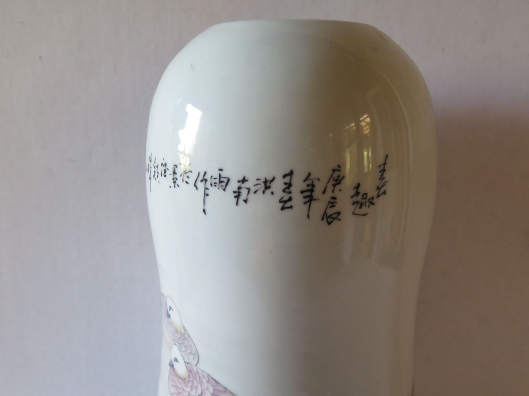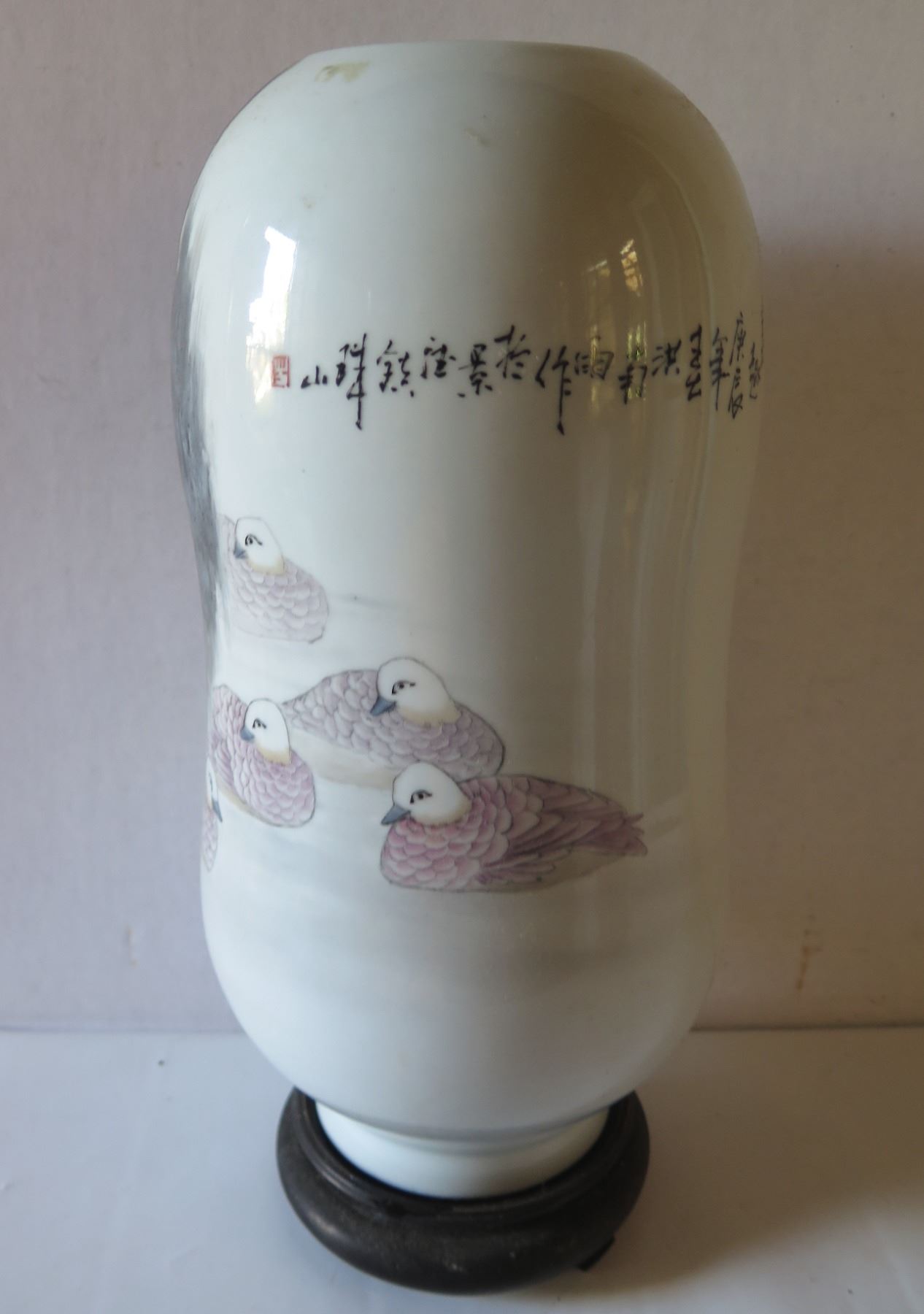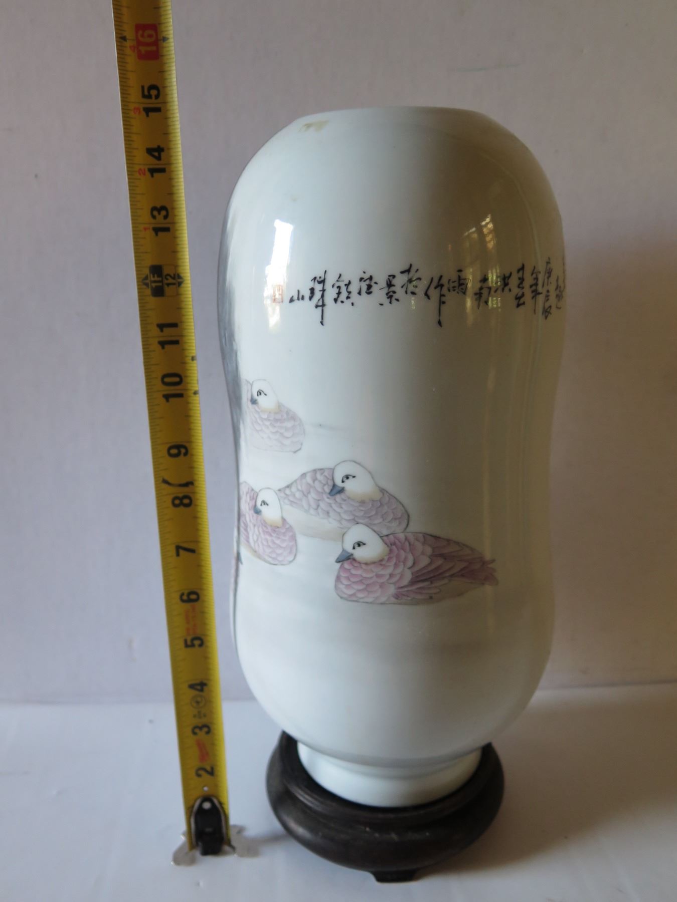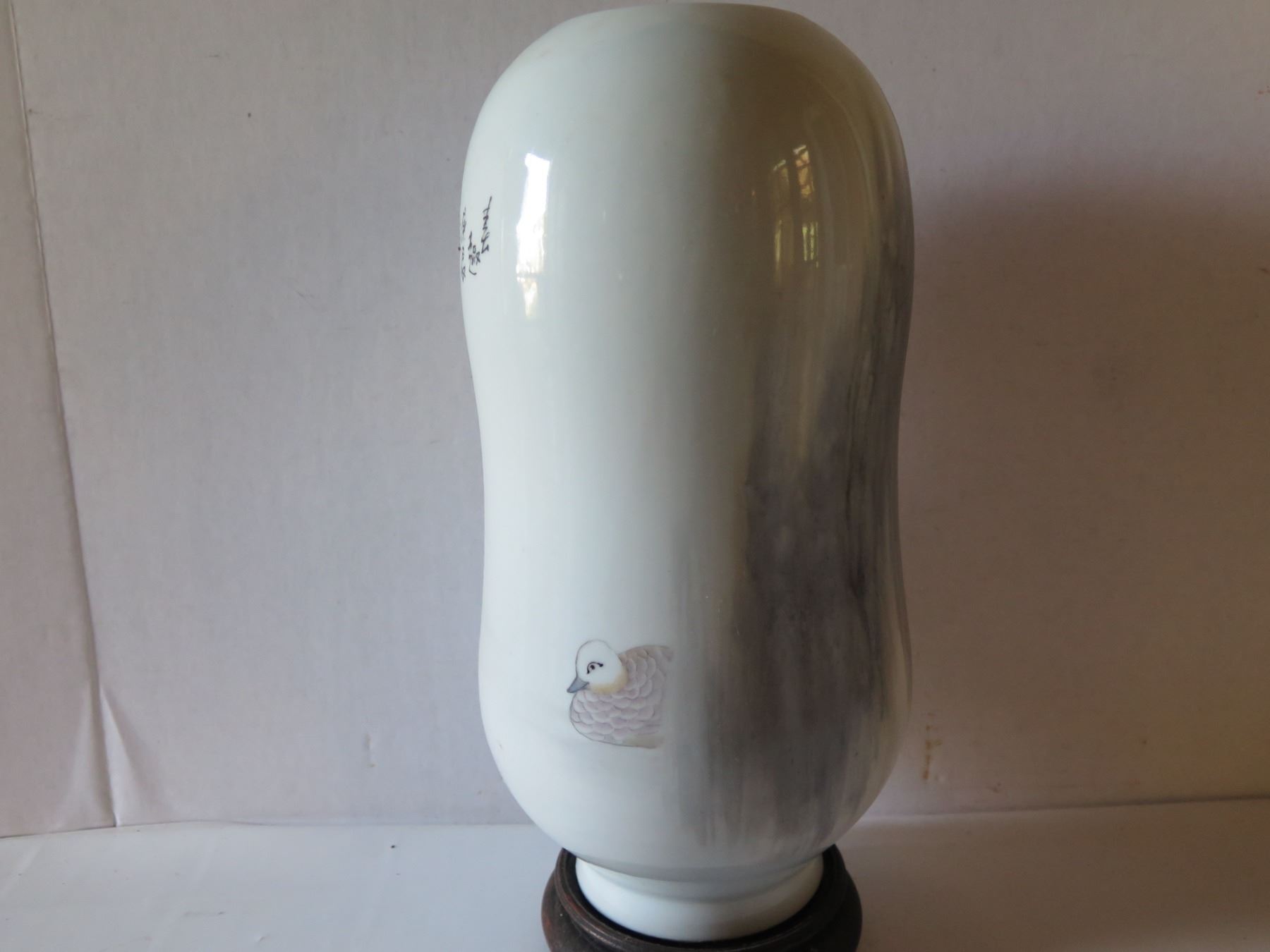 Asian Porcelain Vase on Wooden Stand w/Bird Motif/Chinese Characters Maker's Mark 15" Tall