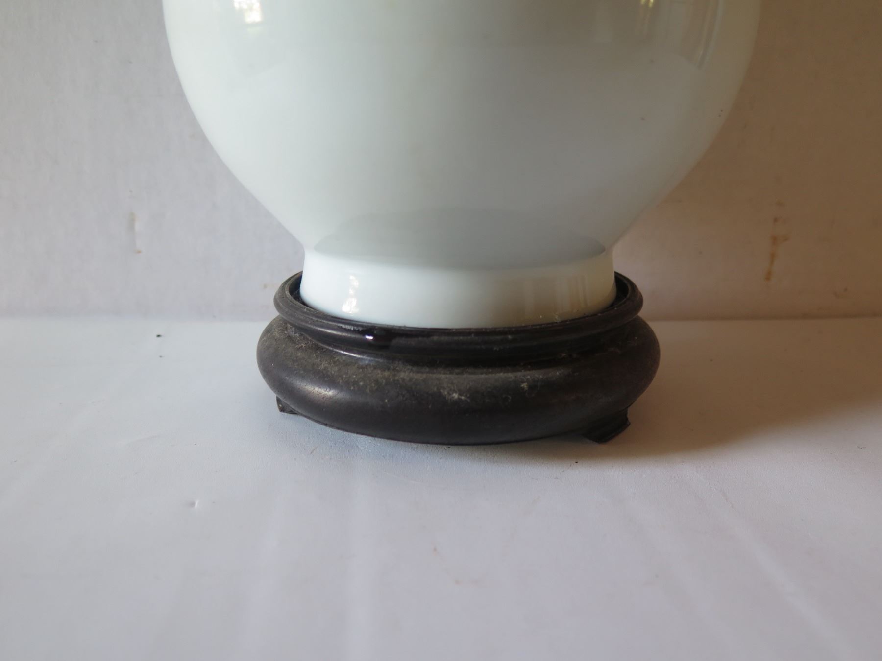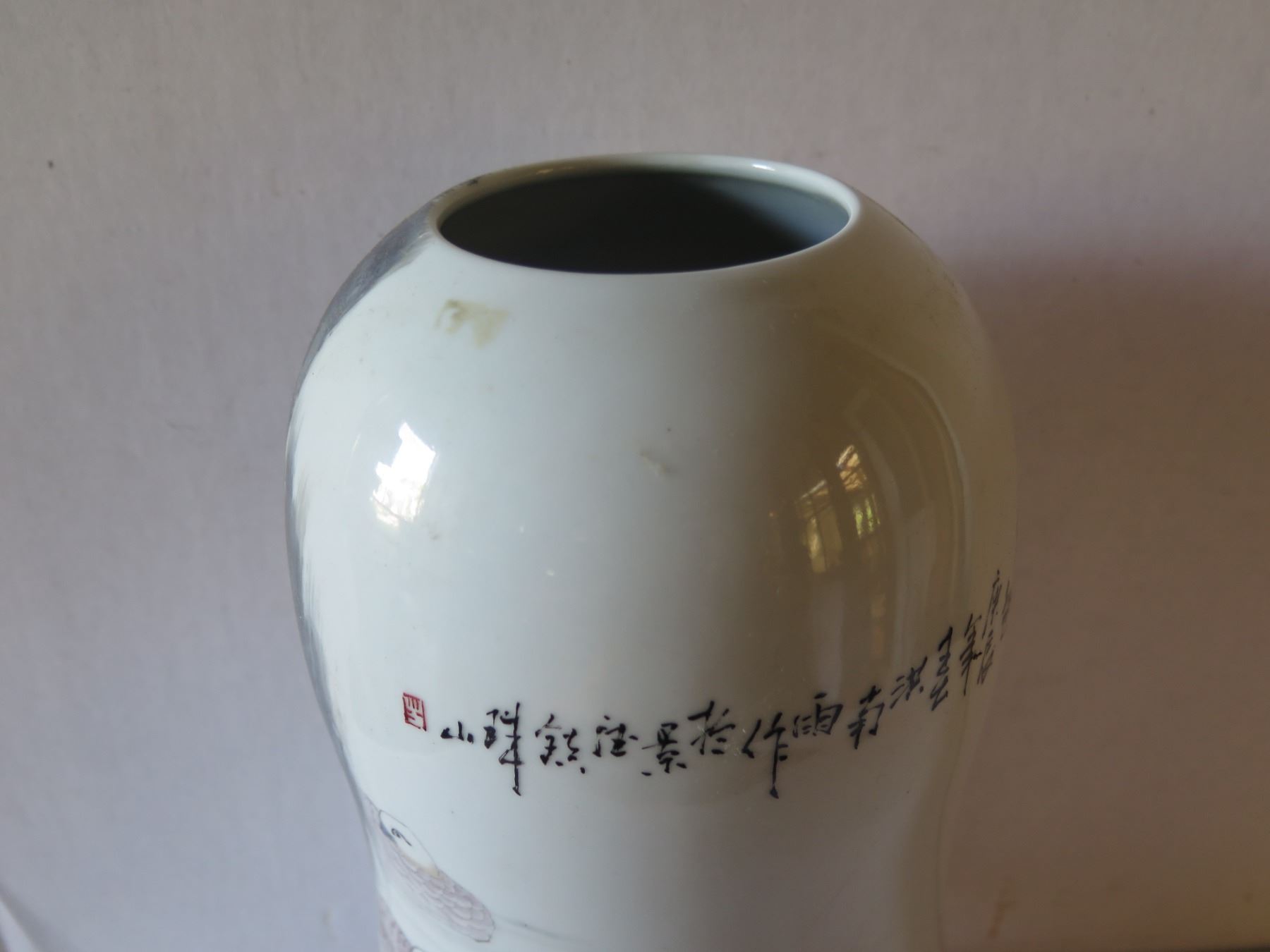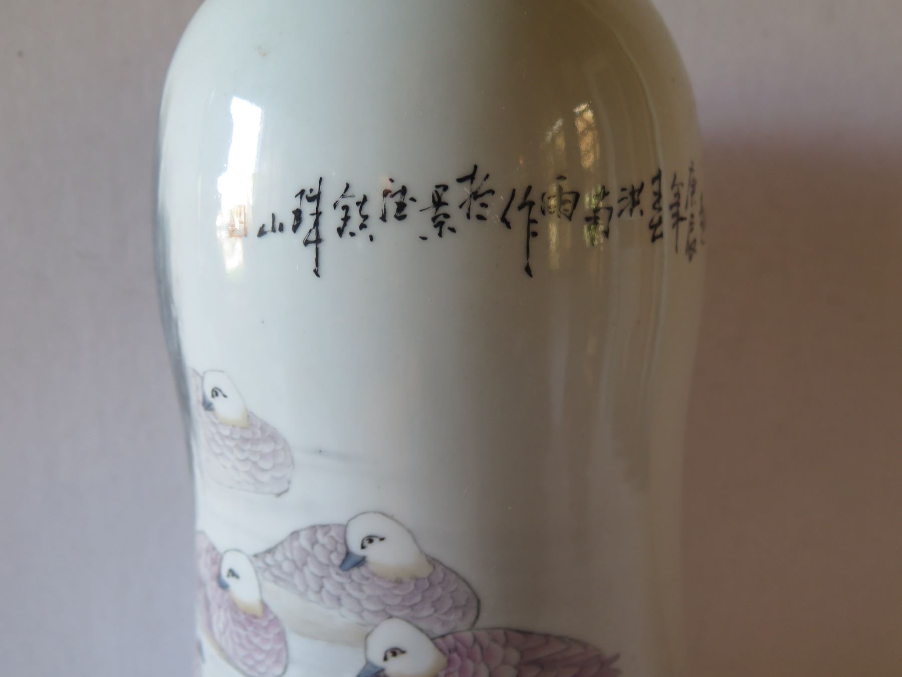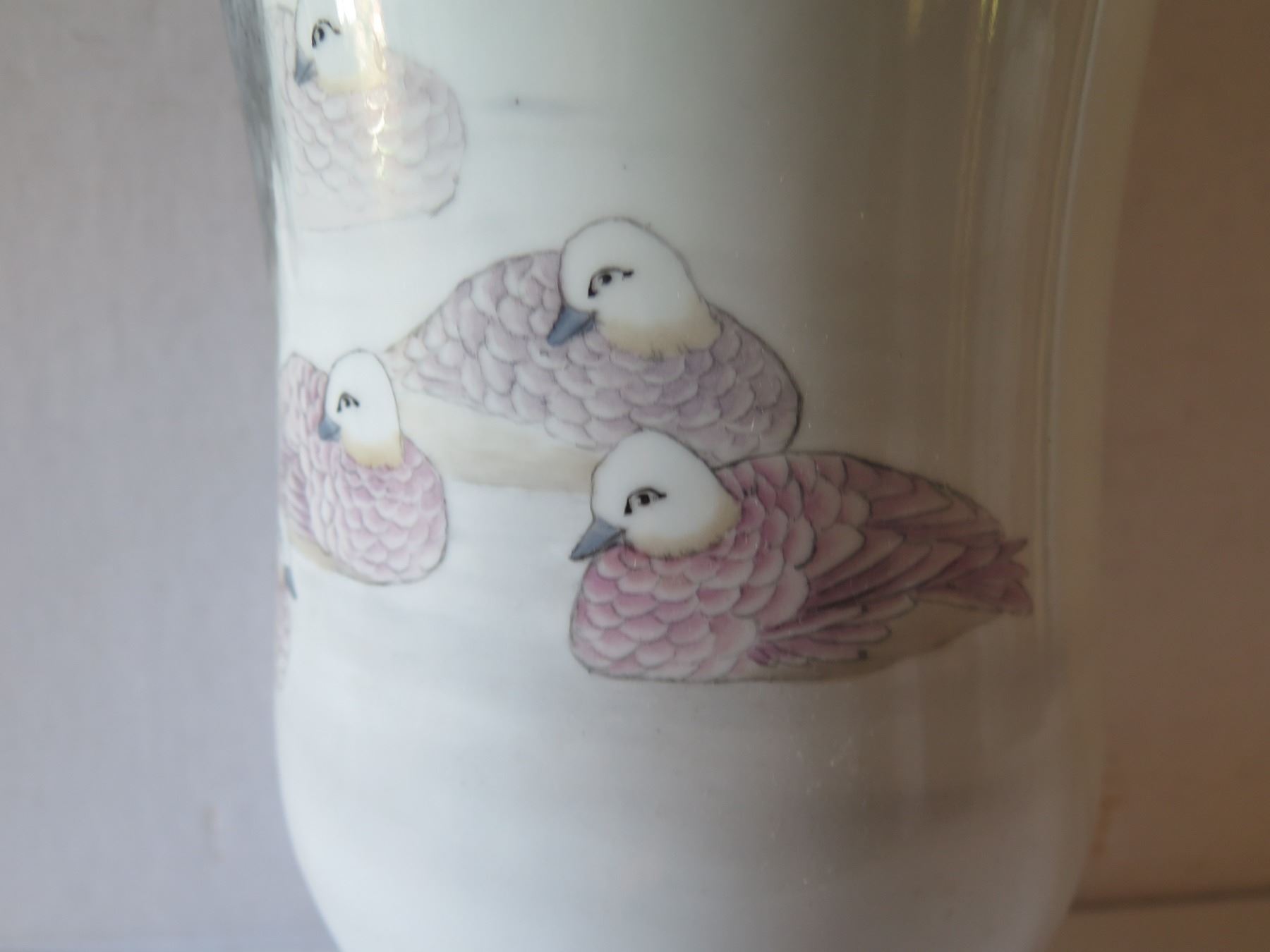 Asian Porcelain Vase on Wooden Stand w/Bird Motif/Chinese Characters Maker's Mark 15" Tall