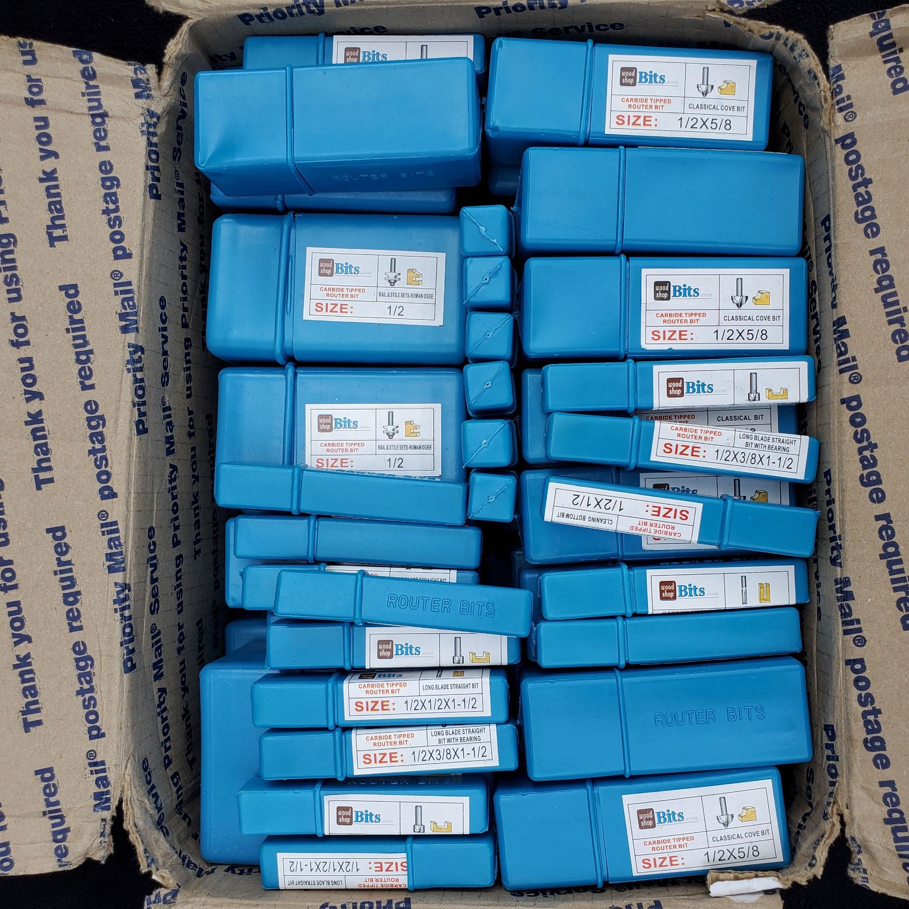 (7) 1/2 x 7/16 Bowl & Tray Bits, (5) 1/2 x1/2 Cleaning Bottom Bits, (6) 1/2 x 1/2 x 1-1/2 Long Blade Straight Bits, (6) 1/2 x 3/8 x 1-1/2 Long Blade Straight Bits with Bearings, (3) 1/2 x 1-1/4 Traditional Bits, (6) 1/2 Rail & Stile Sets- Roman, (6) 1/2 x 3/4 45* Chamfer Bits, (10) 1/2 x 1/2 Classical Bits, (8) 1/2 x 5/8 Classical Cove Bits, Tenryu SL-18552 Silencer Carbide Tipped Saw Blade for Wood 71/4" X 52T X 5/8"; Tenryu SL-25572 Silencer 10" 72 Teeth Saw Blade for Wood. Donated By: Woodshopbits,Tenryu America, Inc.