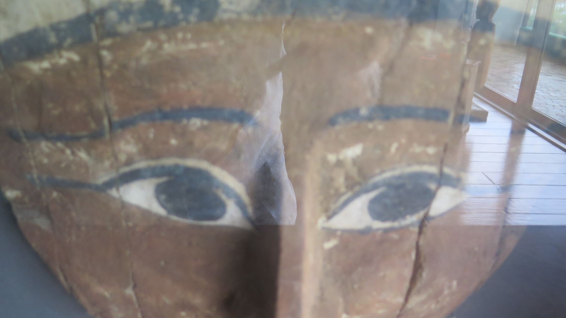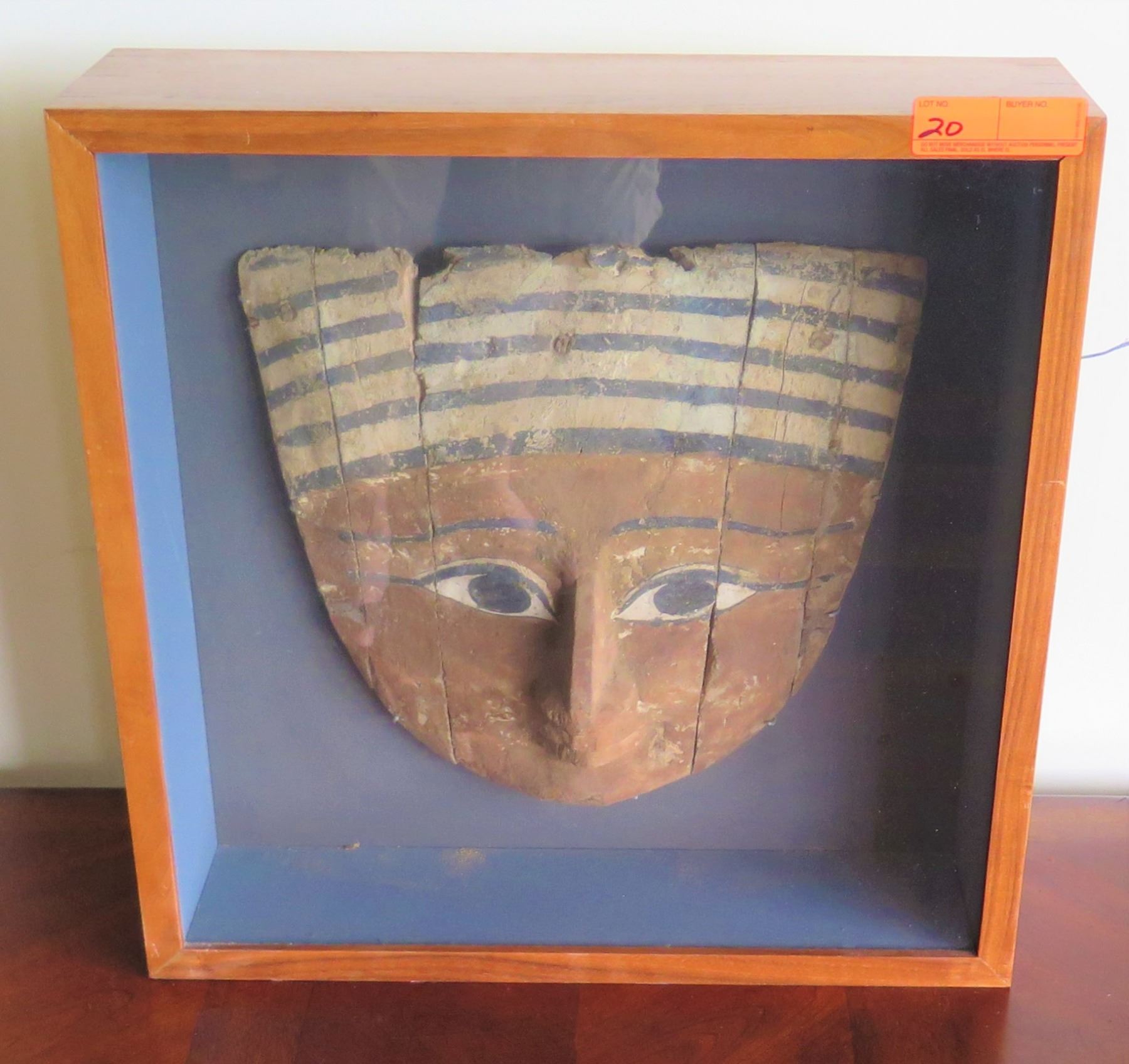 Authentic Wood Mummy Mask from Sarcophagus, Circa 5-3rd Century B.C.E, Ptolemaic Period, 14.5" H, Polychromed. Comes with Certificate of Authenticity. Custom made Plexiglass case. Condition problems. Appraised at $3500 by Harlan Berk Ltd.